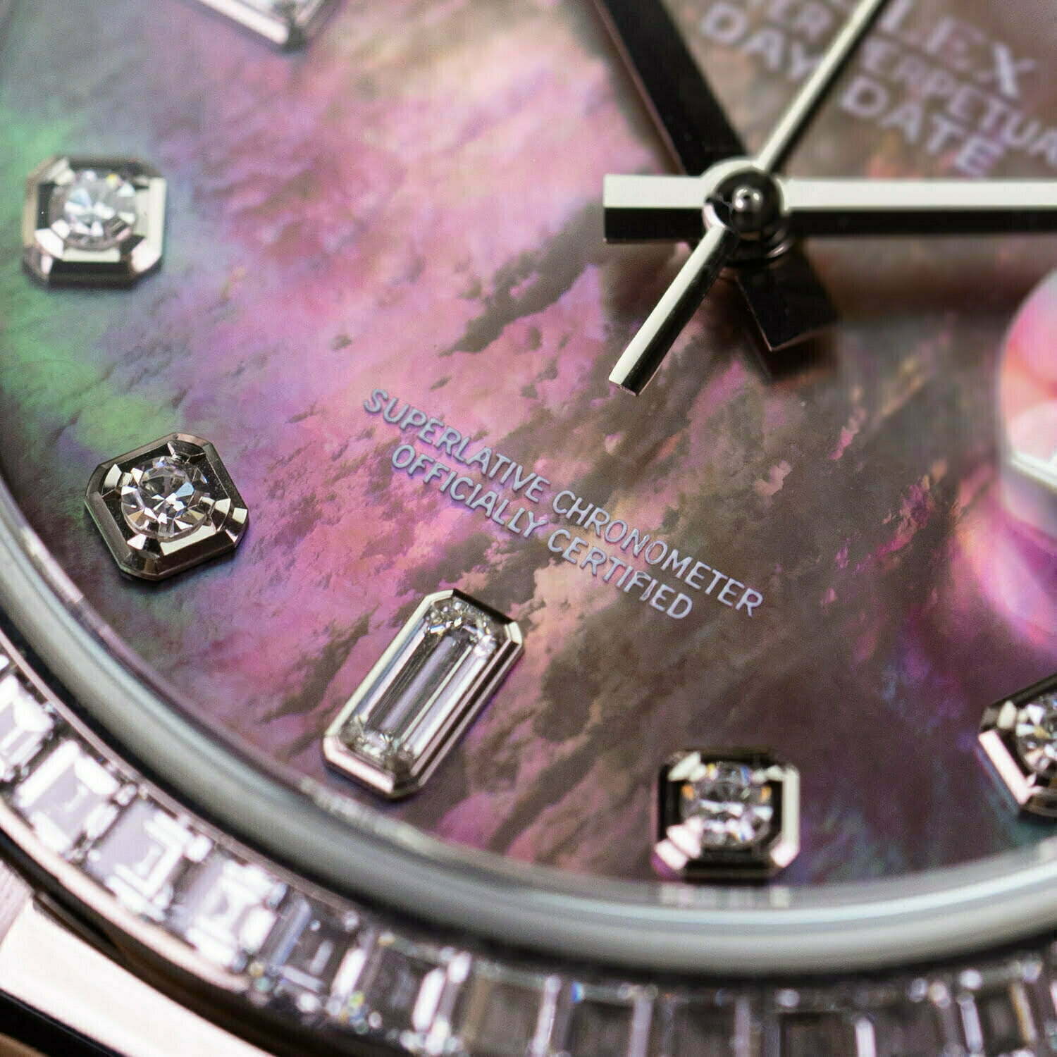 In keeping with the precious looks of the mother of pearl, the dial features factory-set brilliant-cut diamond indices interspersed with baguette-cut diamonds at the 6 and 9 o’clock positions. In keeping with Rolex tradition, the non-lume dial is paired with a closed (non-lume) 18k white gold handset.