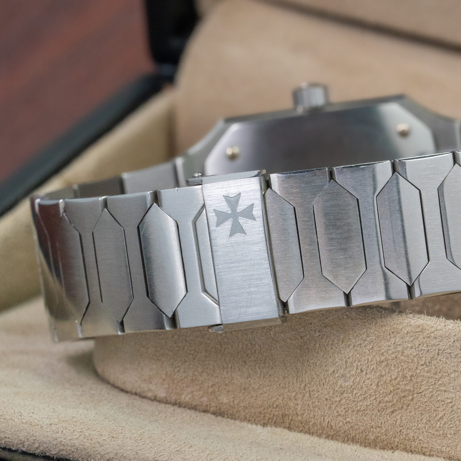 This is Vacheron’s 222—but not the one most people picture. The 46004 takes the integrated sports watch formula and flips the script. Out go the soft curves and flowing lines of the original. In their place: sharp geometry, a square case, and bevels that look like they were drawn with a blade. It’s colder, more focused, and unapologetically distinct. Released in the late '80s, it reflects a brand willing to challenge its own legacy rather than repeat it.