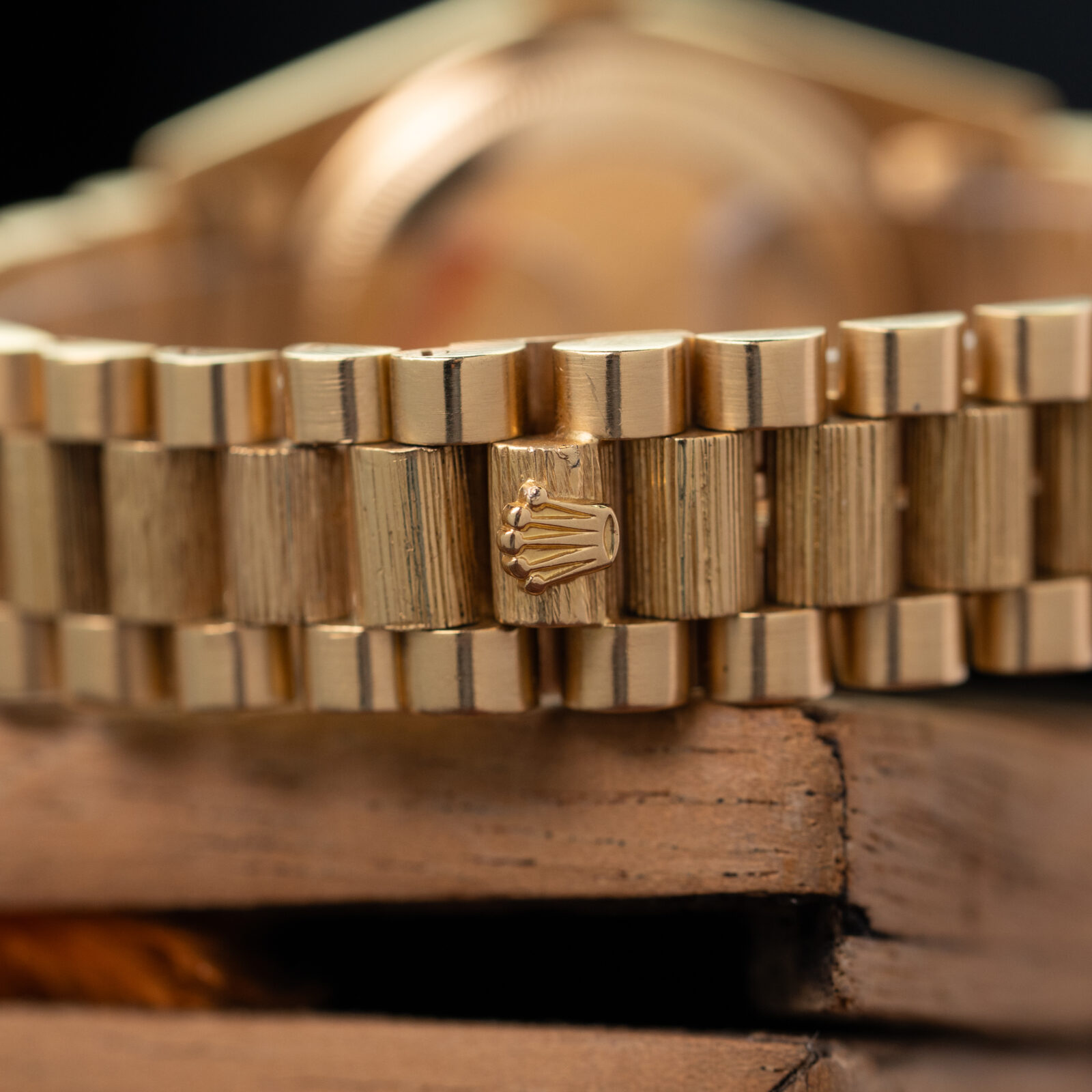 The case remains sharp, with the bark texture intact across bezel and bracelet, and the President bracelet shows some minimal stretch, entirely consistent with careful wear over time and appropriate for a watch of this age.