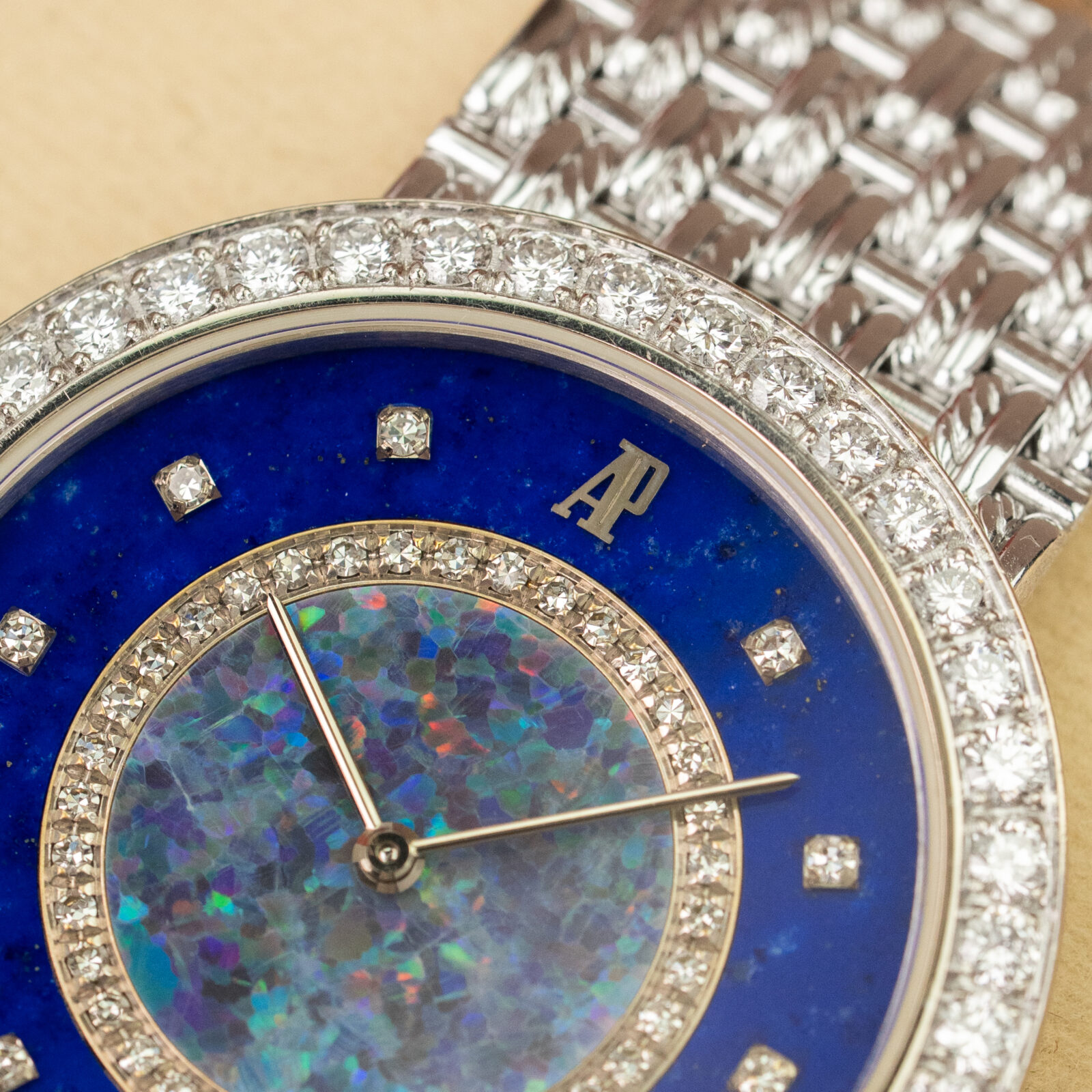 The 34mm case showcases harmonious proportions, with a gently concealed crown tucked beneath the glittering bezel. Beyond the diamond-set hour markers and bezel, an additional ring of diamonds elegantly divides the dial into two sections. The central portion shimmers with a captivating opal, while the outer section is composed of deep blue lapis lazuli. The opal, seldom seen in watchmaking, catches the light in a truly mesmerizing way. An applied AP logo at 12 o’clock and slender baton hands complete this refined composition.