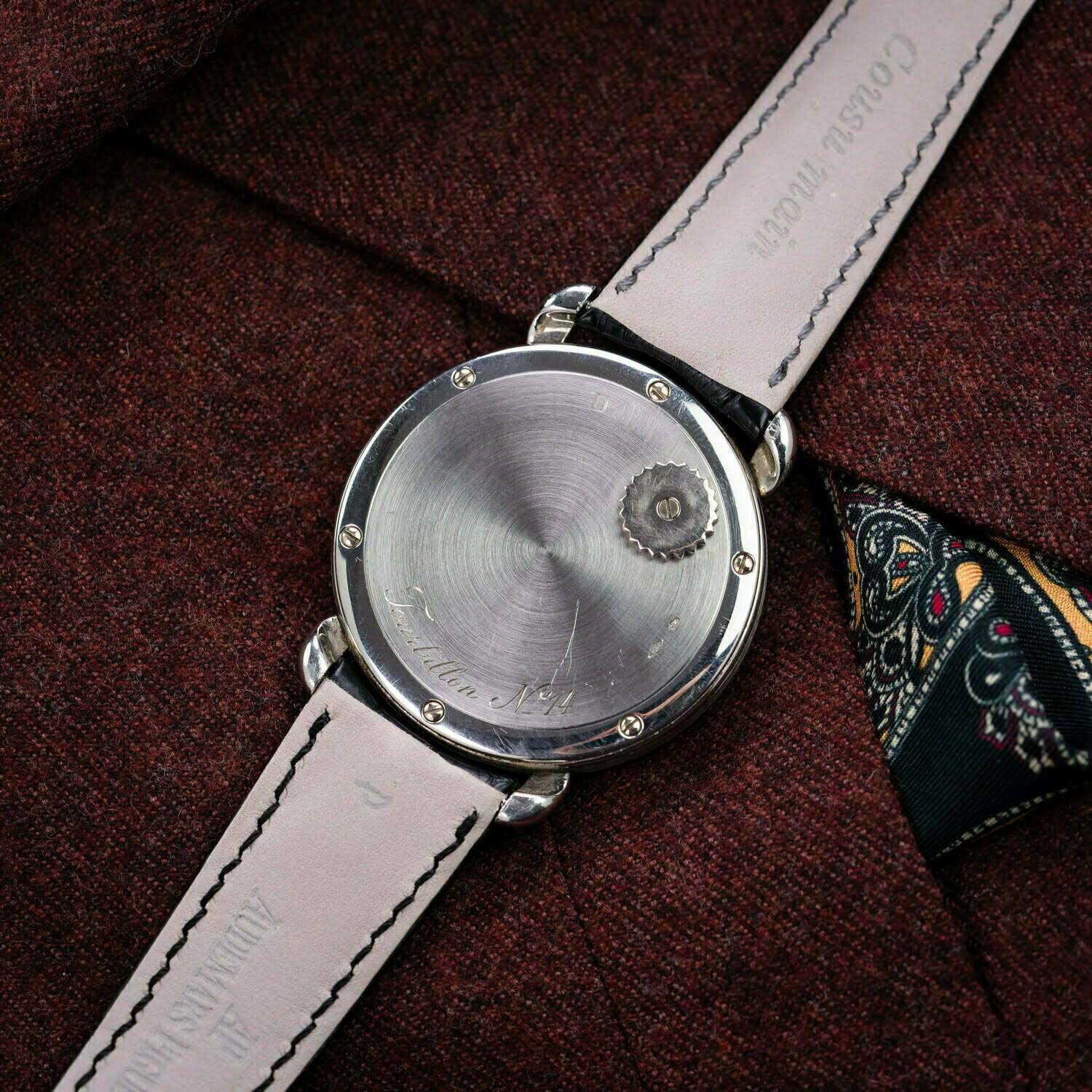 This 25718 from the late 1990s is the rare platinum variant. The large case features a bold convex bezel and classically-minded tear drop lugs. By moving the crown from its traditional placement on the left hand side of the case to the case back, the clean lines of the watch are left uninterrupted.