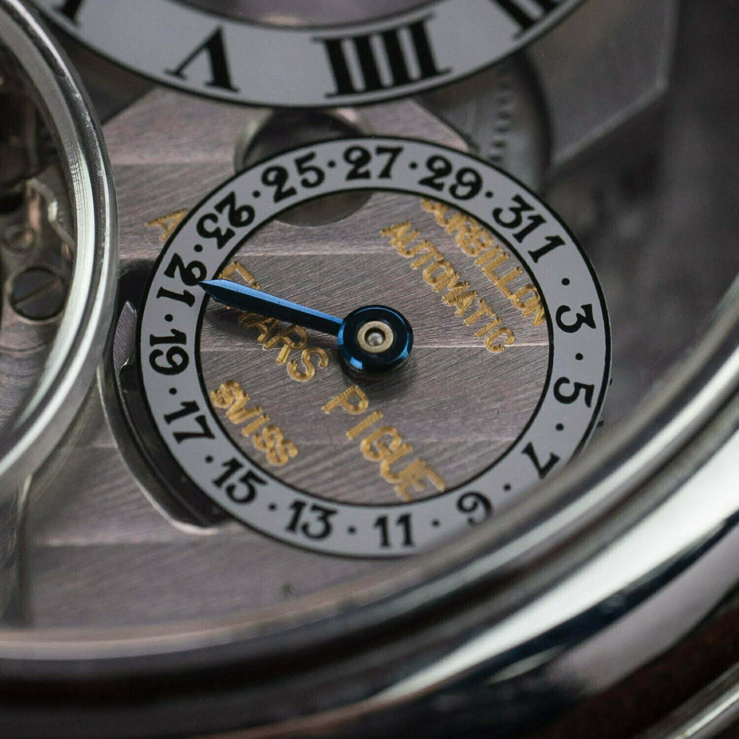 While most executions of the reference 25718 feature classic ivory dials, this 25718PT comes with a see-through sapphire dial with three sub-registers. The large sub-register at the 12 o’clock position features lovely painted Roman numerals and blackened leaf hands to display the time, while the smaller registers at 3 and 9 incorporate the power reserved and date functions.