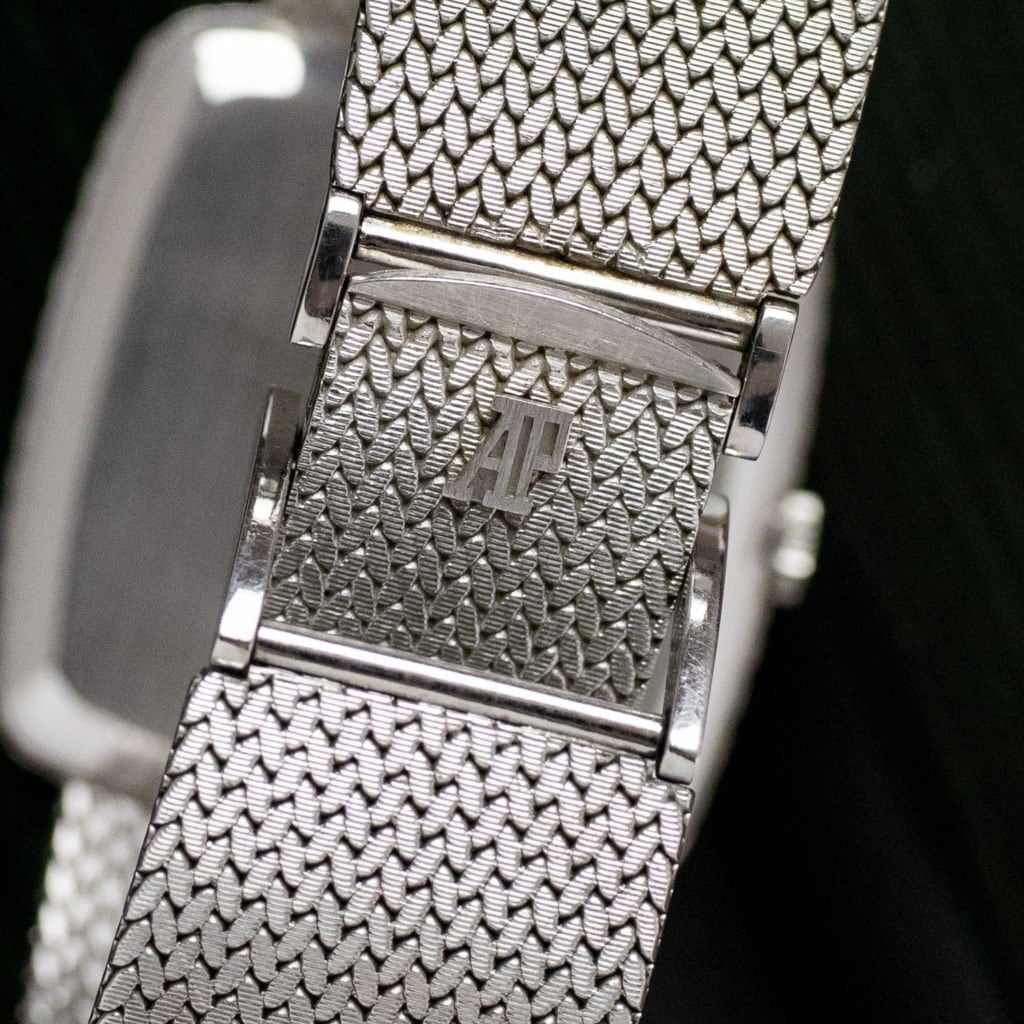 People often forget Audemars Piguet was making watches long before the Royal Oak ever came to life. In fact, the manufacture has a distinguished history of producing exquisite dress watches in precious metals.Round, yellow gold, and a leather strap is usually what comes to mind when we think of dress watches. Not this one though. This beauty from 1978 features an ultra-thin TV-shaped rectangular case in 18k white gold with a positively decadent integrated 18k white-gold braided bracelet. The braided detailing of the bracelet is also incorporated on the bezel surface, giving the watch a luxurious feel.The anthracite dial color has a wonderfully minimalist look. The large grey surface is only broken up by the applied 18k white-gold "AP"-logo at the 12 o’clock position, the white printed “AUDEMARS PIGUET"-signature, and a small white “Swiss” indication at 6 o’clock. The cool look of the dial comes full circle with the understated polished thin sword hands, also executed in 18k white gold.The ultra-thin manual winding caliber has just been fully serviced and the watch comes with its original box and papers.
