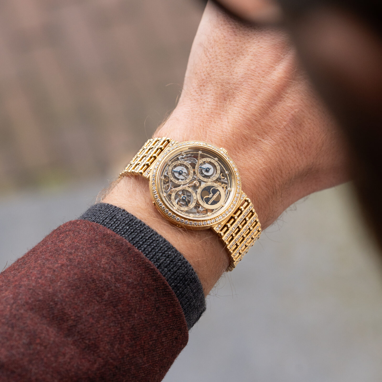 The 5582 is the epitome of a precious and exquisite automatic perpetual calendar. It is executed in a slim 18k yellow-gold case, measuring a classic 36 mm. Not only the bezel sports sparkles, so does the sumptuous factory-set integrated bracelet consisting of alternating diamond set bars and strings of gold beads. A very intricate construction that has removable links, in order to give it the desired circumference.