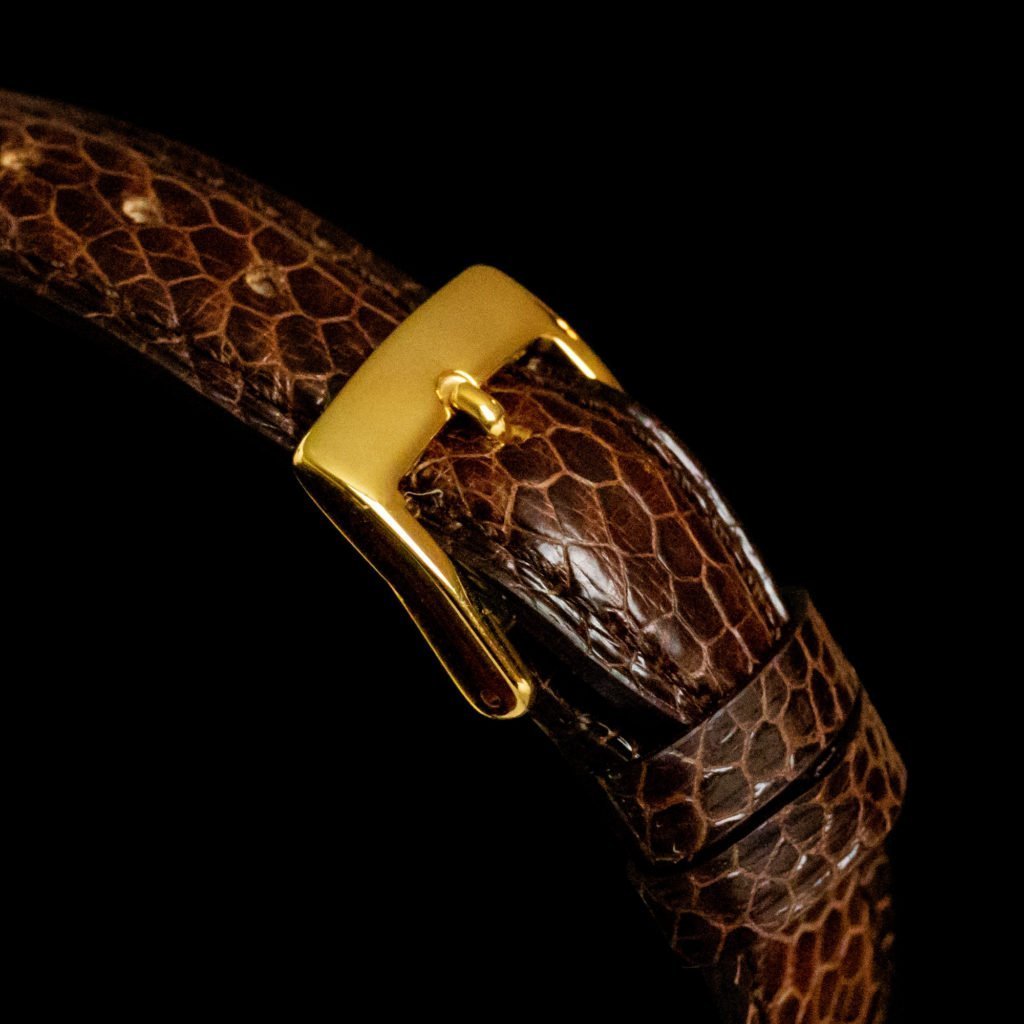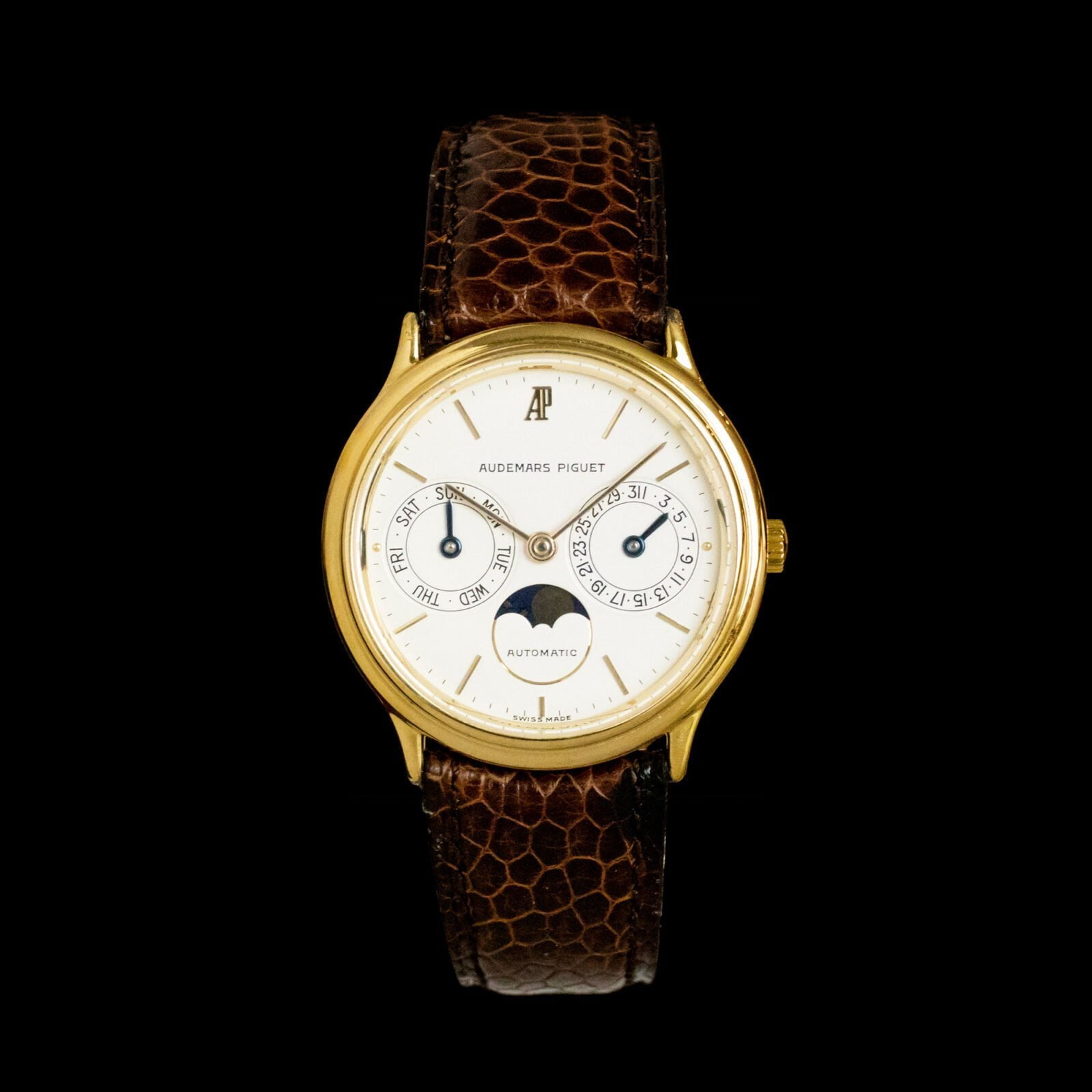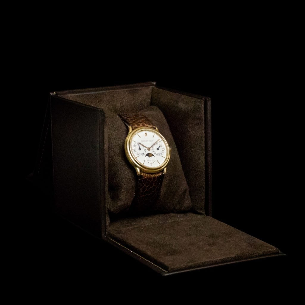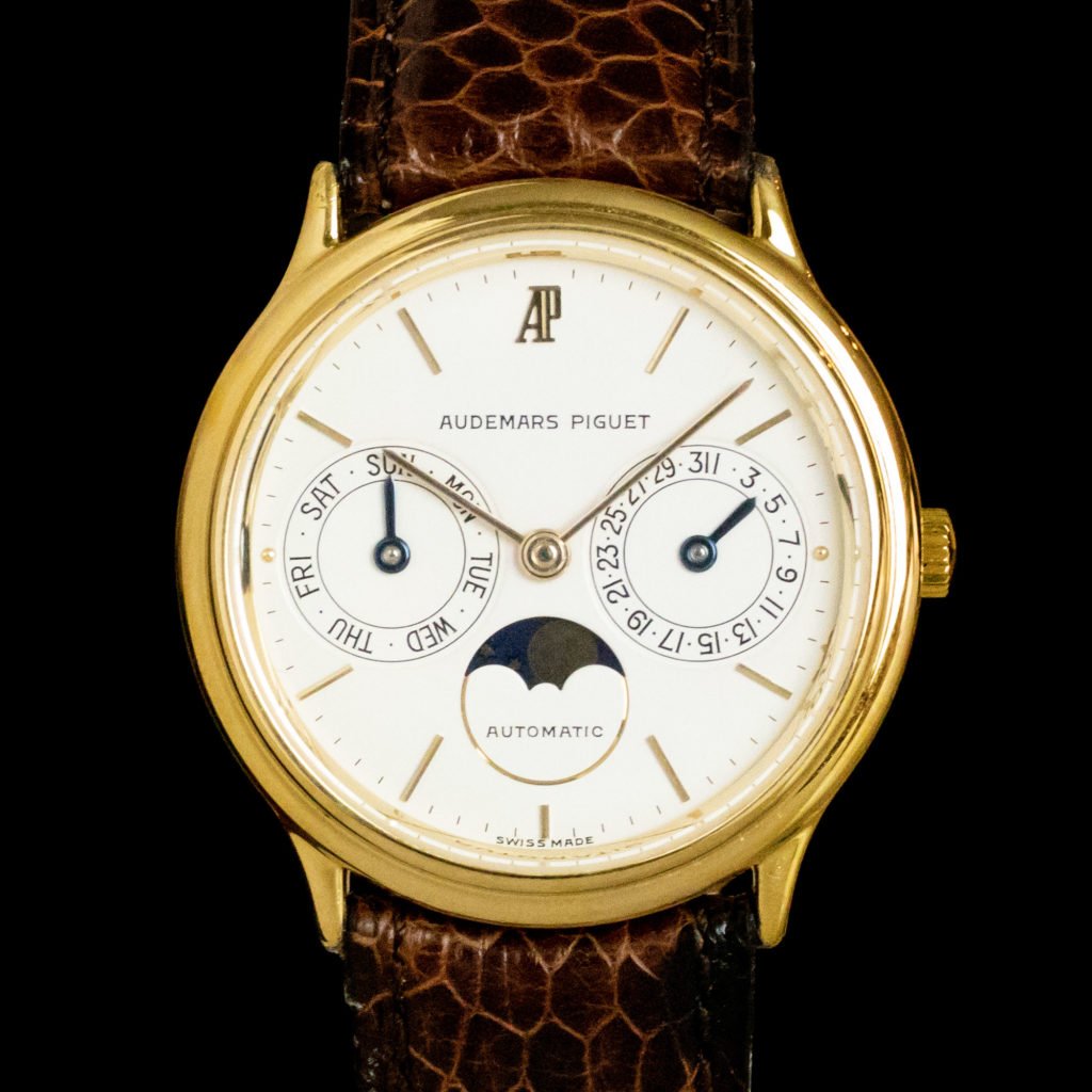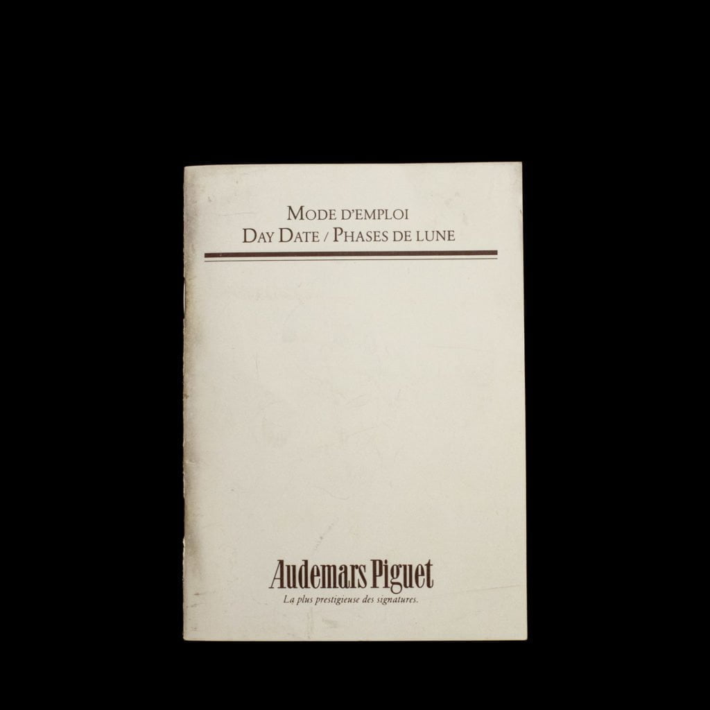 Because of Audemars Piguet's emphasis on the Royal Oak and this model's popularity, the brand's other watches are often overlooked. However, think about it: an 18k yellow-gold, classic dress watch with a day-date and moonphase function from one of the three biggest maisons d'horlogerie. This Audemars Piguet Day-Date Moonphase, with reference 25589 BA, dates back to 1980. It has the elegant case size of 33 mm by 8 mm, which makes it the perfect dress watch for the elegant and knowledgeable gentleman. Its design is simple but effective, which ensures the watch maintains good wrist presence. The white dial indicates the day of the week, the date and the moonphase and the watch has 18k yellow-gold applied baton hands and markers and blued-steel hands for the subdials. Luckily, for you (and us), this complicated watch comes with a user manual. It has a nice darkbrown-leather service box from Audemars Piguet.
