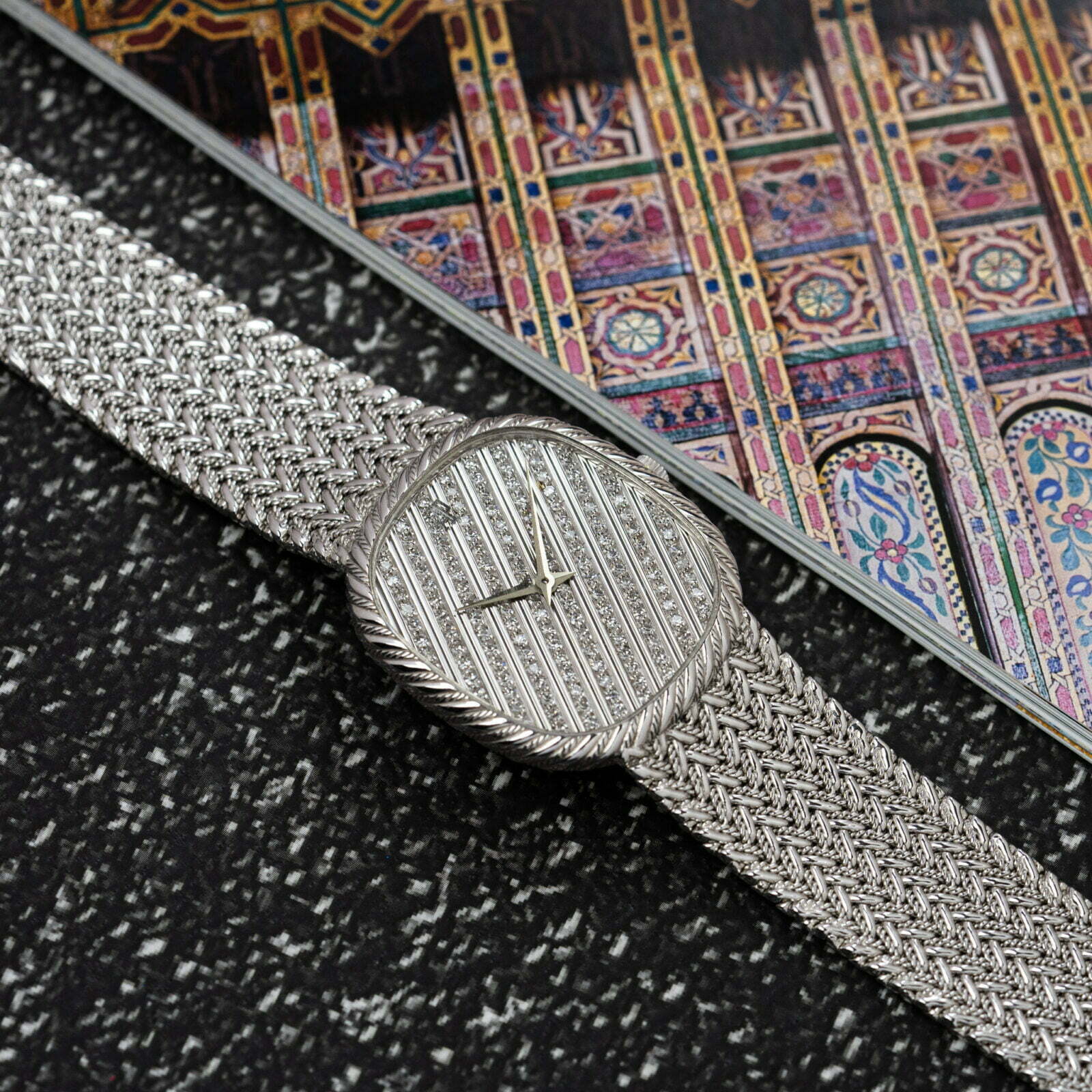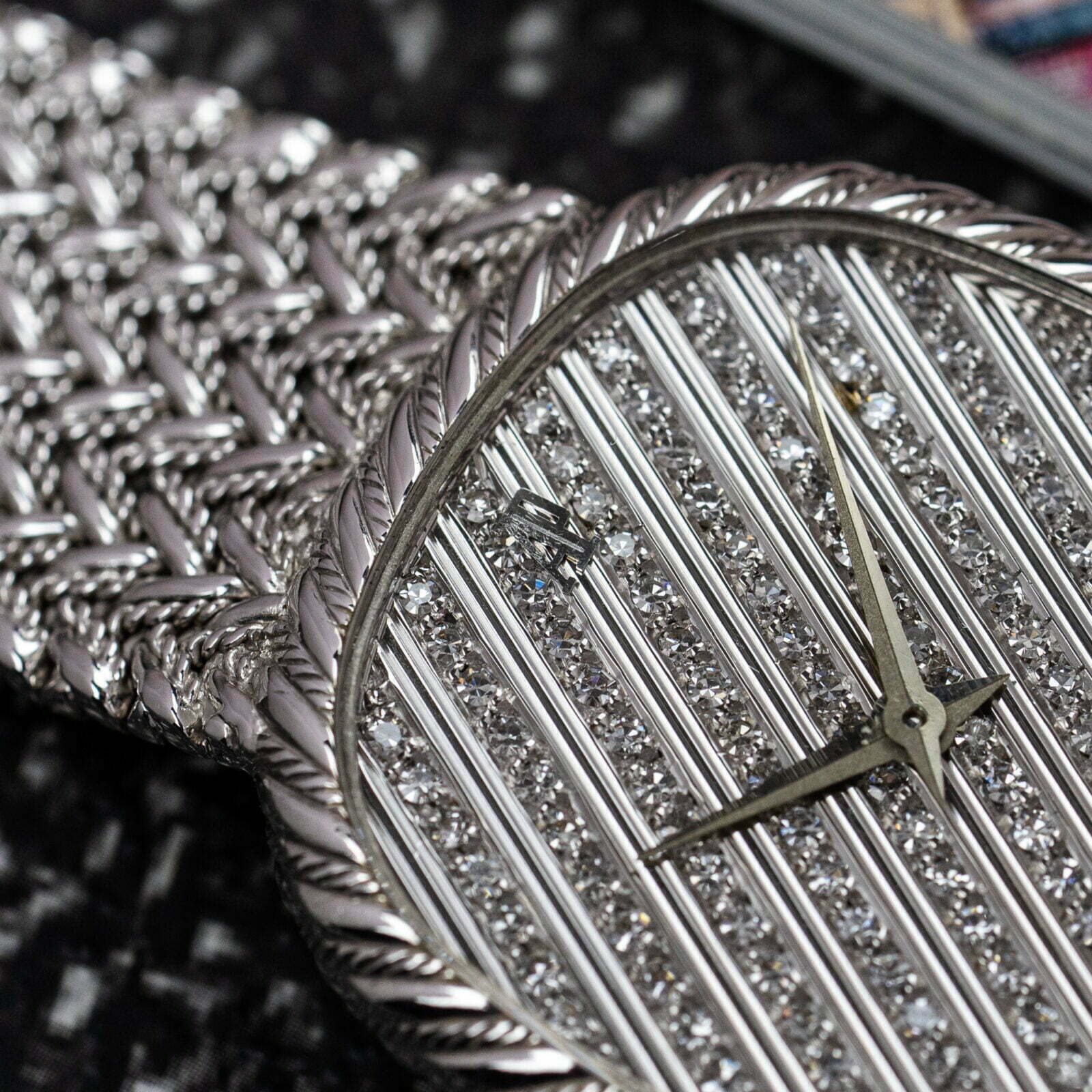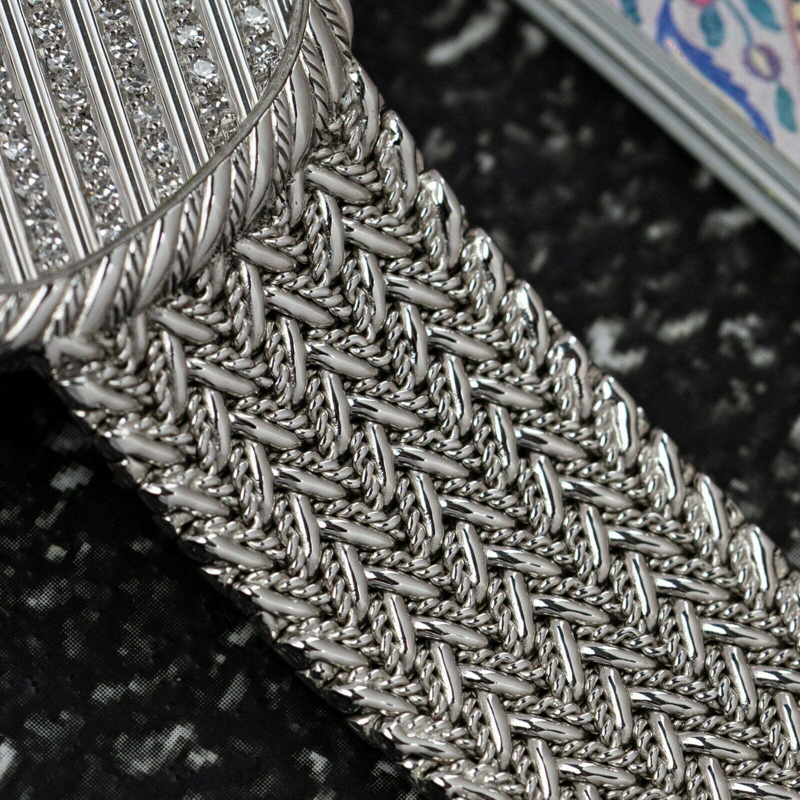 The 18k white gold watch features an oblong shaped case with soft rounded corners and an intricately decorated bezel. The fancy detailing of the bezel is complemented by a gorgeous integrated 18k white gold bracelet with a luxurious braid-style decoration. Due to the construction of the bracelet, made by renowned bracelet maker Jean-Pierre Ecoffey, the watch is suitable for a wrist size up to 17.5 cm.