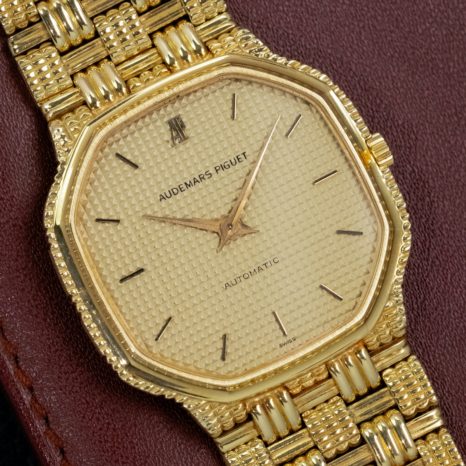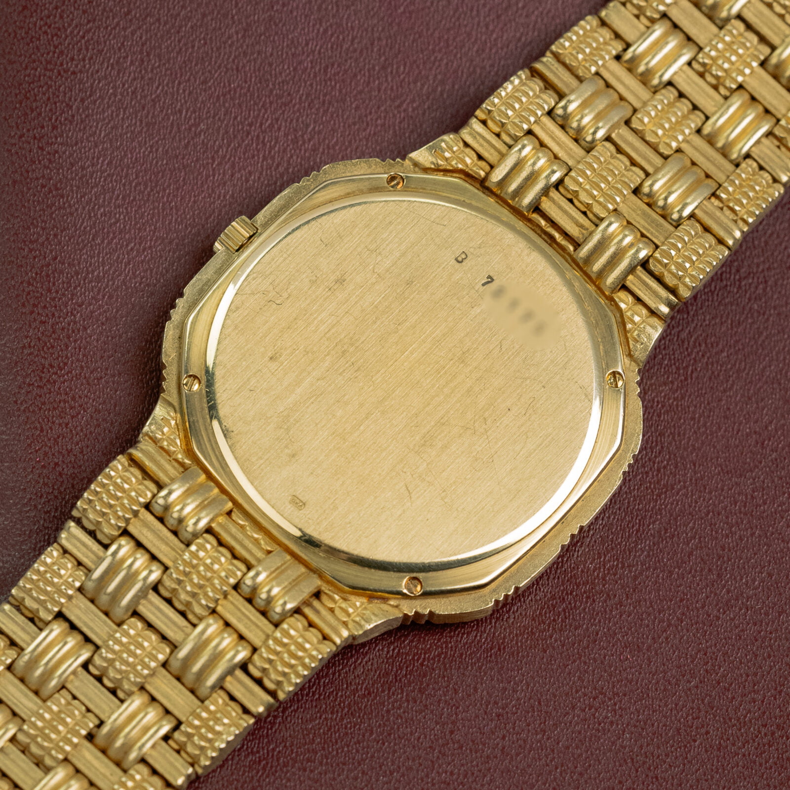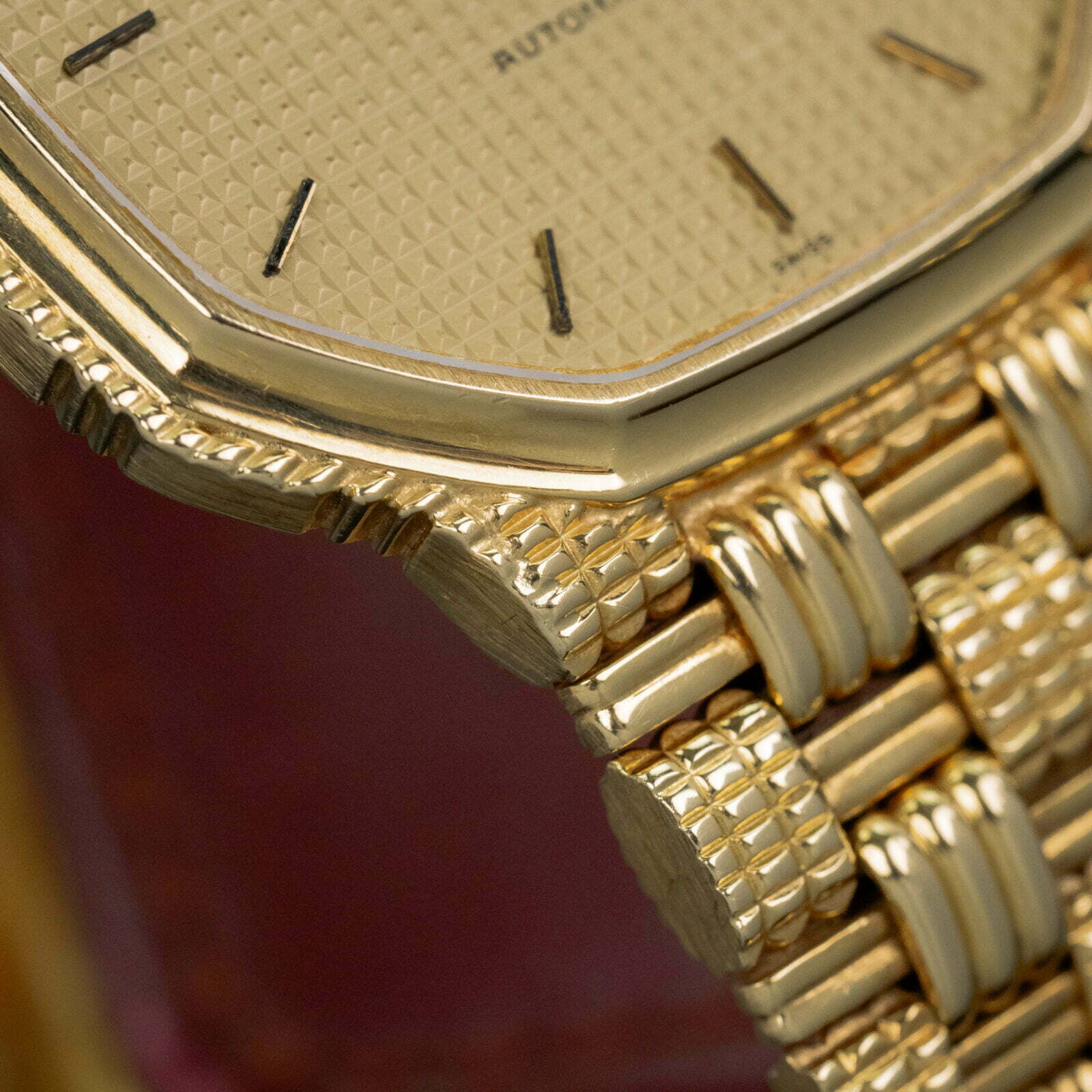 Here we have this beautiful 18K, Yellow Gold, Octagonal dress watch. It features a 33.5mm case with pyramid dial, that houses an automatic movement. The thickness of the case is something worth mentioning as it is a subtle 5.5mm which results in the watch sitting and feeling very smoothly around your wrist. The fact that the entire watch is made out of yellow gold, adds that extra hint of weight to it that simply lets you know you're carrying something with presence on your wrist.