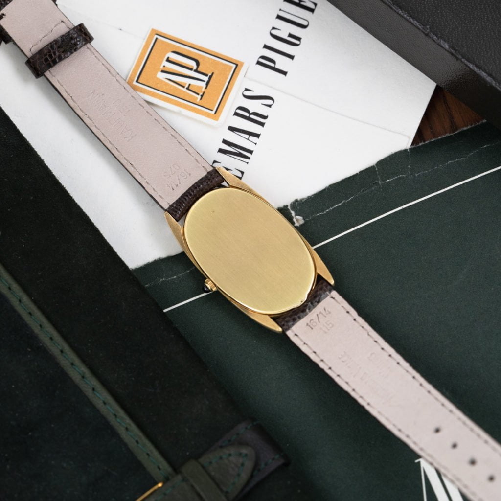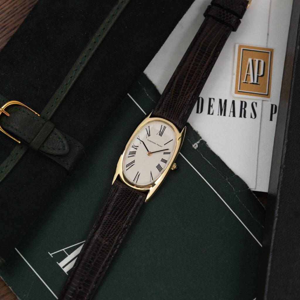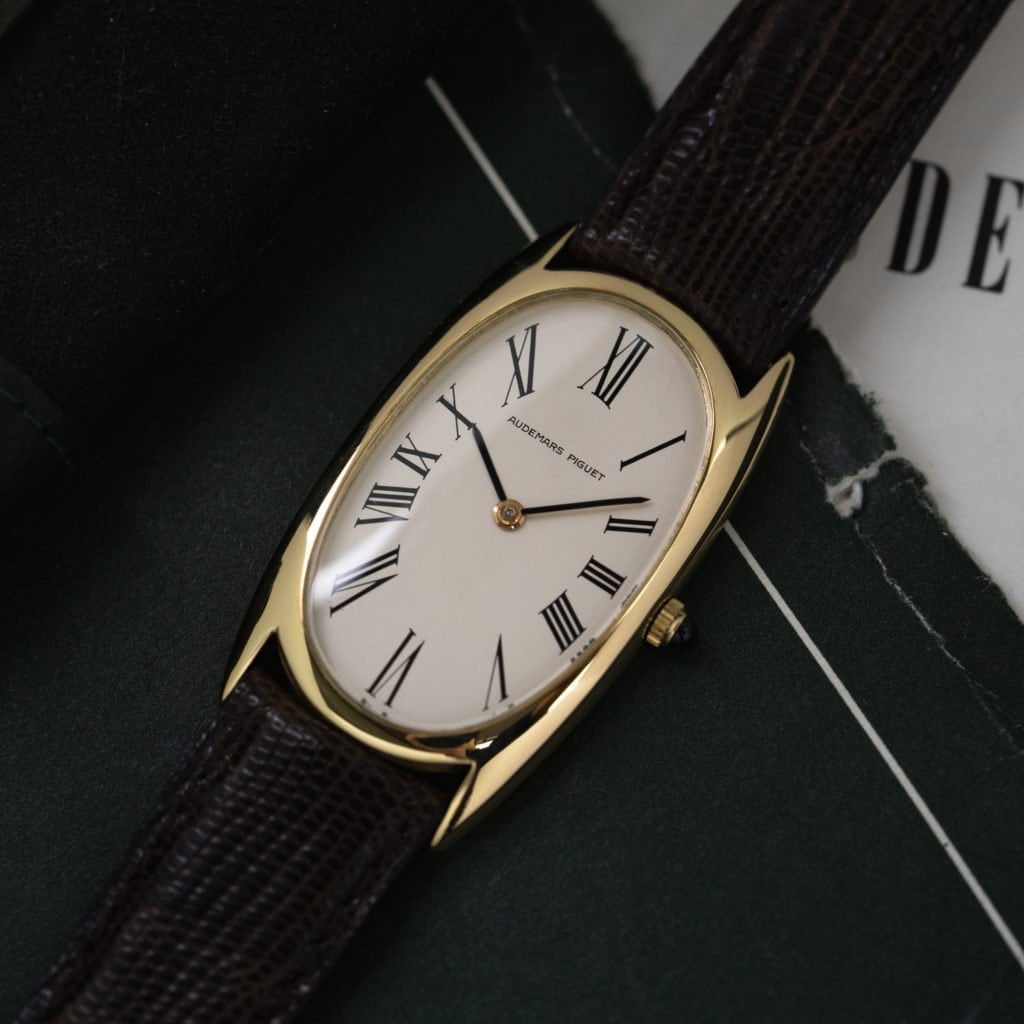 This exquisite oval Audemars Piguet dress watch could just as well have been a Cartier creation.Viewed from afar it certainly looks so. With its elongated oval shape, Roman numerals, and gem-set crown it certainly bears some of the Cartier hallmarks, but don’t call it a knock-off just yet. This watch actually fits very well in Audemars Piguet’s line-up of exquisite and creative dress watches from the 1970s.The 18k yellow-gold watch features an elongated oval case with lovely pointed lugs that give it the slightest hint of a tonneau shape. The 23 x 42 mm dimensions and slim curved profile give the watch an elegant wrist presence.The ivory dial is executed in typical minimalist Audemars Piguet style with elongated painted Roman numerals, simple sword hands, and a discrete Audemars Piguet signature. Meanwhile, a sapphire cabochon set crown introduces a cheeky pop of color in what is otherwise a classic dress watch.This elegant watch dates back to 1970 and is powered by an ultra-slim manual winding movement. The watch comes on a brown leather strap with an 18k yellow-gold Audemars Piguet Ardillon buckle and is accompanied by the original box and papers.