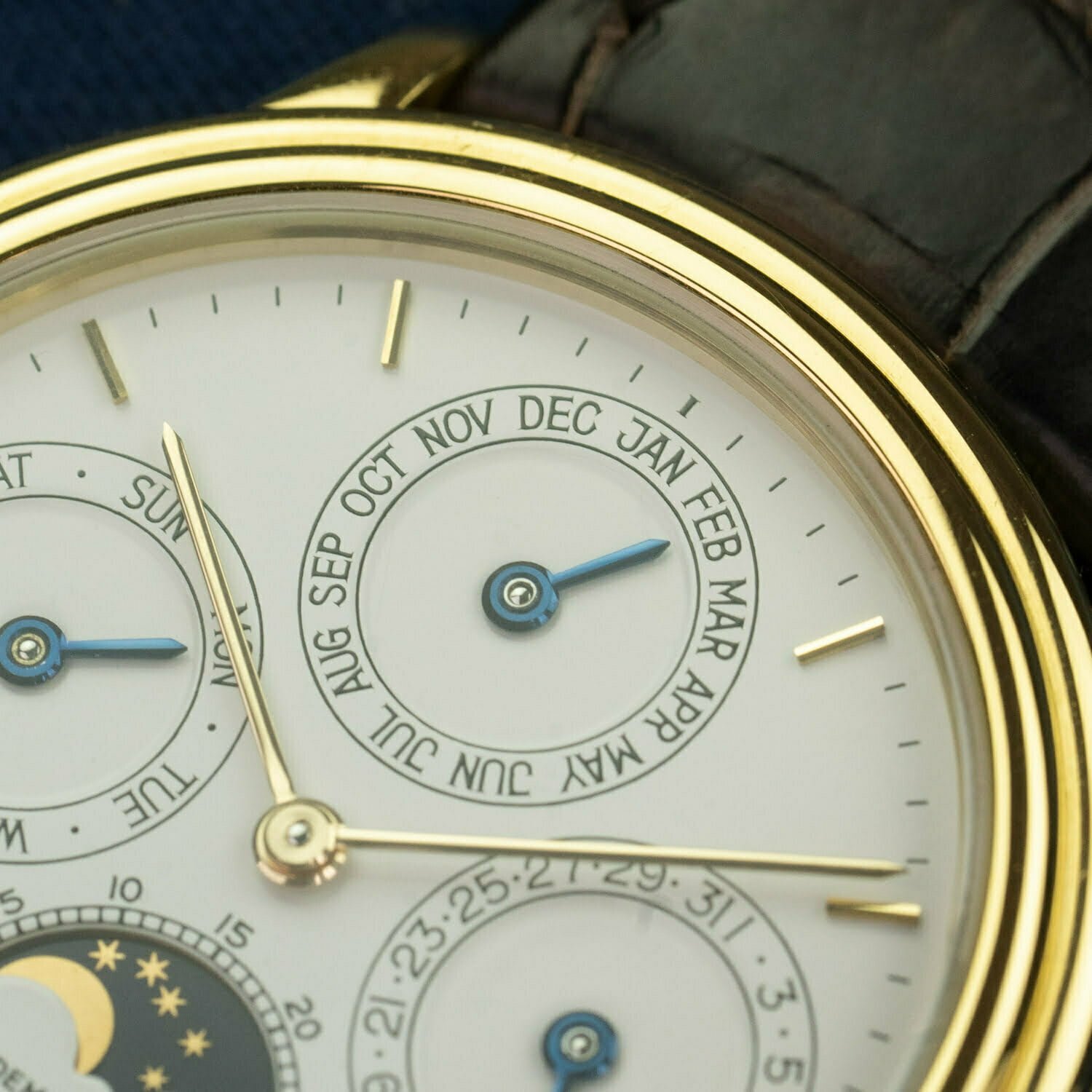 This 5548 features a classic white dial with elegant applied 18K yellow gold stick indices and matching thin gold hands as well as three lovely recessed sub-dials that indicate the day, date, month, and phase of the moon. More importantly, this watch features the original dial that was only found on the earliest 5548s. These dials are made from porcelain and are characterized by fine hairlines that develop on the subdials over time, a feature referred to by collectors as a ‘spider dial’. Moreover, these early dials are signed “Swiss” only at the 6 o’clock position. As these dials were often replaced by later service dials with “Swiss Made”, a 5548 with an original dial is highly desirable.