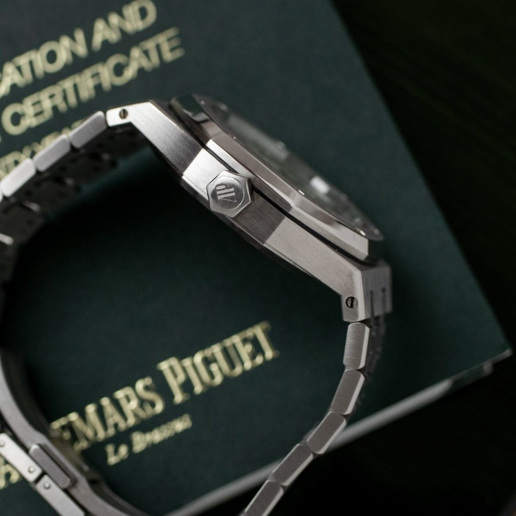 Have you always wanted to rock a Royal Oak were it not for its large dimensions? The modestly-sized reference 15450 is a wonderful modern alternative to the Jumbo Royal Oak.Audemars Piguet introduced the reference 15450 Royal Oak in 2012 as the latest model in a long and distinguished line of mid-size Royal Oaks. Measuring in at 37 mm, it’s the perfect size for those looking for a modern and slightly smaller alternative to the ‘Jumbo’ Royal Oak. Don’t be fooled by its dimensions though. It wears quite a bit larger thanks to the Royal Oak’s iconic angular case design.This 15450 dates back to 2016 and features a silvery-white dial with Audemars Piguet’s iconic ‘grande tapisserie’ pattern and long applied 18k white-gold hour markers. The stainless steel case, octagonal bezel, and integrated bracelet are in great condition, showing only light signs of wear. A sapphire case back yields a sneak peak at the ornately decorated 21k yellow-gold rotor.The watch comes as a full set with the original box and papers.