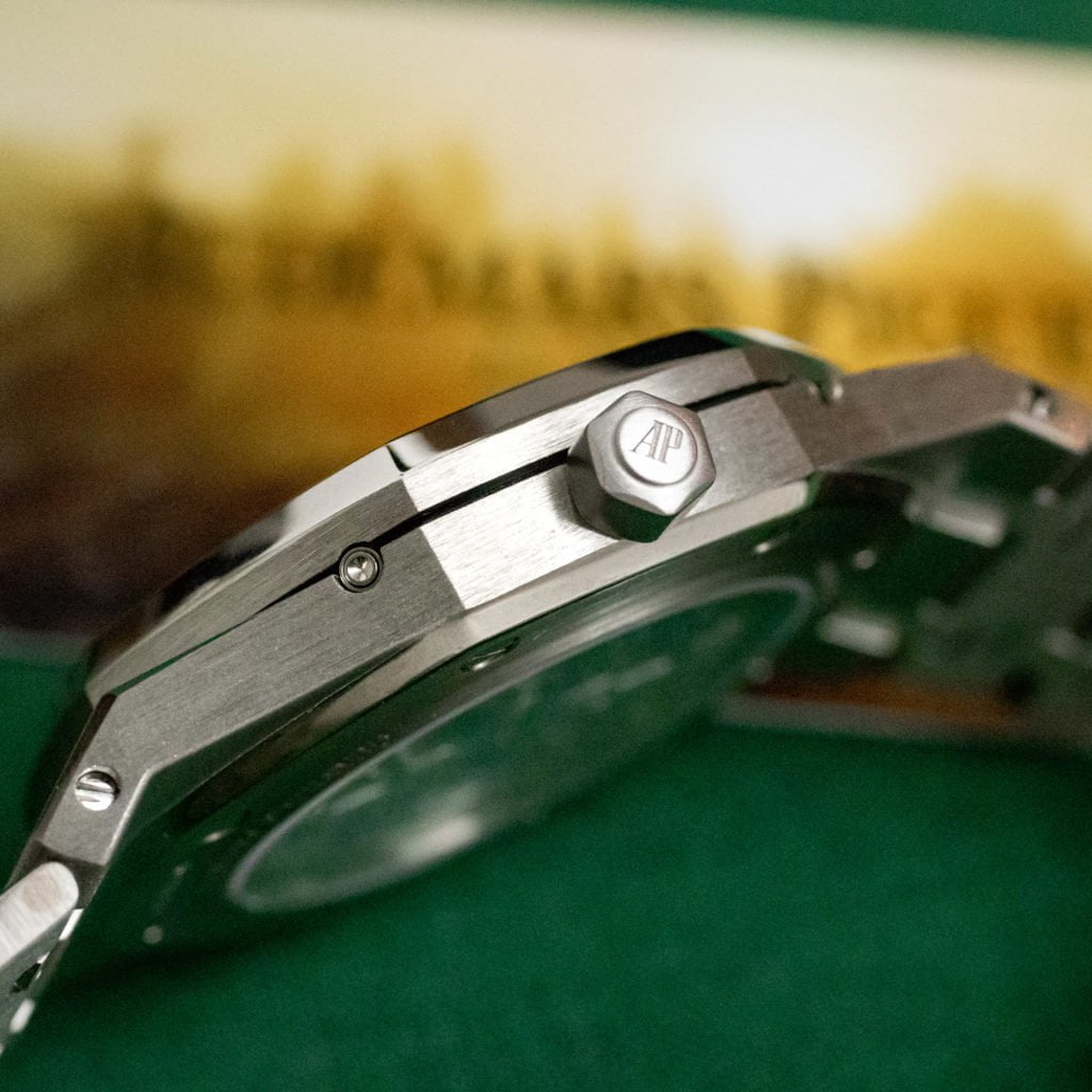 Before we dive into the backstory of this example, take a minute to appreciate this diamond embellished beast. Although it comes in "the usual Jumbo" diameter; 39mm, it pops off the wrist for a numerous of features. Starting off with all that factory set sugar on the bezel, something one doesn't see often on those sporty Royal Oaks. The diamonds can also be found on the dial as minute markers. But wait, where is the dial? You might not really see it, but the sub-dials. markers and moonphase are applied onto a sapphire crystal, enabling the appreciator of mechanical art to enjoy this movement.