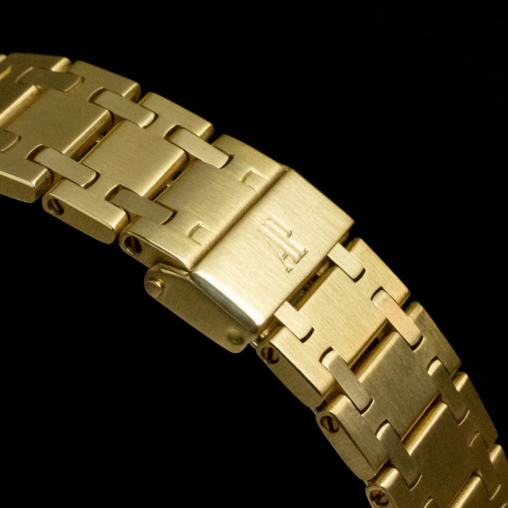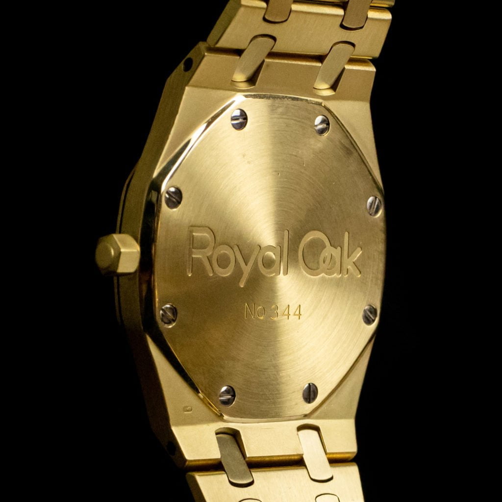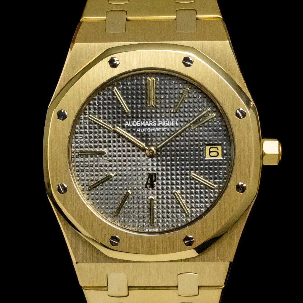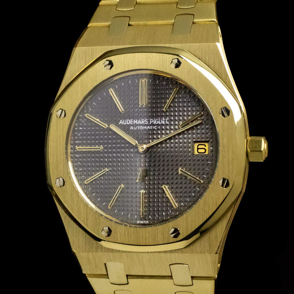 Back in the '70s, the Audemars Piguet Royal Oak literally saved the Swiss watch industry from collapsing. Why? Well, if you have been following our YouTube-channel, you should be familiar with the story right now. In short: In the early 1970s, quartz watches - primarily, from Japanese brands as Seiko and Casio - conquered the Swiss watchmaking industry. This period is also referred to as the Quartz crisis. These new electronic watches were more accurate than mechanical watches and more important, they were cheaper. Therefore, they caused a decline of the traditional, mechanical watch industry. One of the brands that suffered from these developments was Audemars Piguet. Sales plummeted year after year. Finally, they turned to a man that we, at Amsterdam Vintage Watches, hold dear: Gerald Genta. What did he do? He designed a large, mechanical, steel sports watch with a futuristic design that was outrageously expensive. Exactly this watch, the Audemars Piguet Royal Oak, created a disruptive change and established the desirability for a new type of mechanical watches.We are always glad to add pieces to our collection that have such a rich history. The Royal Oak we can offer you is slightly more special as it is completely made from 18k yellow gold. It dates back to 1979 and has a very much desired AP-down dial. It has the original case size of 39 mm and runs on the famous caliber 2121, which was based on Jaeger-LeCoultre’s ultrathin caliber 920. This Royal Oak has the original, industrial shape and details and the beautiful, dark grey tapisserie dial. It comes with an inner and outer box and the extracts of the archives.