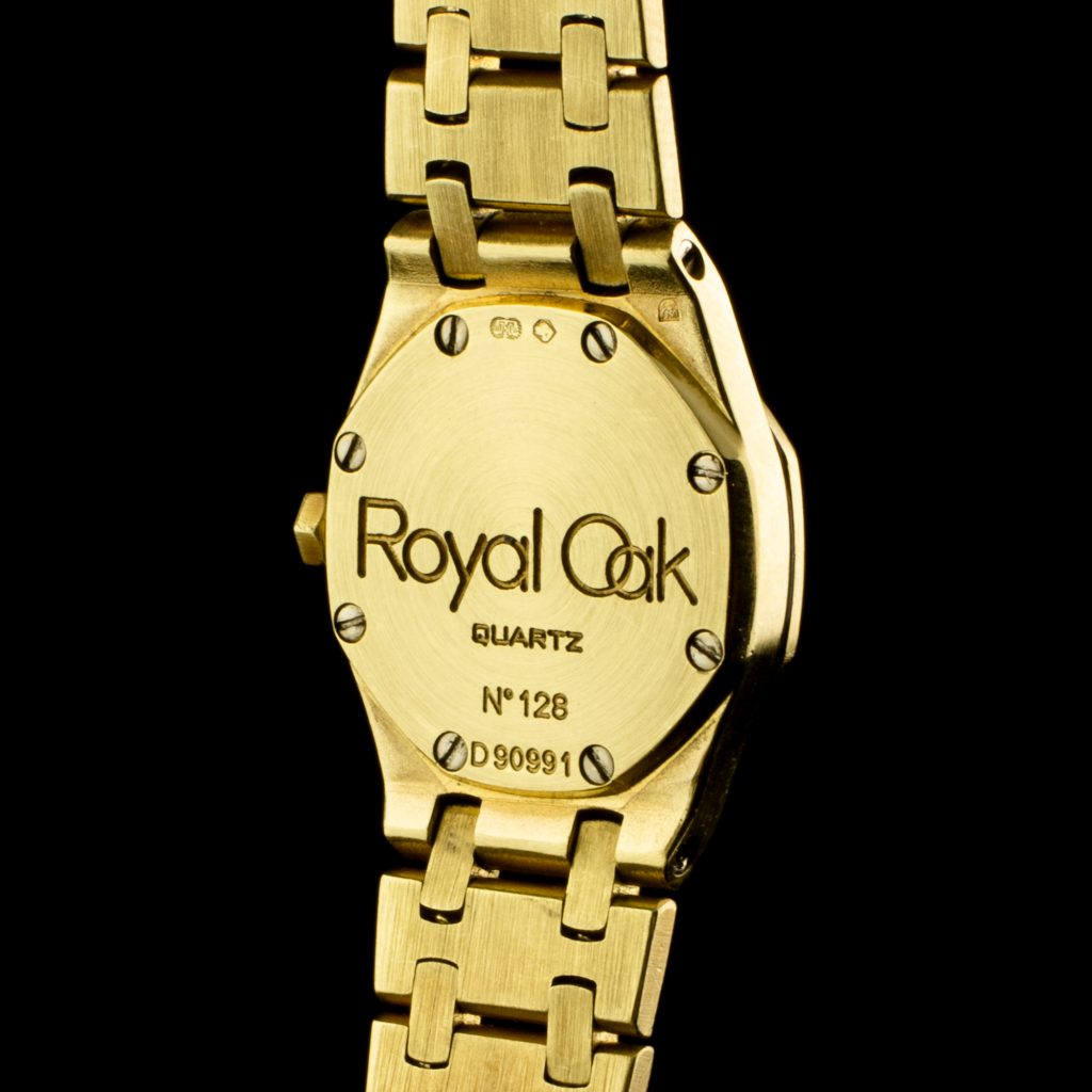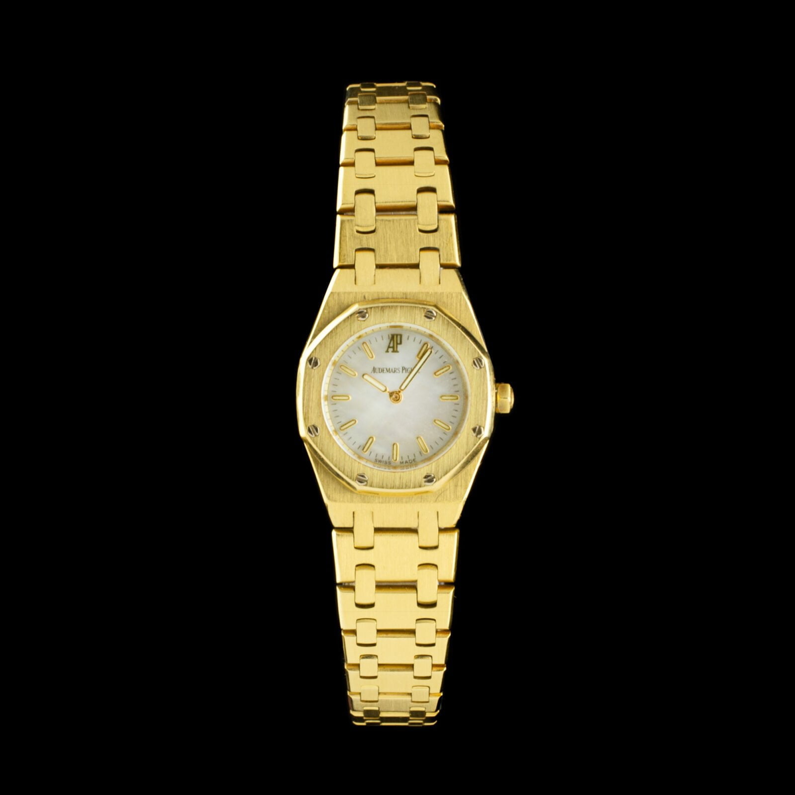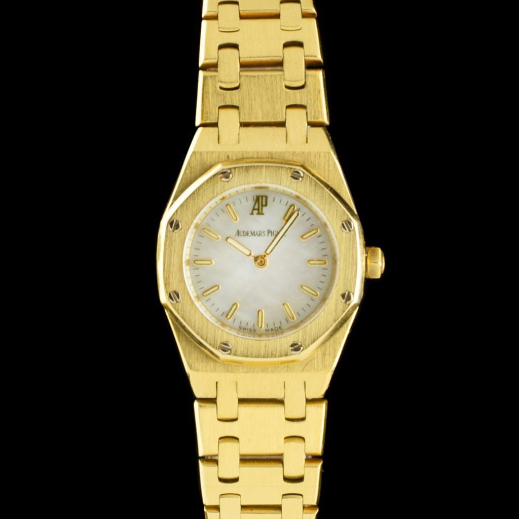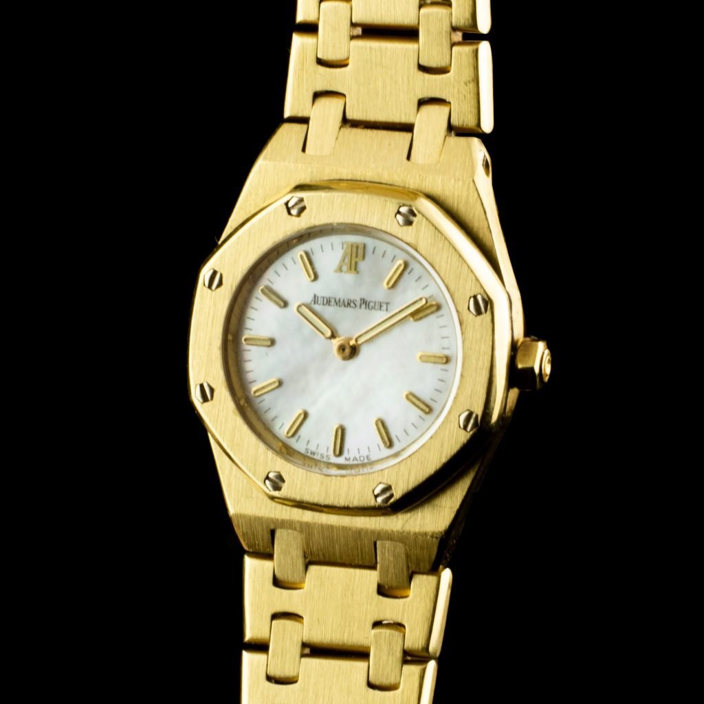 Here we have a perfect lady AP Royal Oak from around 1994 in full 18k yellow gold and Mother of Pearl (MOP) dial. A true gem for a lady with good taste. It's a small 20 mm watch and the golden bracelet makes it a jewel on the wrist. With a very accurate Quartz movement it will tell time the proper way.