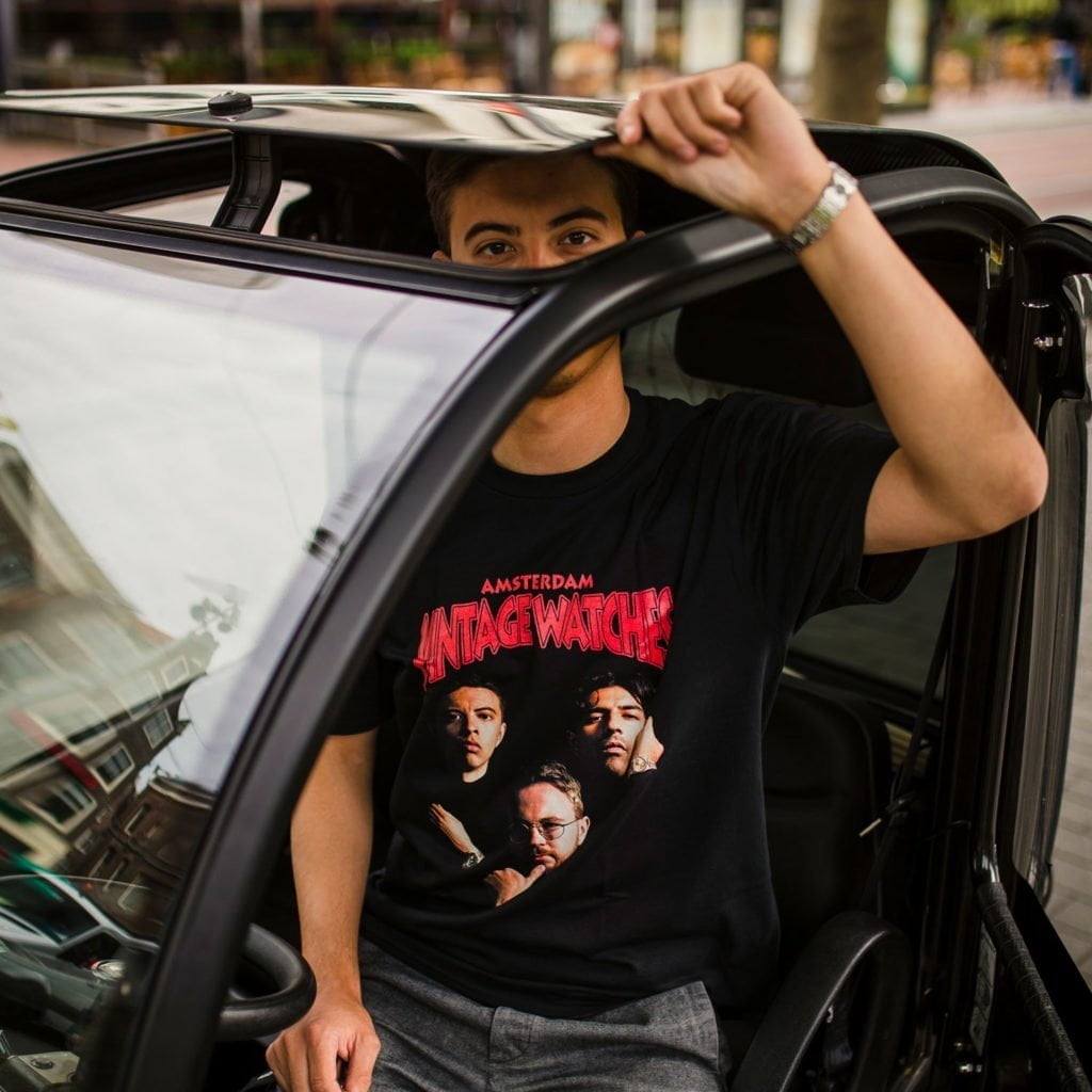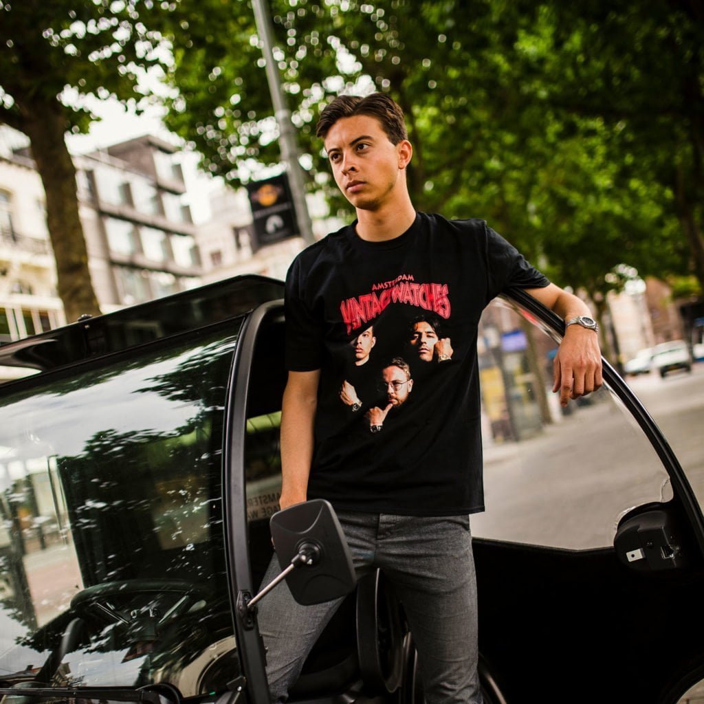 We like to think that there are some similarities between us and Death Row Records. Like them, we’re outspoken, unapologetic, and we definitely got the watch game in a chokehold. And like Death Row we couldn’t have done this without you: the loyal fans. To show you some appreciation we’ve created a limited edition Amsterdam Vintage Watches t-shirt with the help of our talented photographer friend Ali (@aliwasthere). For this special project our guys recreated the legendary 1996 Vibe Magazine cover, with Ramon posing as Tupac, Rutger as Snoop, and Jasper as Suge.*