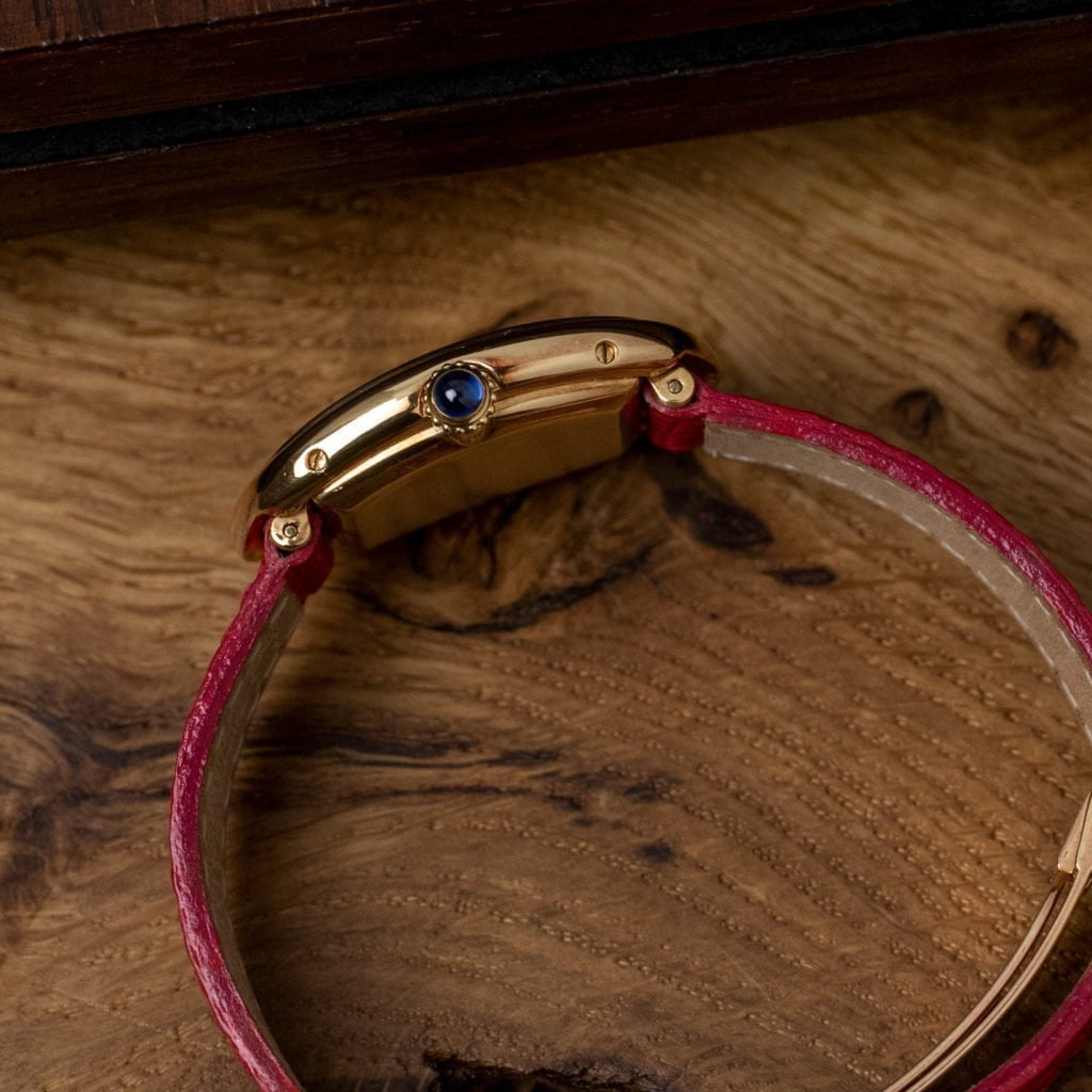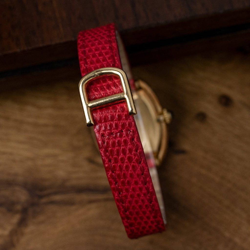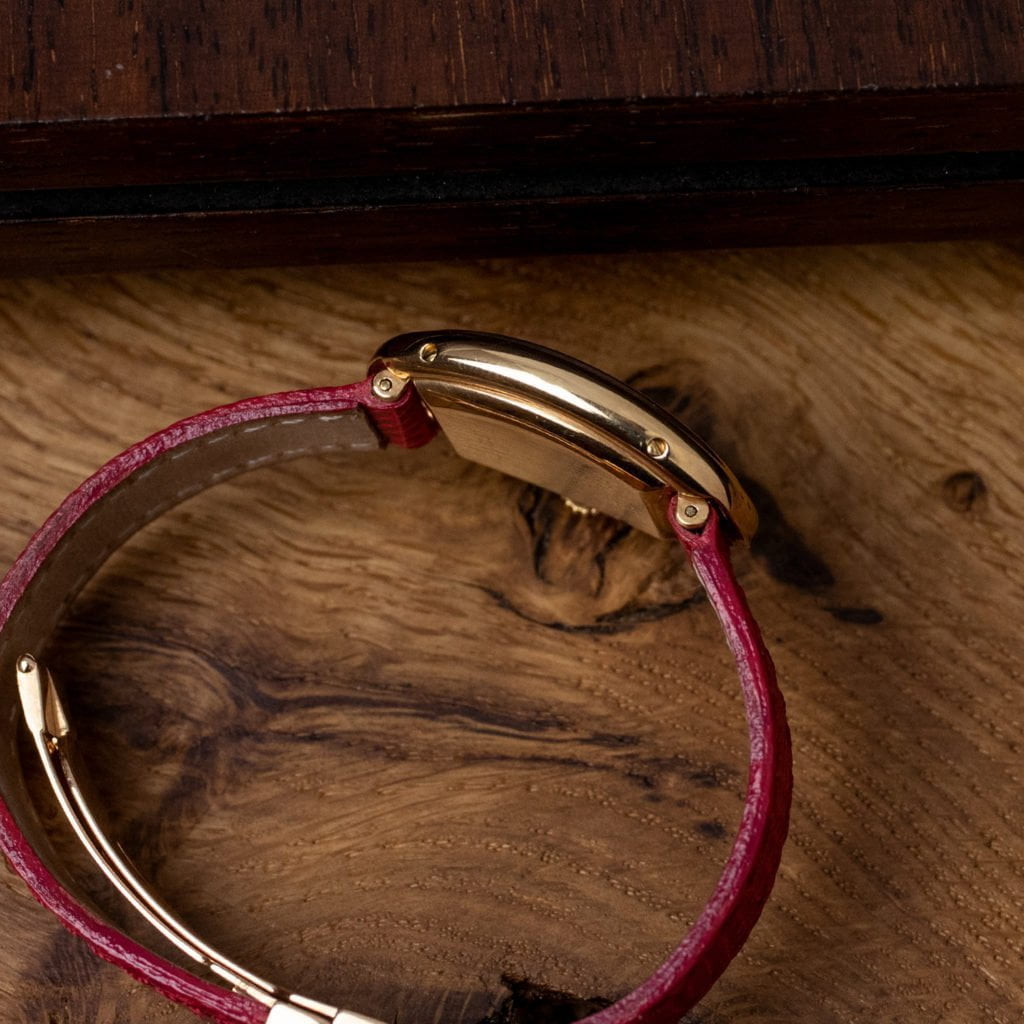 The Cartier Baignoire is based on an unnamed design from 1912 that was gifted by Louis Cartier to Russian Grand Duchess Pavlovna. The model was only released to the general public in 1957 under the ‘baignoire’ moniker, from the French word for bathtub. Fittingly, this elegant ladies model gives us the same fuzzy feeling as slipping into a warm bathtub! The Baignoire takes the traditional round watch shape but stretches and curves it into an evocative feminine design. Together with the slim strap that is hidden under the case, the Baignoire gives the impression of a watch merrily floating on top of the wrist. This 18k yellow-gold Baignoire measures 31 x 22 mm, a perfect ladies size that is neither hefty nor diminutive. This particular watch features an uncommon ‘fancy’ case compared to the average Baignoire due to the addition of an extra concave band (known as a ‘gadroon’) around the glass, which gives the impression of a stepped case. The white dial with classic painted black Roman numerals features a “PARIS” signature at the 6 o’ clock position, indicating that the watch was sold by Cartier’s legendary flagship boutique at Place Vendôme. Moreover, the watch runs on a classic hand winding movement as opposed to the more common battery-driven versions. As tradition dictates, the crown is topped by an exquisite blue sapphire cabochon. The watch comes on a red lizard leather Cartier strap with an 18k yellow-gold Cartier folding clasp.