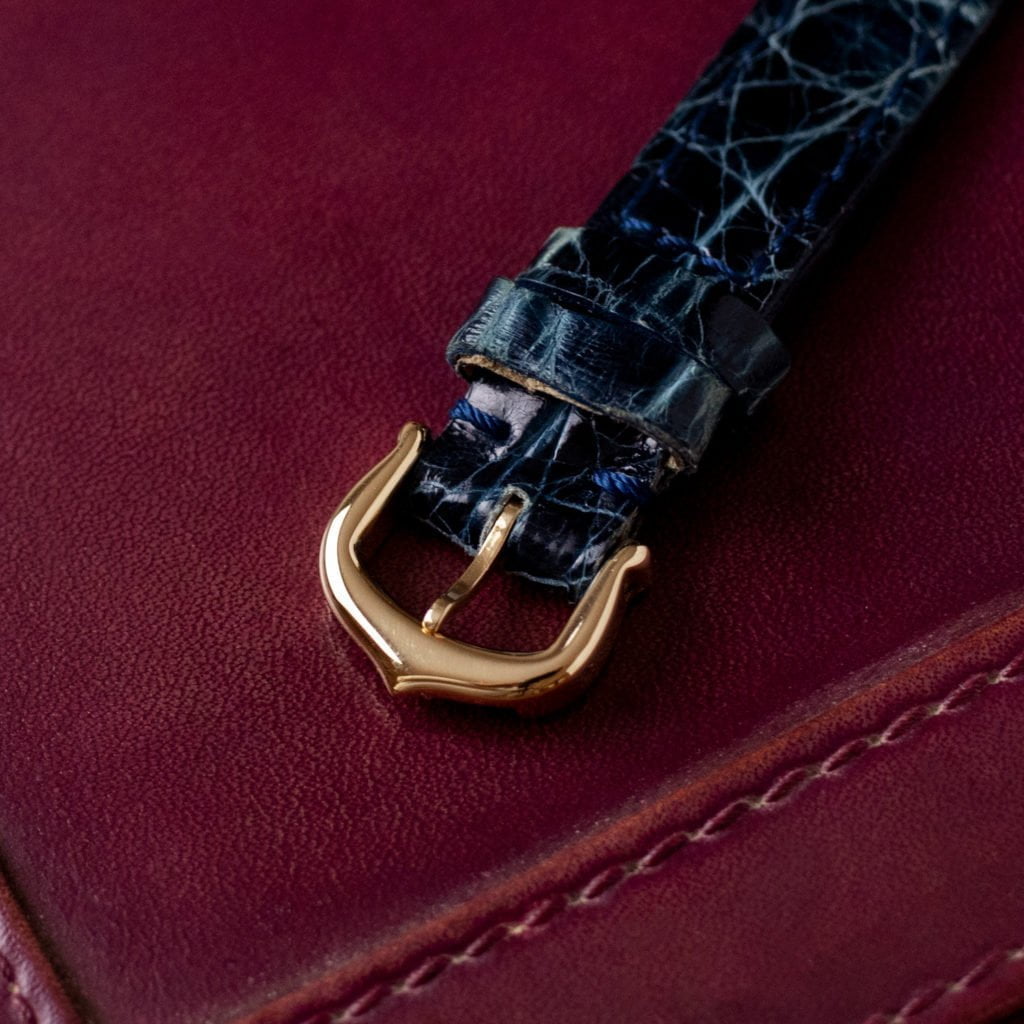 The Cartier Baignoire is based on an unnamed design from 1912 that was gifted by Louis Cartier to Russian Grand Duchess Pavlovna. The model was only released to the general public in 1957 under the ‘baignoire’ moniker, from the French word for bathtub. Fittingly, this elegant ladies model gives us the same fuzzy feeling as slipping into a warm bathtub! The Baignoire takes the traditional round watch shape but stretches and curves it into an evocative feminine design. Together with the slim strap that is hidden under the case, the Baignoire gives the impression of a watch merrily floating on top of the wrist. This 18k yellow gold Baignoire measures 31 x 22 mm, a perfect ladies size that is neither hefty nor diminutive. The dial has a silvery white hue and sports Cartier’s ‘hidden’ signature in the numeral at the 10 o’clock position. As tradition dictates, the crown is topped by an exquisite blue sapphire cabochon. The watch comes on a blue alligator leather strap with an 18k yellow gold Cartier ardillon buckle.