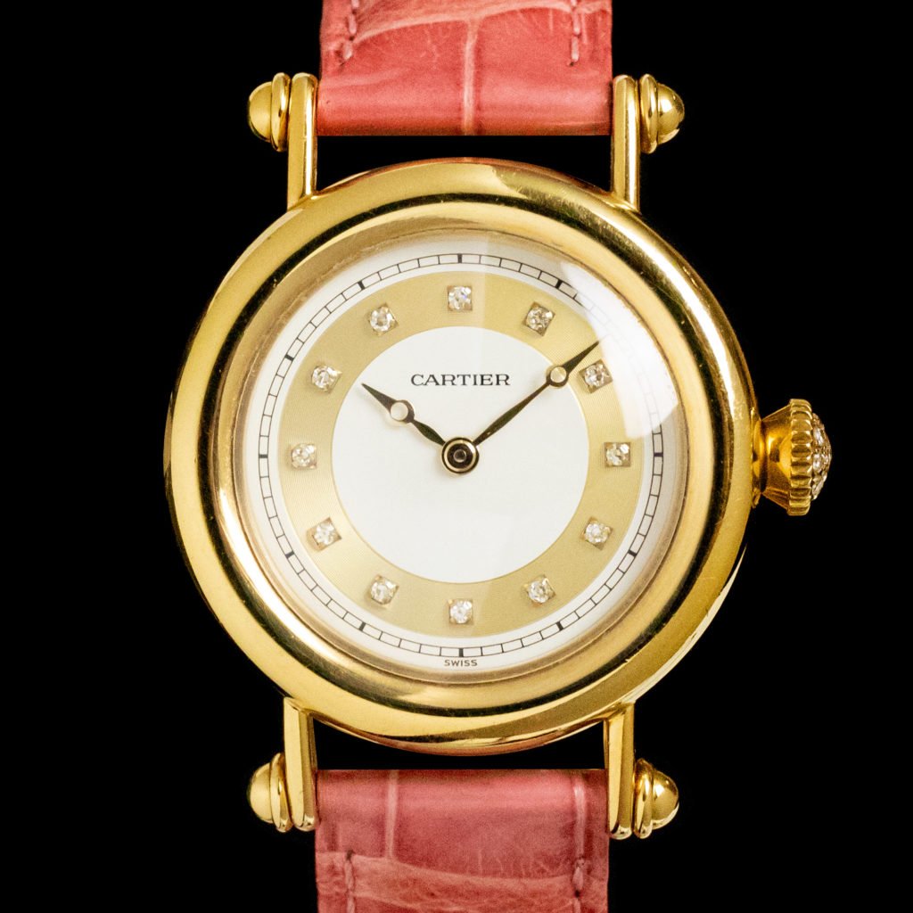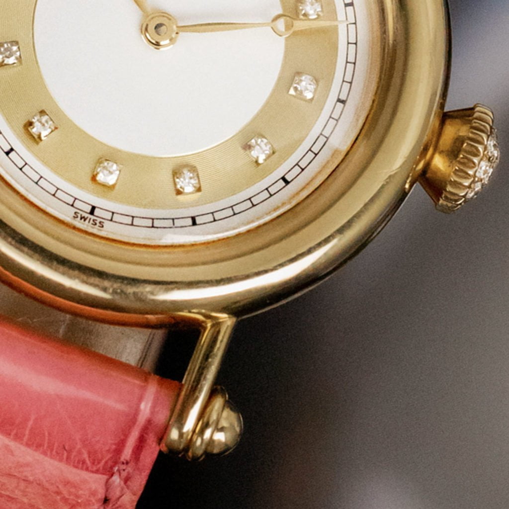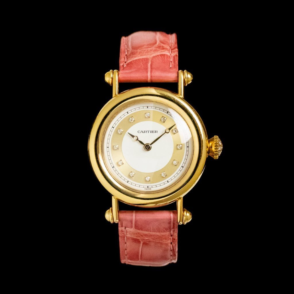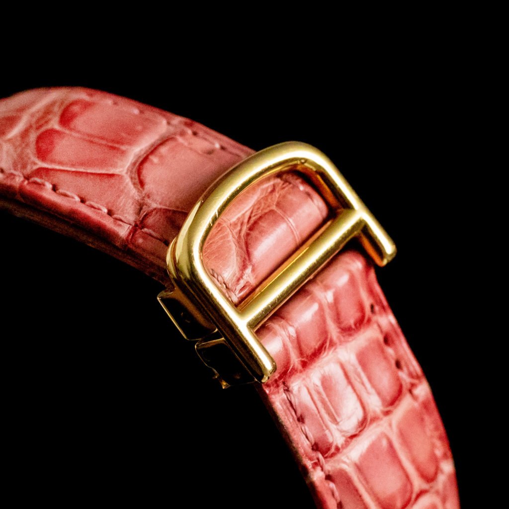 Even for Cartier, this is a strange watch. At first look it seems to combine every random watch design element that you could think of but for some reason it absolutely works. This Cartier Diabolo goes under reference 1430 and dates back to 1990. The watch has a tuxedo-like dial with factory-set diamond hour markers. The hands are in Breguet style. The watch thanks its name to the crown, which looks like one half of a diabolo. The top of the crown has factory-set diamonds too. Furthermore, it has straight lugs with screws on the outside. The round case is made from 18k yellow gold just like the Cartier deployant clasp. To make it even more weird (but cool!), the watch is paired with an alligator-leather, pink strap.