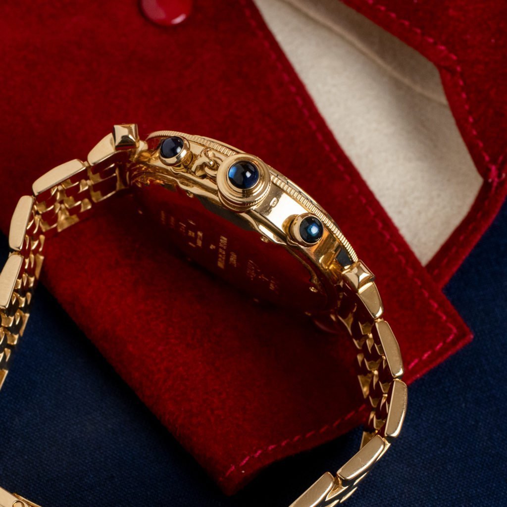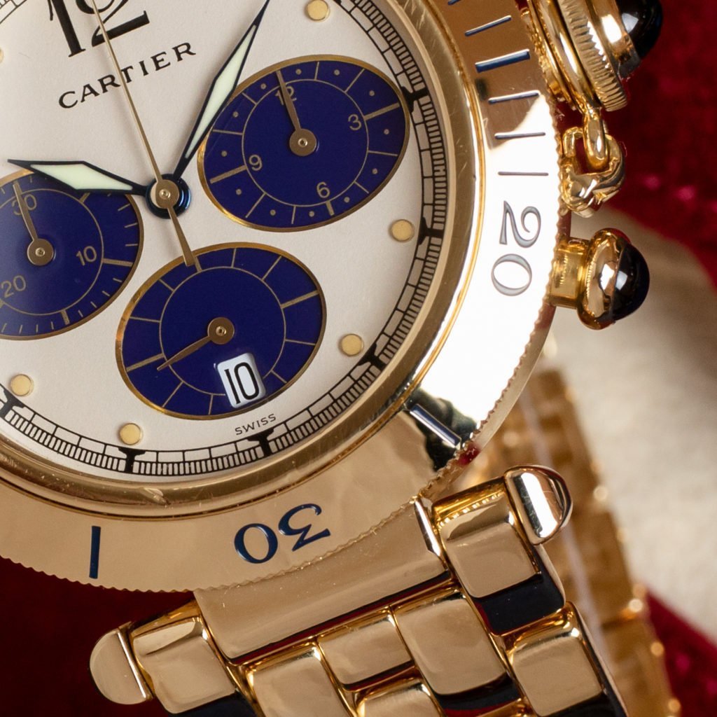“Mash’Allah, Mash’Allah,” is what we imagine the Pasha of Marrakesh said when he took possession of his unique 18k gold waterproof watch from Louis Cartier. We’re proud to offer you a 1980s reinterpretation of that one-of-a-kind watch. As the story goes, somewhere in the 1930s or 1940s the Pasha commissioned Cartier to build a sturdy gold wristwatch that he could take with him during his daily swim. In the 1980s, Cartier tasked the legendary Gerald Genta—the designer of the iconic Royal Oak and the Nautilus, among many other watches—to devise a new collection based on the Pasha’s watch. This ref. 30009 from 1987 hails from the Genta-designed Pasha de Cartier collection and incorporates a chronograph complication. The watch features a curvy round case with large, bulbous, chronograph pushers, all executed in 18k yellow gold. The bold and unconventional design of the watch is accentuated by the presence of broad single lugs that connect to the hefty 18k yellow gold brick-style bracelet as well as the large sapphire-tipped onion-shaped crown that is attached to the right hand side of the case with a small chain. The ivory dial features large painted numeral 12 in Art Deco font, a painted closed minute track, and applied round hour markers with creamy luminous filling. The chronograph functionality can be read on the three recessed oval counters with a lovely royal blue background color. The theme is continued in the large blued sword hands and the sapphire cabochons on the chronograph pushers and the crown. The ref. 30009 is powered by a convenient quartz movement. The watch is in great condition and just came back from a full service at Cartier.