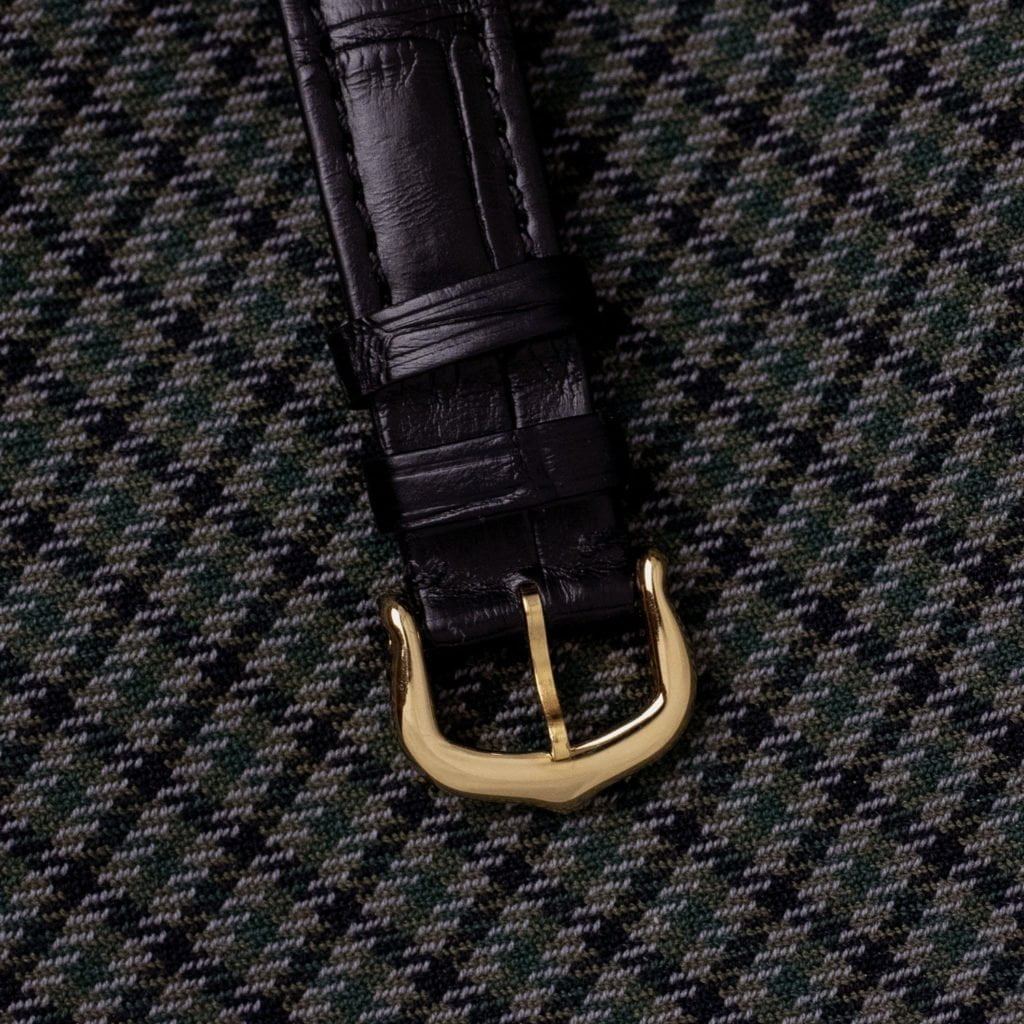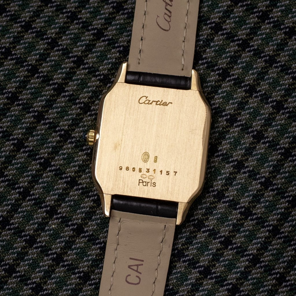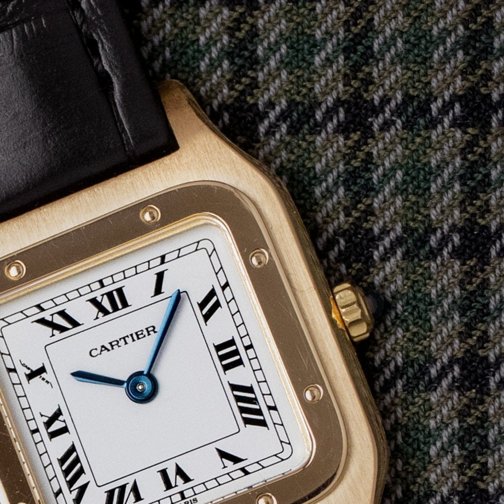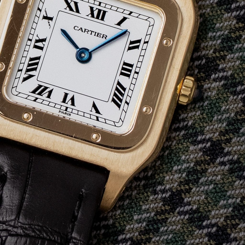 Cartier set the template for every modern wristwatch with the introduction of the Santos Dumont in 1904. This elegant ladies version is every bit as revolutionary today as it was over a hundred years ago. Men used to wear rather large pocket watches until Louis Cartier introduced the Santos in 1904 as the first purposely designed men’s wrist watch. The Santos was not only pioneering for completely reimagining the way we interact with our timepieces, but also introduced a revolutionary aesthetic. The pocket watches that preceded it and many wrist watches that followed it were round with fluid details. The Santos, in contrast, had a strong and utilitarian aesthetic, with a square case and visible screws on the bezel. These design elements would be reintroduced almost 70 years later by Gerald Genta in the Royal Oak. The Santos has remained a staple in Cartier’s collection ever since its introduction more than a century ago. This ladies version dates back to the early 1990s. The 18k yellow gold case is extra thin due to the manual winding movement. The slim profile with case dimensions of 23 x 32 mm make for an elegant watch. The dial sports the classic Cartier-style black Roman numerals and features a ‘Paris’ signature at the 6 o’clock position, indicating that the watch was sold at Cartier’s legendary flagship boutique at the Place Vendôme in Paris. On the crown we find an exquisite blue sapphire cabochon, a detail that is continued on the elegant blued sword-shaped hands. We’ve paired the watch with a new black alligator leather Cartier strap with an 18k yellow gold Cartier ardillon buckle. The watch has received a full service at Cartier and comes with the corresponding service papers and Cartier warranty.