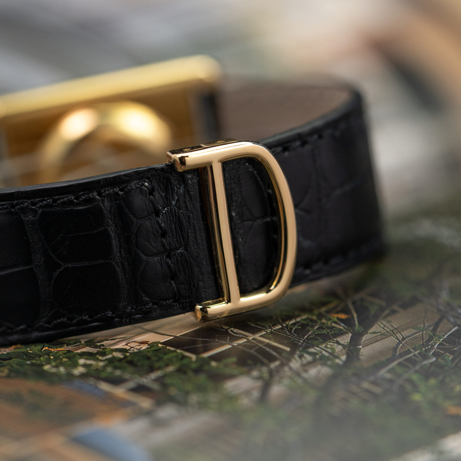 This example is in excellent condition, coming with old service papers from Cartier. However, it was also recently serviced by our Cartier certified watchmaker. It comes on a black leather strap with the original 18K yellow gold Cartier deployant-clasp.