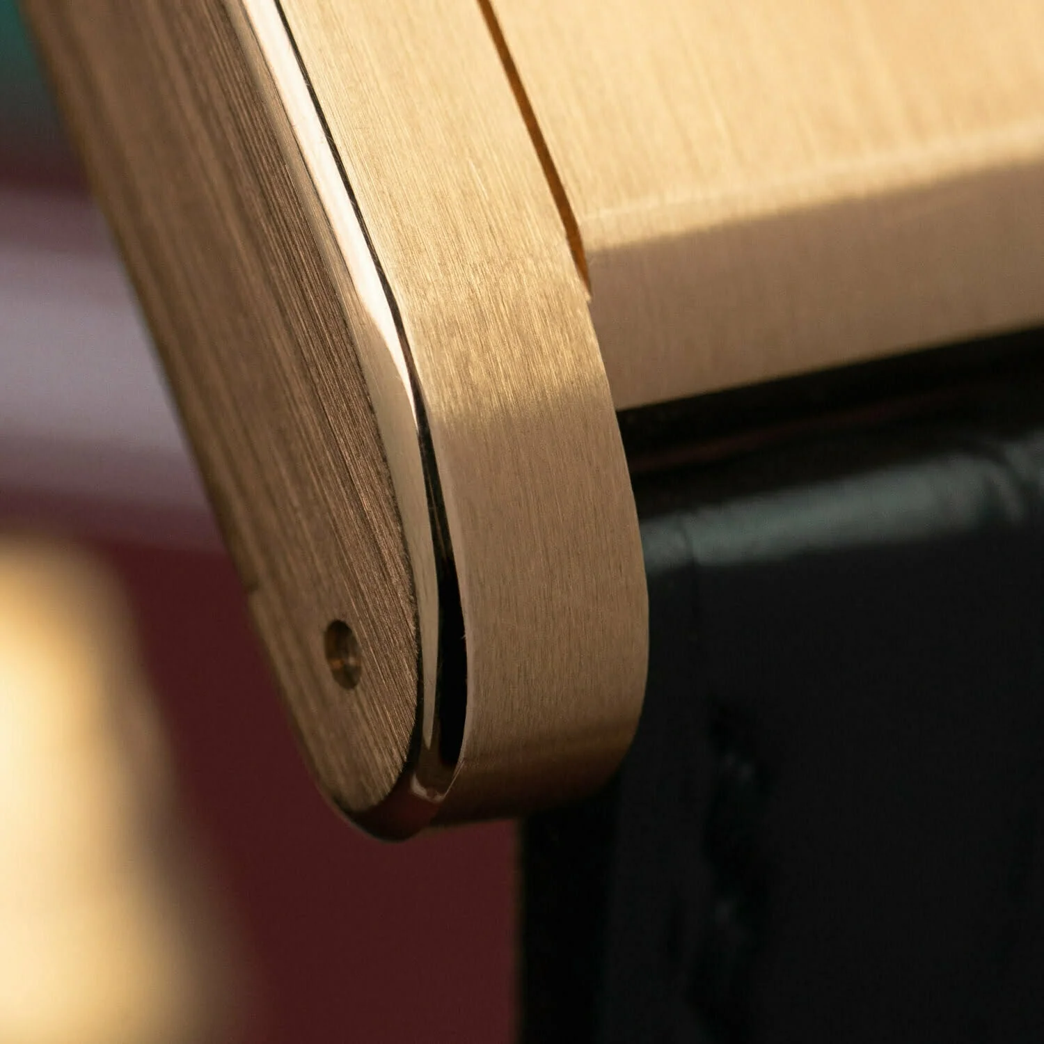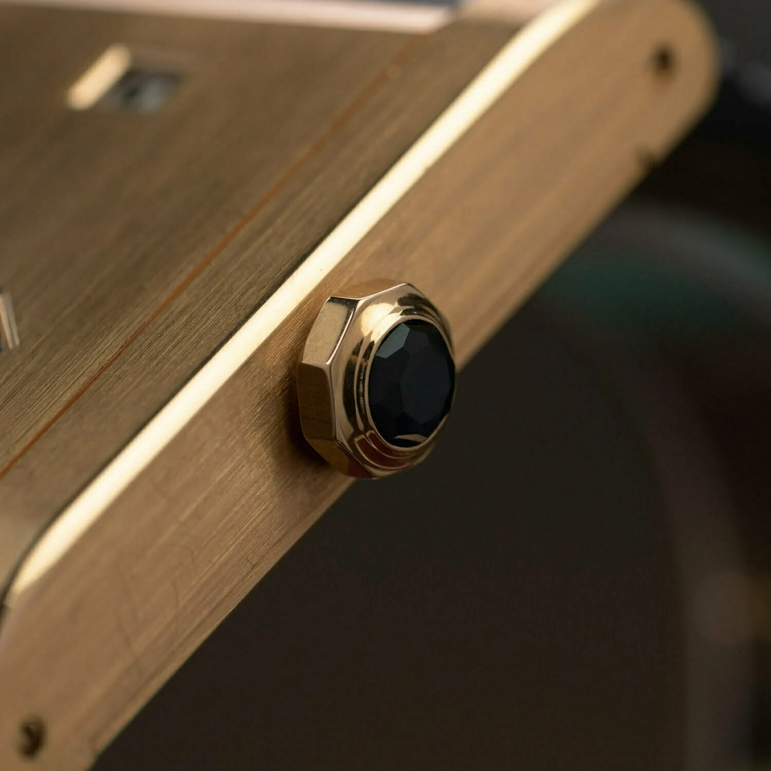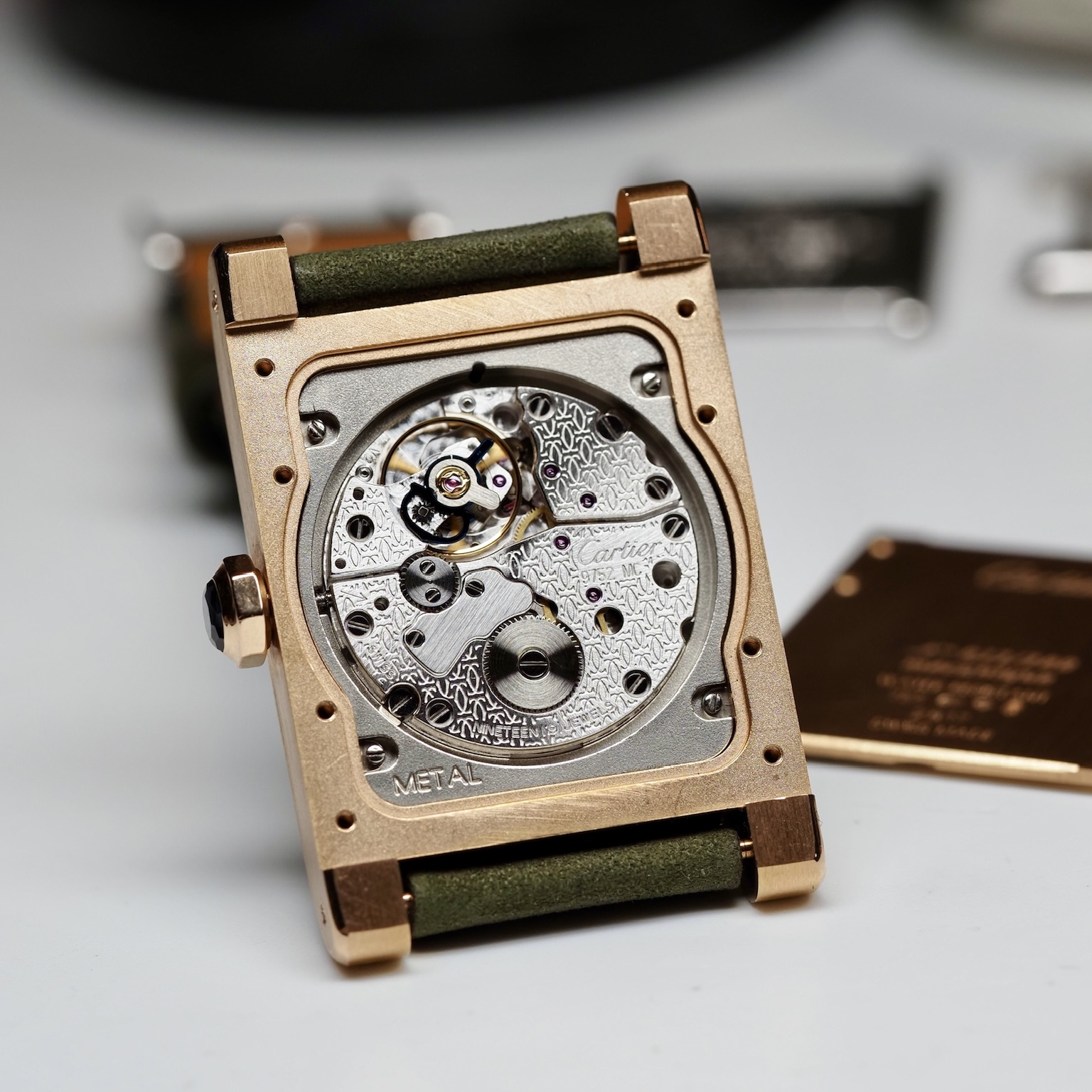 This ref. 2817 is one of those 100 rose gold pieces from the 2005 CPCP run. The watch features a 26 x 37 mm 18k rose gold case with a beautiful brushed finish all over. A rectangular aperture at the upper half displays the current hour, while an arc-shaped aperture below shows the sweeping minute disc. Meanwhile, in true Cartier fashion, the octagonal crown is topped with a blue sapphire.