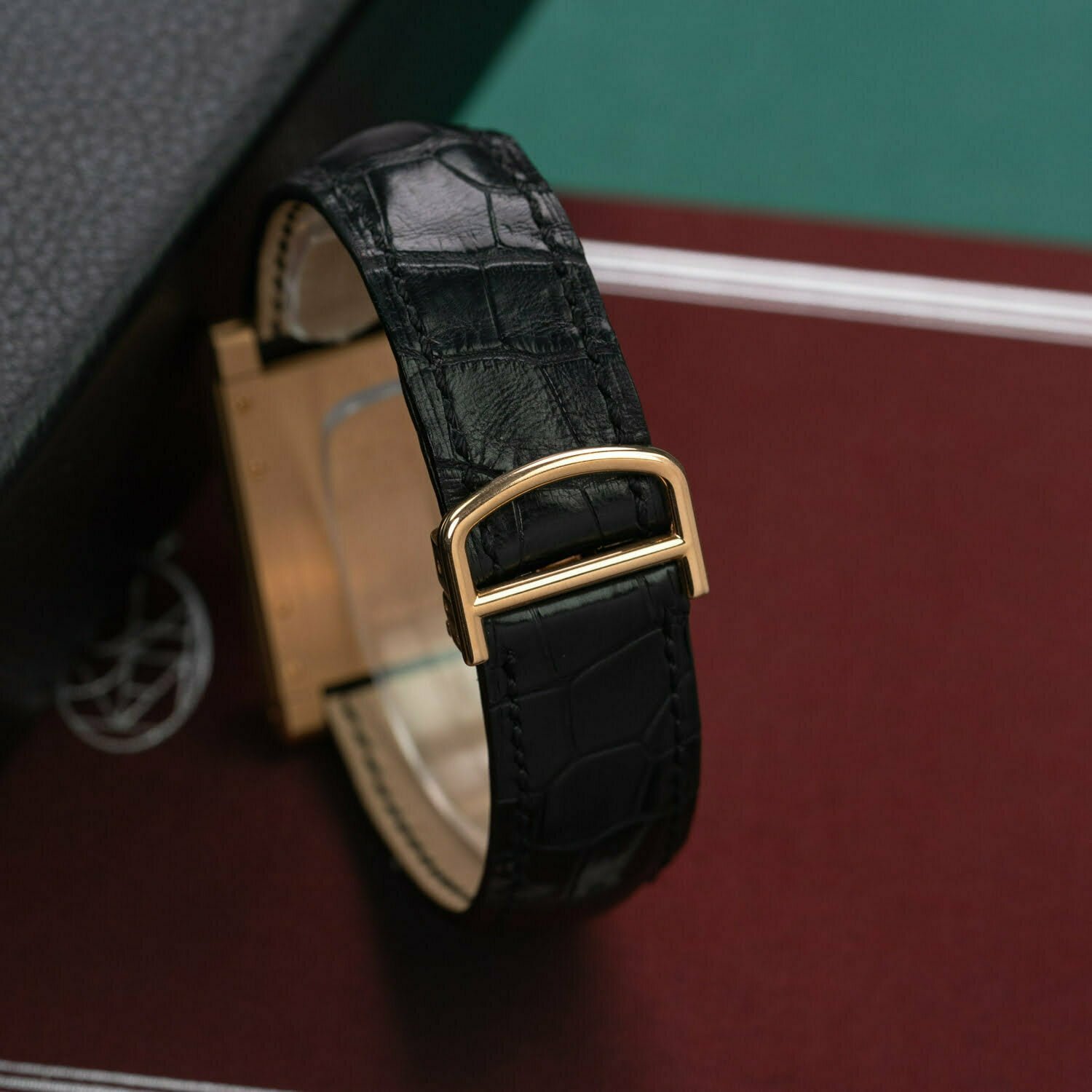 This collectible and historically important Cartier is in excellent condition and comes with the original box, a black alligator leather Cartier strap and an 18k rose gold deployant clasp.