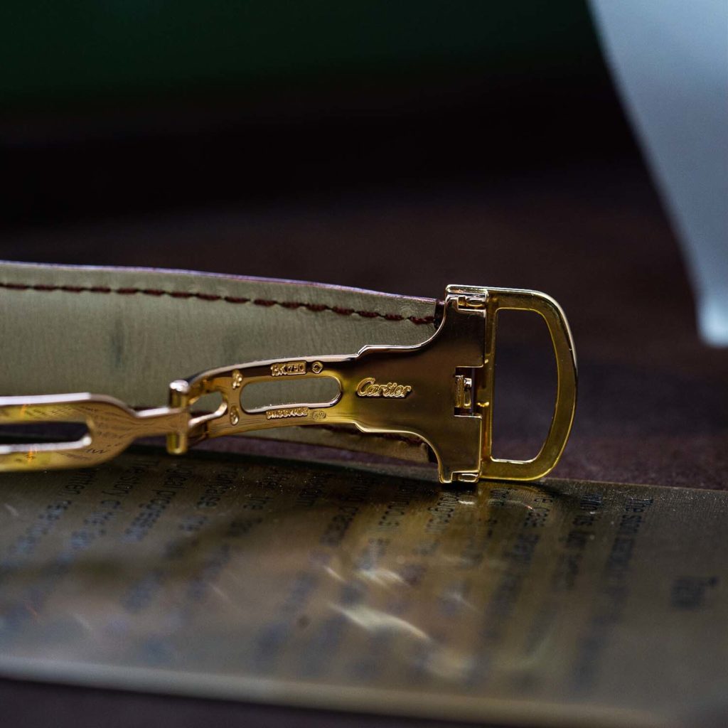 The Tank à Vis draws inspiration from one of the most elusive watches ever made by Cartier: the Tank Étanche. A company with a history as rich as Cartier’s is bound to be the subject of some mythmaking and exaggeration. One of the more fascinating stories—one we have told previously—is about the Pasha of Marrakech, who commissioned Cartier to build a waterproof watch in the 1930s to be taken along during his daily swims. Supposedly, Cartier created an oversized round watch for him, a model that would be reintroduced in the 1980s as the flashy Pasha de Cartier. It is unlikely that this is accurate, as the tastes of the time were much more in line with classic rectangular watches like the Tank. It is much more plausible that the Pasha ordered a Tank Étanche, a unique waterproof version of the classic Tank for this purpose. The Tank Étanche is one of the rarest models ever made by Cartier. Only one has come up for auction in recent years, when Phillips sold a Tank Étanche in 2019 that was purchased in the 1930s by the American socialite Barbara Hutton. The Tank Étanche subsequently served as inspiration for the Tank à Vis that was introduced as part of the exclusive and limited “Collection Priveé Cartier Paris” (CPCP). This ref. 2484E Tank à Vis from the Collection Priveé dates back to the early 2000s and features a rectangular 18k yellow gold case, measuring 27 x 31 mm (39 mm lug to lug). Just like the Tank Étanche that inspired it, the Tank à Vis sports an H-shaped bezel with screws in each corner. The real star of the show is the exquisite handmade dial. As with all of the CPCP watches, the dial is made of 18k gold, covered with a layer that contains fine guilloché engraving and a rose motif in the center. The dial, of course, features Cartier’s painted black Roman numerals and closed minute track and elegant blued sword hands. The latter match well with the iconic sapphire-tipped 18k yellow gold crown. The 2485D is powered by an ultra-thin manual winding movement that was produced especially for the CPCP collection by Piaget. The watch was just serviced by Cartier and comes with the corresponding service papers, as well as a light brown alligator leather Cartier strap with an 18k yellow gold Cartier deployant clasp.