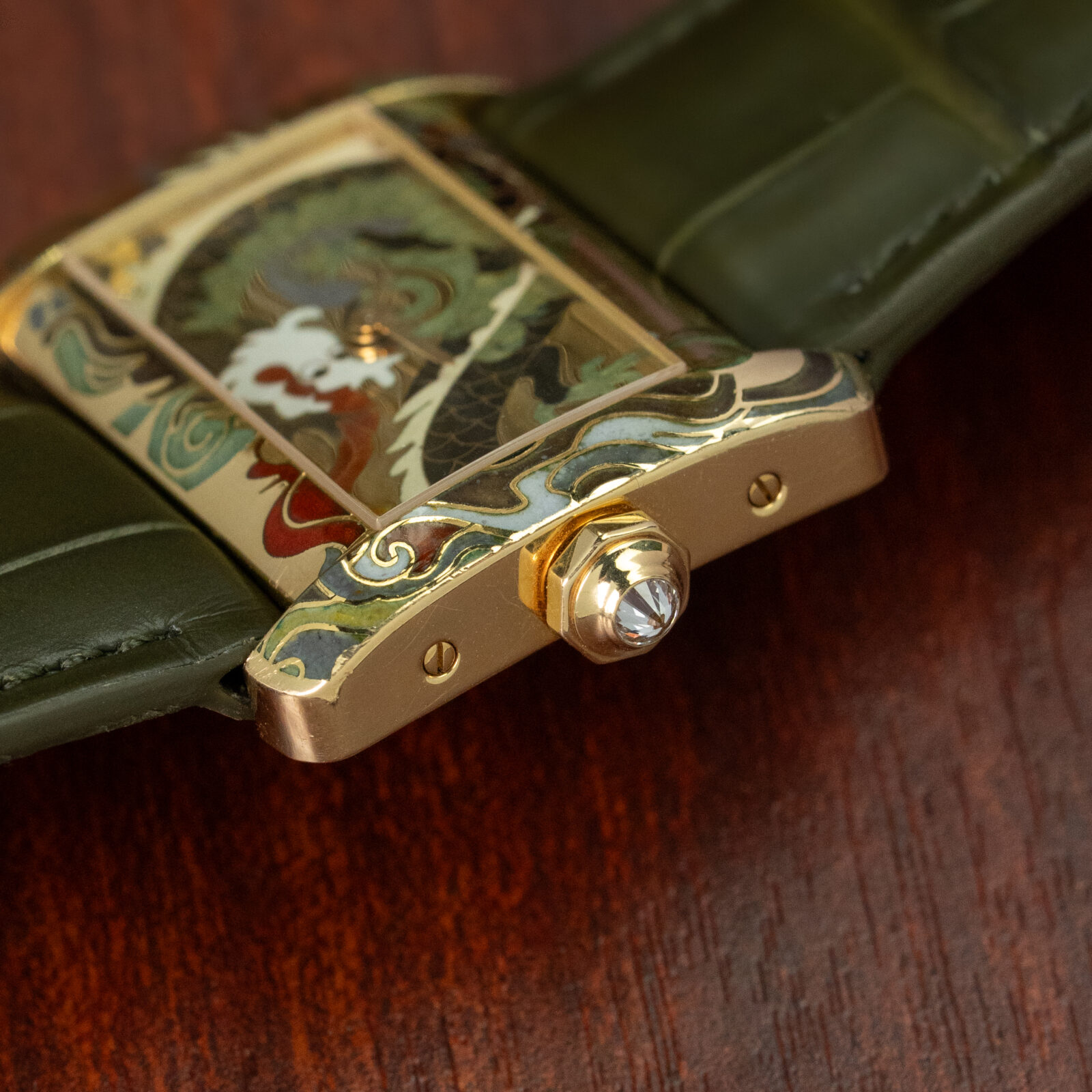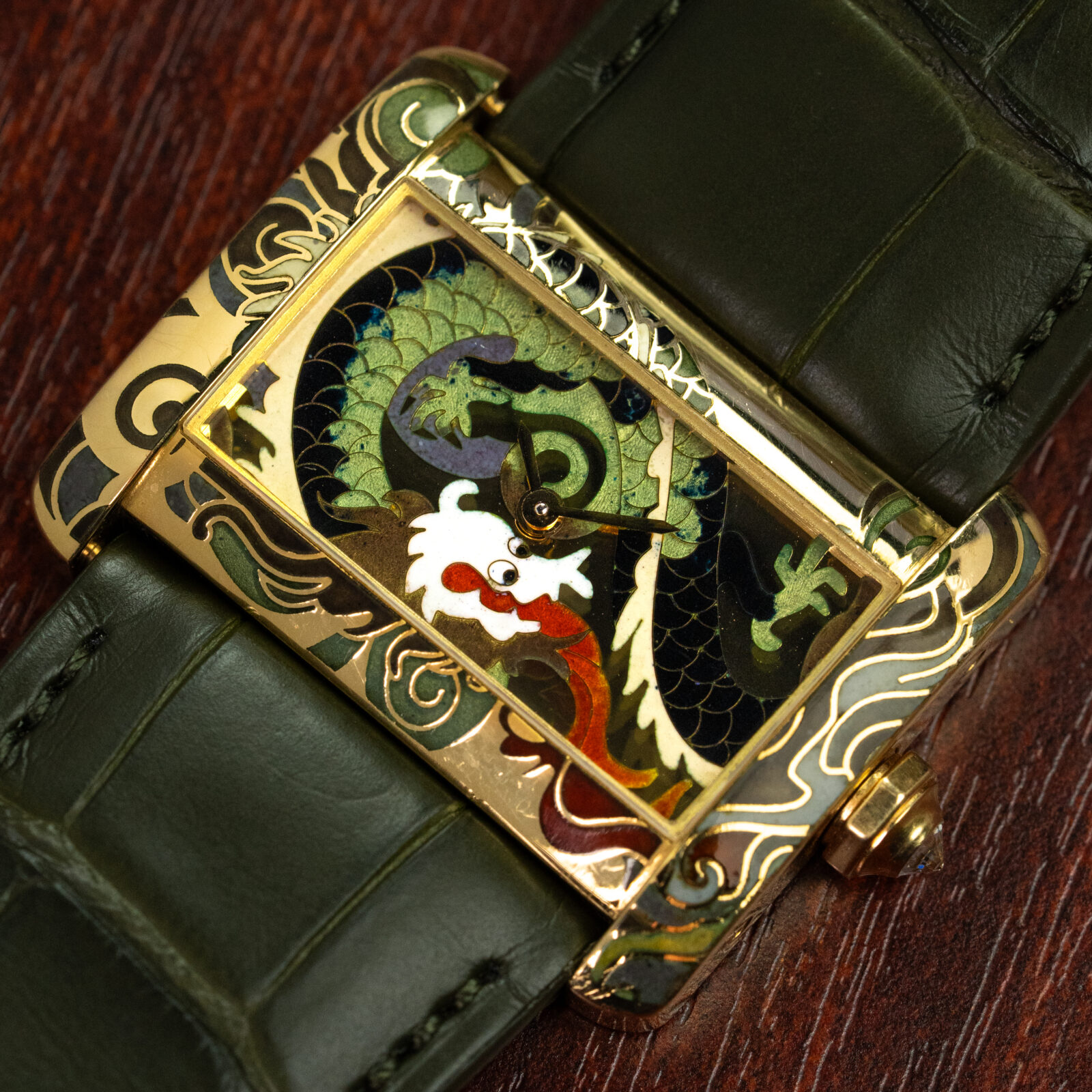 This rare Cartier Tank Divan in 18k yellow gold presents one of the manufacture’s most evocative expressions of early-2000s artistry. Created in a strictly limited series of only twenty pieces, it transforms the Tank Divan’s elongated geometry into a miniature canvas for a cloisonné-enamel dragon of exceptional depth and nuance. The motif is executed with the precision of true haute joaillerie craftsmanship: rich greens and blacks set against warm, fiery tones, each outlined by fine gold wirework that brings the creature’s movement to life.