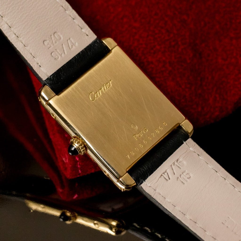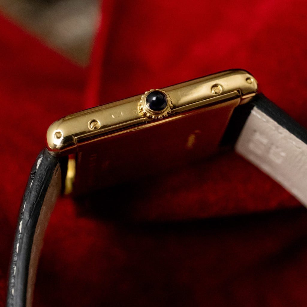 Next to diamonds, a Cartier watch is a woman's best friend. The Cartier Tank Louis is a watch that is beloved by women for decades. This elegant wristwatch has an 18k yellow-gold case and a typical white Cartier dial. It has beautiful blued-steel hands and a pointed sapphire in the crown. The watch has a manual-wound movement and dates back to the '90s. The white dial and black-painted Roman numerals have 'Paris' below the 6-hour position, which indicates that the watch was bought from the Cartier boutique in Paris.