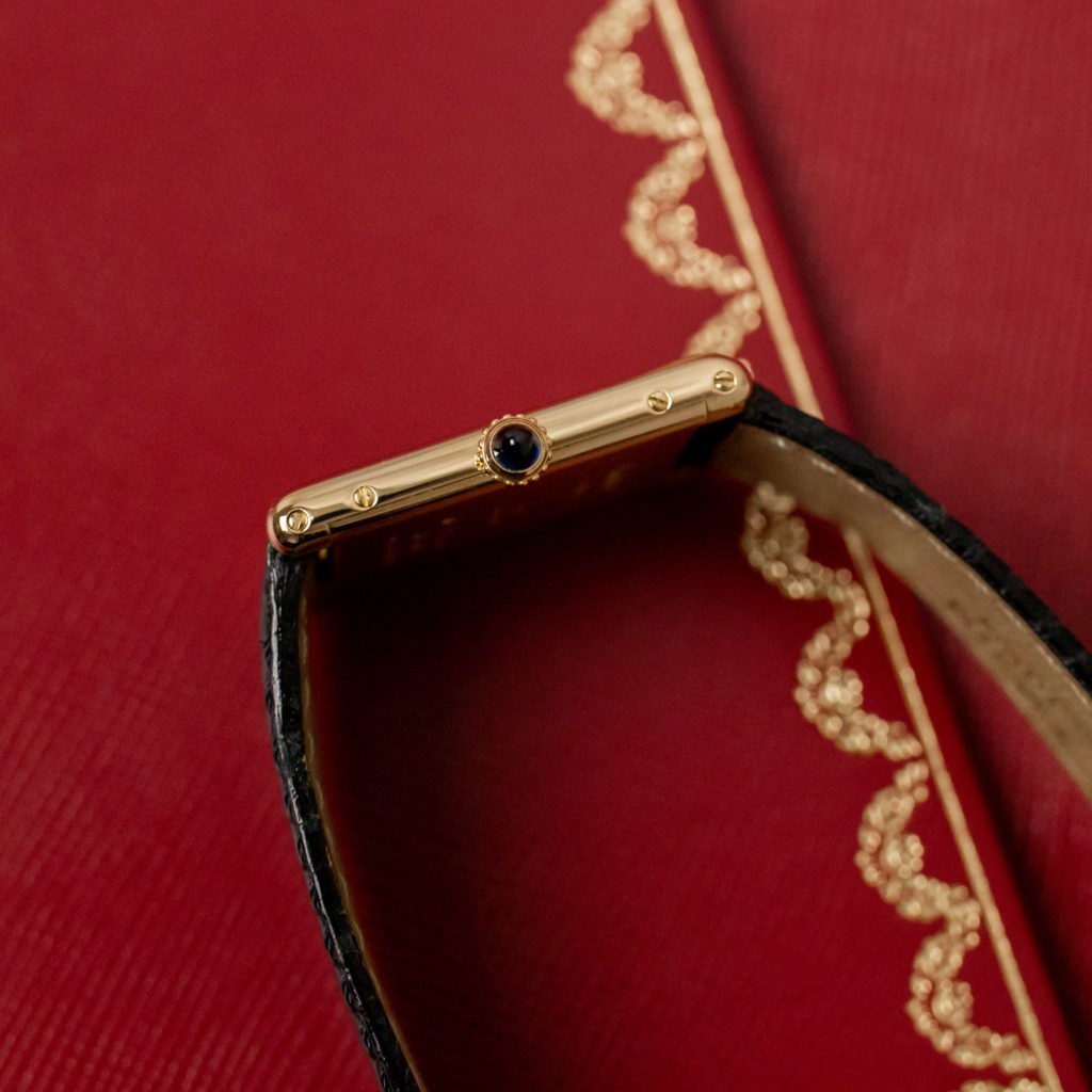 The classic Cartier Tank Louis has quickly become the best-selling watch among our female clientele and it’s not without reason. The Tank Louis is the epitome of elegance and timeless design. This 18k yellow-gold Tank Mecanique from the early 1990s runs on a hand-winding movement. Is there a more lovely way to begin the day than spending a few moments winding that beautiful sapphire-tipped crown? We especially love the ivory dial with the geometric wavy guilloché pattern. The dial sports Cartier’s well-known painted black Roman numerals, painted railroad minute track, and blue sword hands. The watch has just received a full service from Cartier’s trusty watchmakers and comes with the service papers attesting to that very fact. We’ve paired the watch with a classic black alligator-leather Cartier strap and an 18k yellow-gold Cartier ardillon buckle.