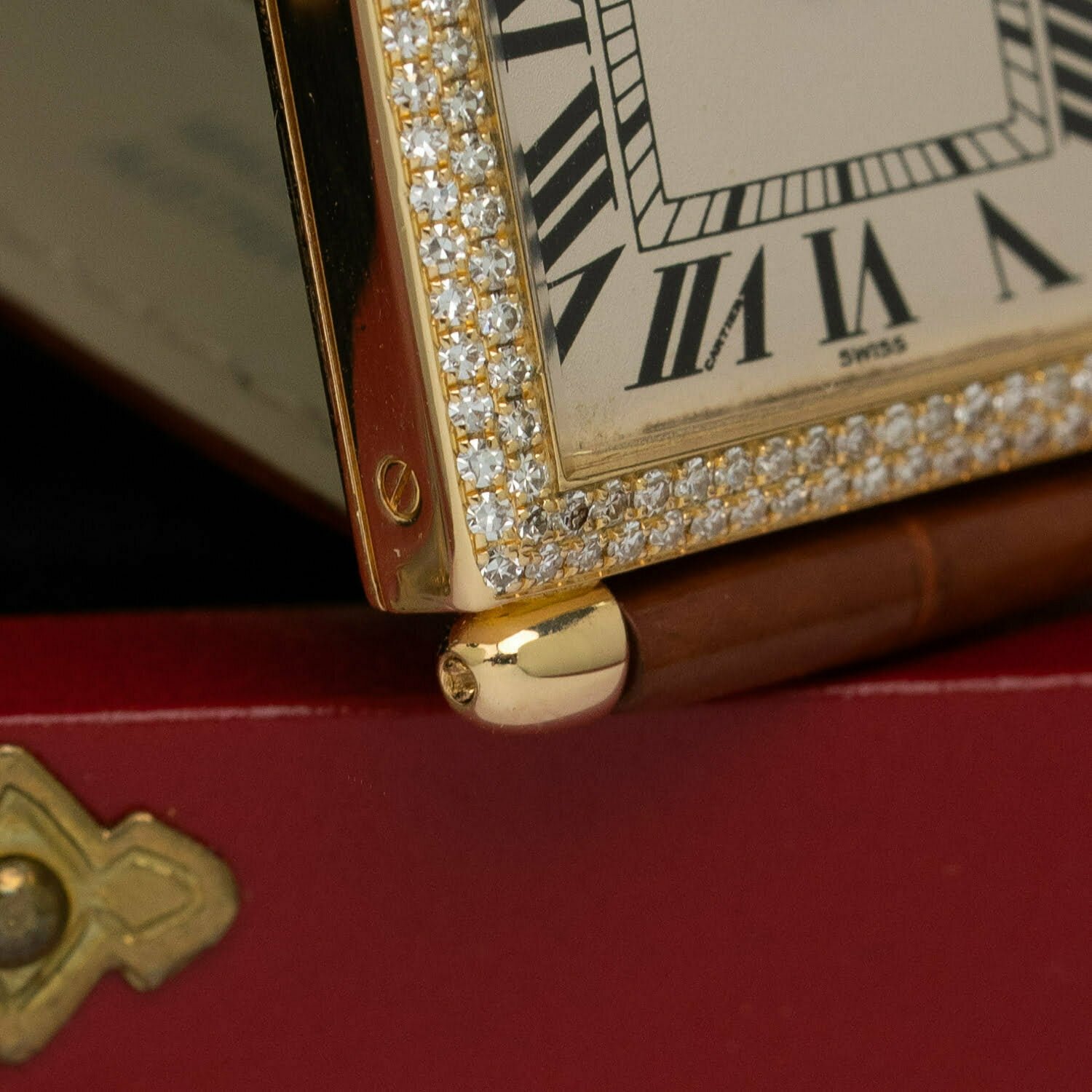 This ref. 1630 from the late 1990s/early 2000s is executed with an 18K yellow gold case that measures 24.5 x 24.5 mm (31 mm lug to lug). The bezel is factory-set with an exquisite double-row of diamonds and features a crown that is topped with a matching diamond. In true Cartier fashion, the silver-toned dial is characterized by black painted Roman numerals and elegant blued Breguet hands.