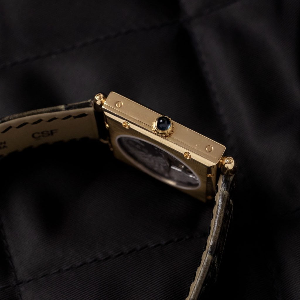 The Obus is one the very few square models in the extended Cartier Tank family. The Tank Obus was introduced in 1923 and has only been produced in extremely limited numbers since. The model stands out due to its distinct case. Unlike its rectangular cousins in the Tank family, the Obus is square with charming bullet-shaped lugs. This Tank Obus features an 18k yellow gold case, measuring in at 26.5 x 33.5 mm. The silver-toned dial is finished with exquisite guilloché engraving and features black painted Roman numerals and elegant blued Breguet hands. In true Cartier fashion, the winding crown is topped with a blue sapphire cabochon. On the underside of the watch, a display caseback gives way to the manual winding movement, with exquisitely finished plates featuring Cartier’s interlocking ‘C’ pattern. The watch comes on a grey/black alligator leather Cartier strap with an 18k yellow-gold Cartier-signed ardillon buckle. The watch has just returned from a full service at Cartier and thus also comes with service papers.