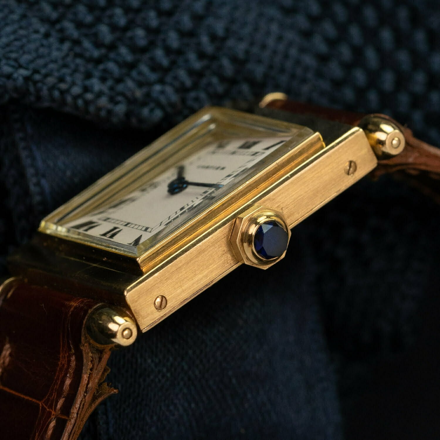 The classic white dial sports Cartier’s iconic painted Roman and elegant blued sword hands that match the faceted sapphire on the crown. The original ‘Paris’ dial is still in tact and look at that font!