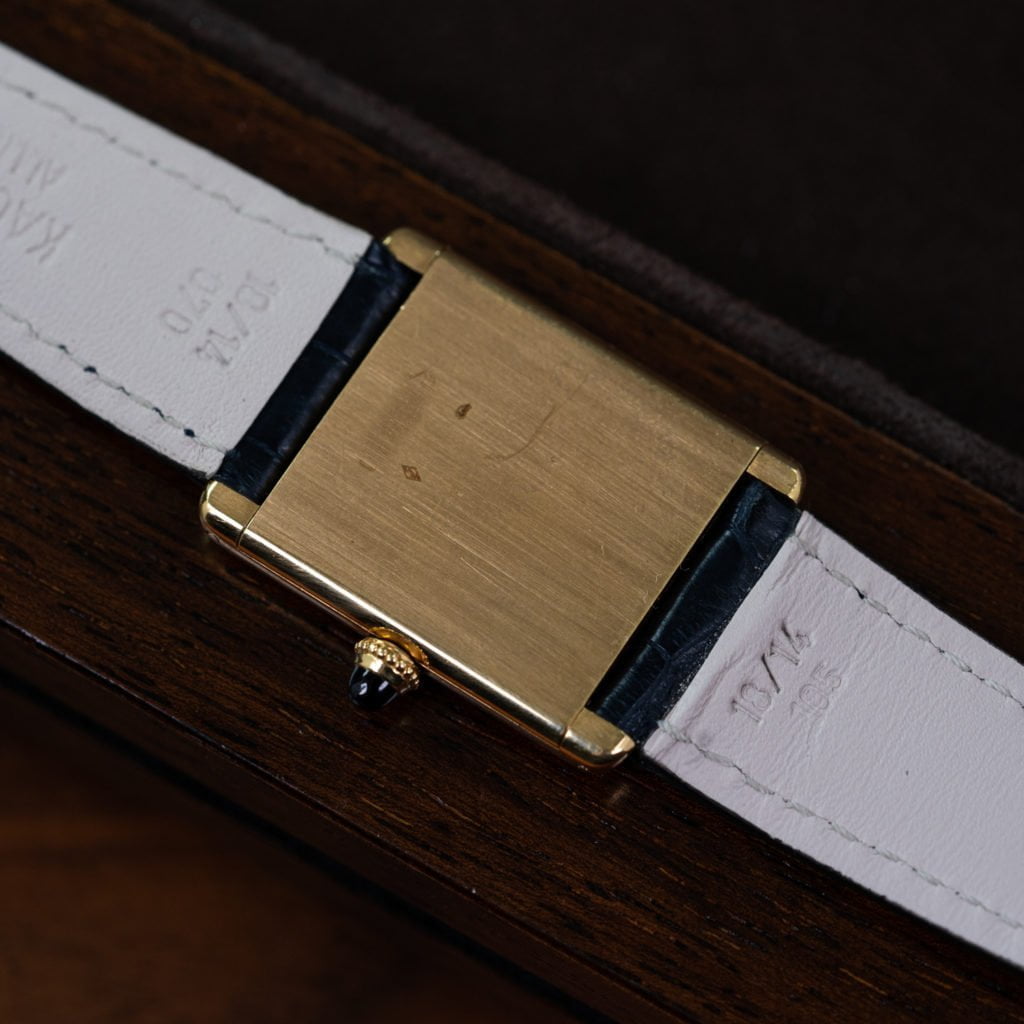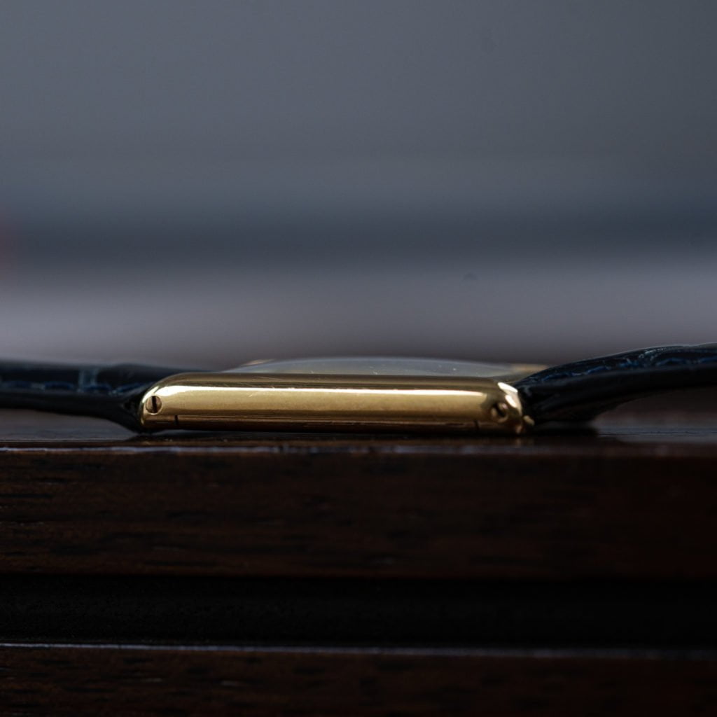 The classic Cartier Tank has quickly become the best selling watch among our female clientele as it is the epitome of elegance and timeless design. This elegant Tank dates back to the 1970s. While most executions of the Tank from the 1990s and 2000s feature a battery-driven quartz movement, this watch runs on a classic Jaeger-LeCoultre manual-wound caliber. More importantly, it is an uncommon extra thin execution, with a thickness of just 5 mm! The iconic 18k yellow gold rectangular case measures 23 mm by 30 mm. The ivory dial sports Cartier’s well-known painted black Roman numerals, painted railroad minute track, and blue sword hands. In true Cartier form, the crown is topped with a blue sapphire cabochon. We’ve paired the watch with one of our lovely navy blue alligator leather straps. To complete the package we’ve also included an extra (black) strap together with an 18k yellow gold Cartier deployant clasp if you feel like switching up your style!