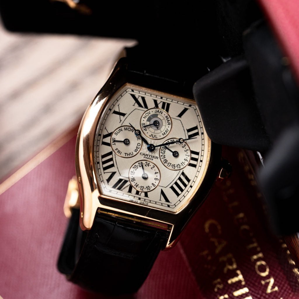 This exquisite ‘Collection Priveé’ Tortue combines one of Cartier’s most enduring and iconic designs with our favourite complication, the perpetual calendar. At its inception in 1912, the Tortue was only the third wrist watch design made by Cartier, with the Santos-Dumont and Tonneau preceding it. Much like its older siblings, the Tortue stood out from the predominantly round watches of the time due to its tortoise-shell inspired design. Despite its long history, the Tortue has only been released in small numbers over the years and is quite a rare sight. This reference 2666 is part of the illustrious Collection Priveé Cartier Paris (CPCP) and dates back to 2009. The tonneau-shaped case is executed in 18k rose-gold and measures 38 x 48 mm. The exceptional handmade dial is executed in classic Cartier style with bold painted black Roman numerals, a closed minute track at the rim, and elegant blued Breguet-style hands that match well with the iconic sapphire-tipped 18k rose-gold crown. As with all of the CPCP watches, the dial is made of 18k gold, covered with a layer that contains fine guilloché engraving and a rose motif in the centre. The dial features four centrally placed sub-registers for, starting at the top, the month indication, the date indication, a 24-hour counter, and a day indication. The uppermost counter also includes a lovely sector-style leap-year indicator to round out the ingenious perpetual calendar complication. A sapphire display case back gives a lovely view of the automatic movement, which has been expertly finished with Cartier’s interlocking ‘C’ monogram. The watch comes with the original box as well as an alligator-leather Cartier strap with an 18k rose-gold Cartier deployment clasp. To ensure that the watch keeps running accurately in perpetuity, a Cartier watch winder is included as well.