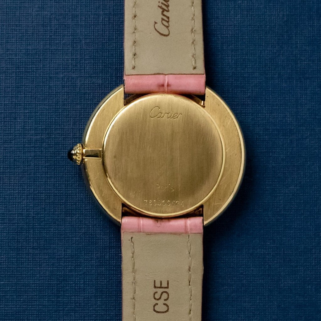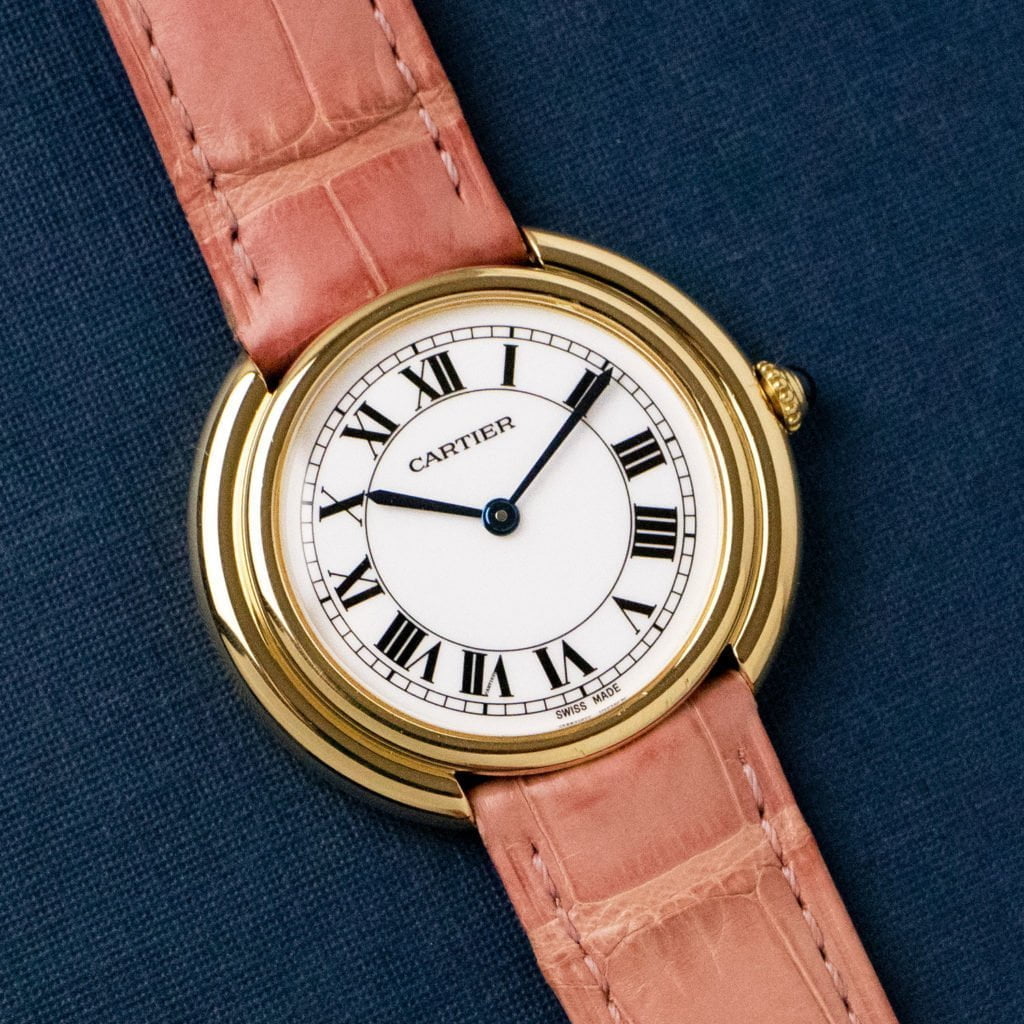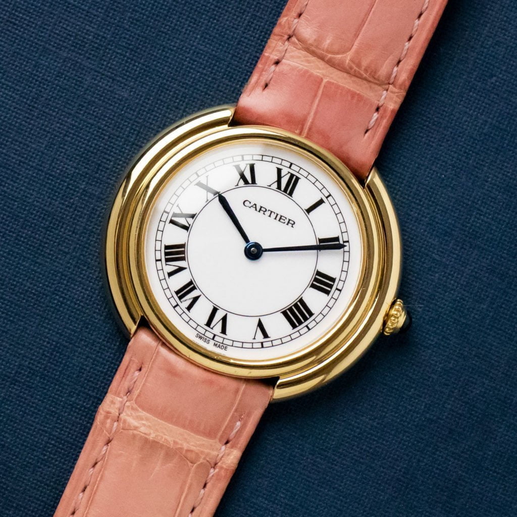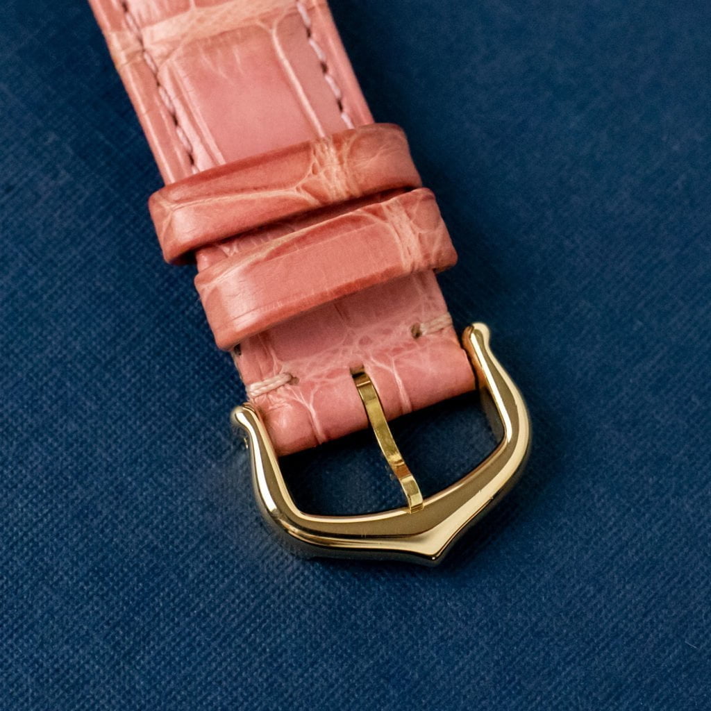 Place Vendôme is a square in the first arrondissement of Paris that attracts high society, fashion designers and celebrities worldwide. It stands for Parisian elegance and is the home for Cartier's flagship store. The Cartier Vendome covers everything that Place Vendôme stands for. It has a luxurious and very elegant appearance. The 18k yellow-gold case measures 33 mm and houses a manually wound movement. We think it's very cool that the case doesn't have extended lugs but a cutout in which the strap is fitted to the case, which contributes to the circular design of the case. It has a white dial with a black-painted Roman index, which is displayed in a very cool way. The watch is fitted to a pink, alligator-leather strap with an 18k yellow-gold Cartier buckle.