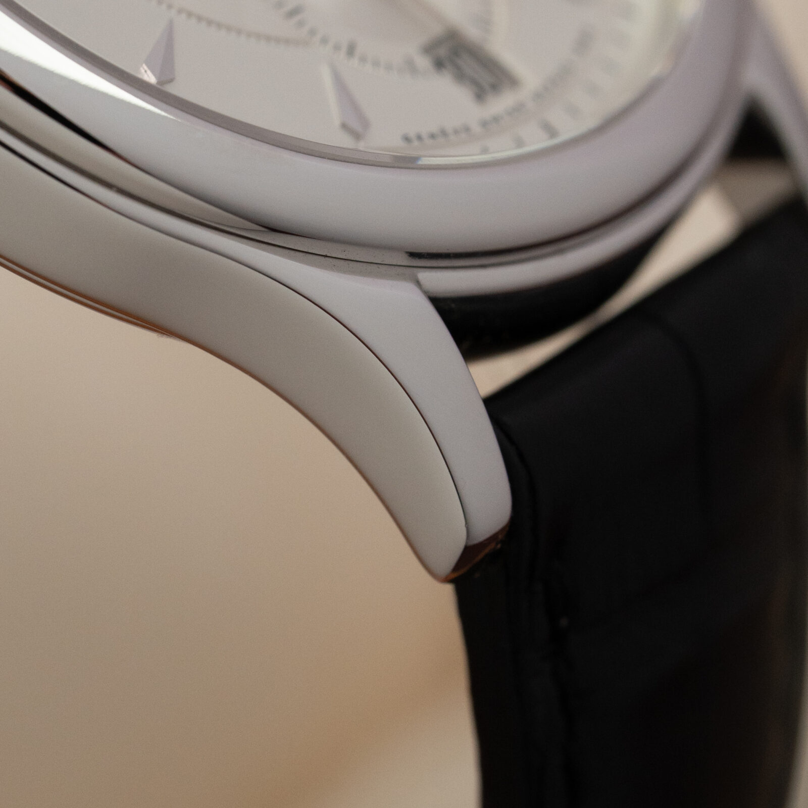 This reference 16/1860/2, produced in 1999, represents that early golden age of the reborn manufacture. The 18k white gold case measures 36.5mm across, its slim profile and polished surfaces perfectly balanced between classical restraint and modern precision. The silvered dial, crafted by Metalem, is a study in proportion: a finely guilloché center framed by a smooth chapter ring, elongated diamond-shaped indices, and sharp dauphine hands. The small seconds at six o’clock adds rhythm, while the neatly framed date window shows how understatement can coexist with practicality.