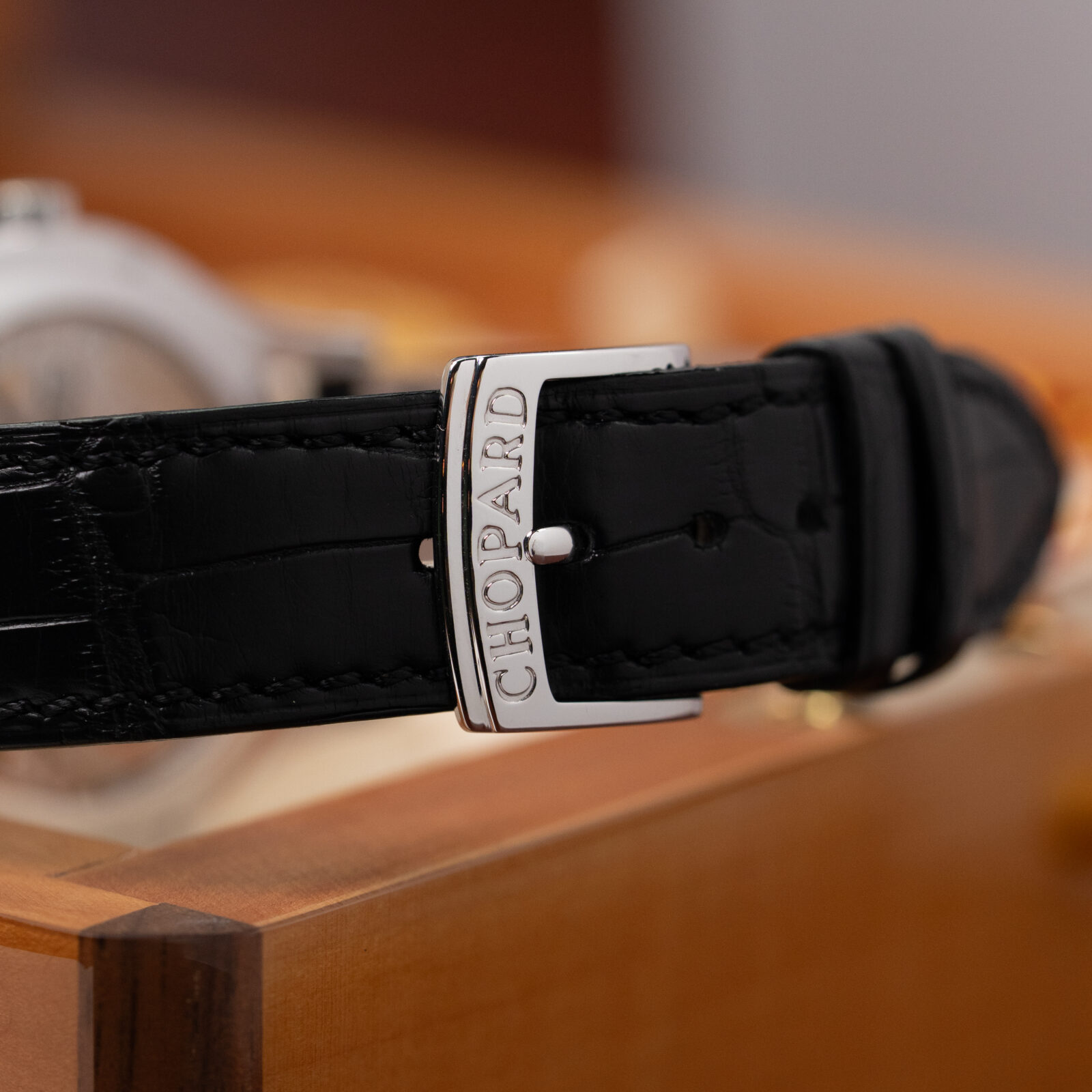 Inside beats the caliber 1.96, Chopard’s first in-house automatic movement. It’s a micro-rotor design finished to a standard few brands could match at the time; Geneva Seal certified, hand-angled bridges, and a level of decoration that puts many older maisons to shame. Visible through its sapphire caseback (or optionally, the included solid back), it’s as beautiful as it is technically sound.