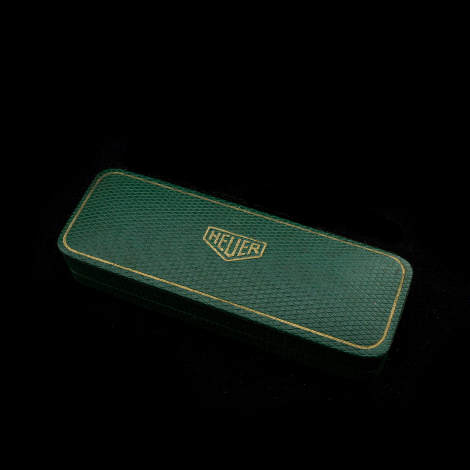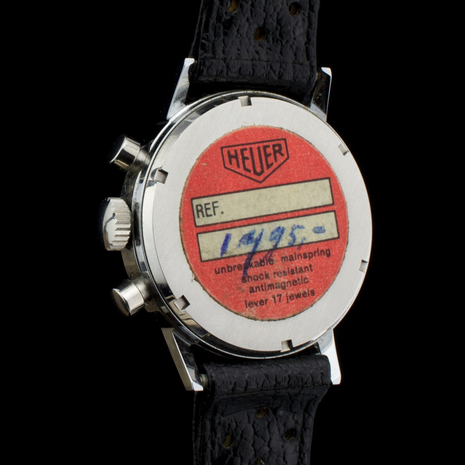Incredible sexy chronograph from the sixties in ultimate condition. Not a Carrera and thus priced in a way friendlier manner, giving you so much bang for your buck. The watch has round pushers and a screw-down casebook with the sticker still on the back. We are in love with the aging of the tritium in the hands and on the dial. The orange chronograph hand isn't bad either. Furthermore it comes with its original box and tag. The watch is running properly and is in all working order, however, due to its mint condition, we choose to not service this watch but upon request by the buyer a full revision can be arranged. This piece is one out of four never worn vintage Heuers that we offer from the collection of a gentleman Heuer fan.