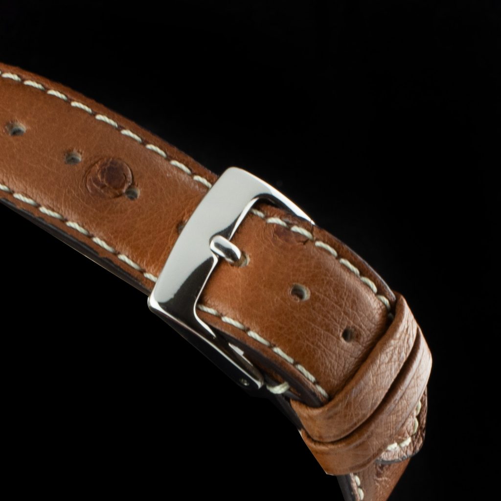Another piece of art from Jaeger LeCoultre: the Memovox. This one dates to circa 1973 and houses the caliber 916 automatic movement. The dial is impeccable, with the unusual placement of the JLC logo at the 9 o'clock position. The 37 mm steel case is in good condition and fitted on a brown genuine Ostrich leather strap. This is truly the right watch for years and years of 'wrist-pleasure'.