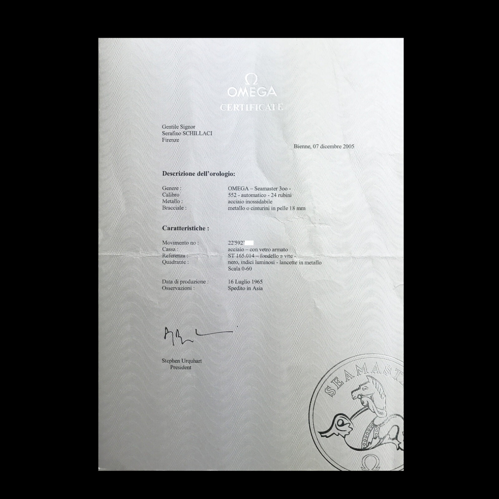 Incredibly rare and early Seamaster 300 going by the reference 165.014. This piece is preserved in an all original condition and confirmed by the extract of the archives. The watch shows a lot of character on the grainy dial with the lume turned greenish, matching the green tex strap. Furthermore the original bakelite bezel is undamaged, something that is not common.