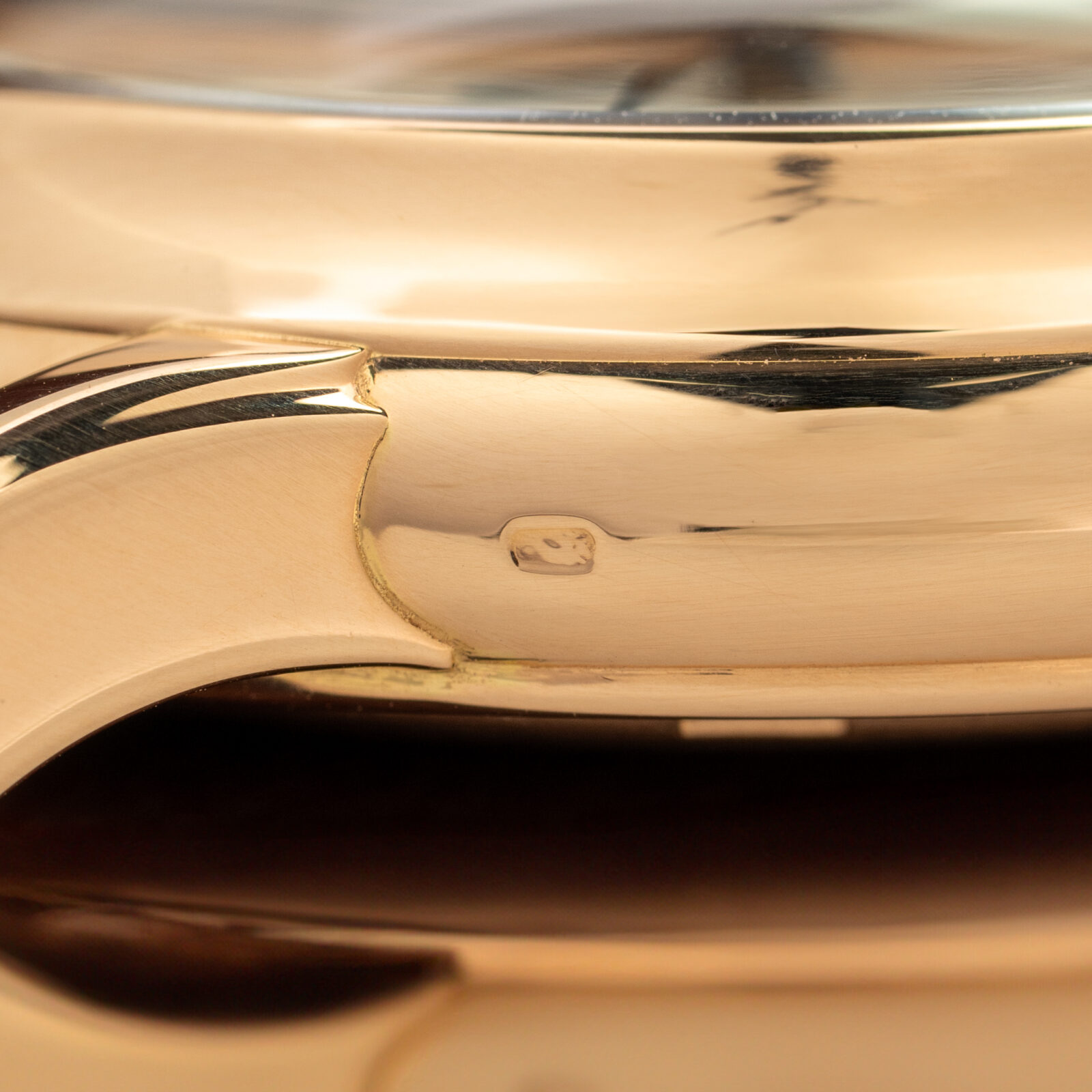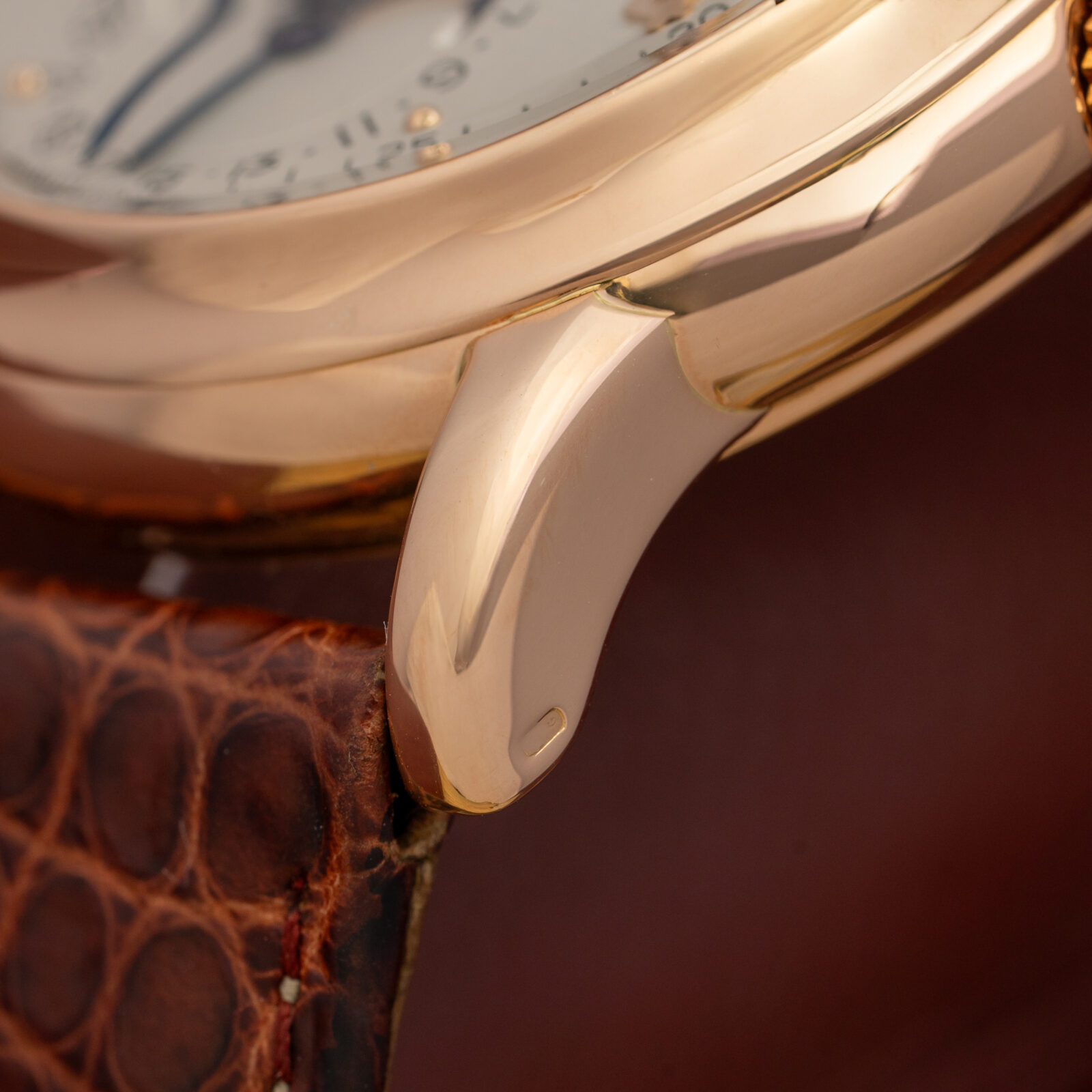 The example presented here rises above even this already rarefied circle. It is cased in pink gold; a metal reserved for only a handful of this reference. Yet it distinguishes itself further still. It is the only known first-series pink gold 2438/1 fitted with oversized Arabic numerals, complemented by blued baton hands, a configuration that imbues the watch with both strength and legibility. Most likely it mainly had to do with the latter; a unique expression, tailored for a specific client of discernment.