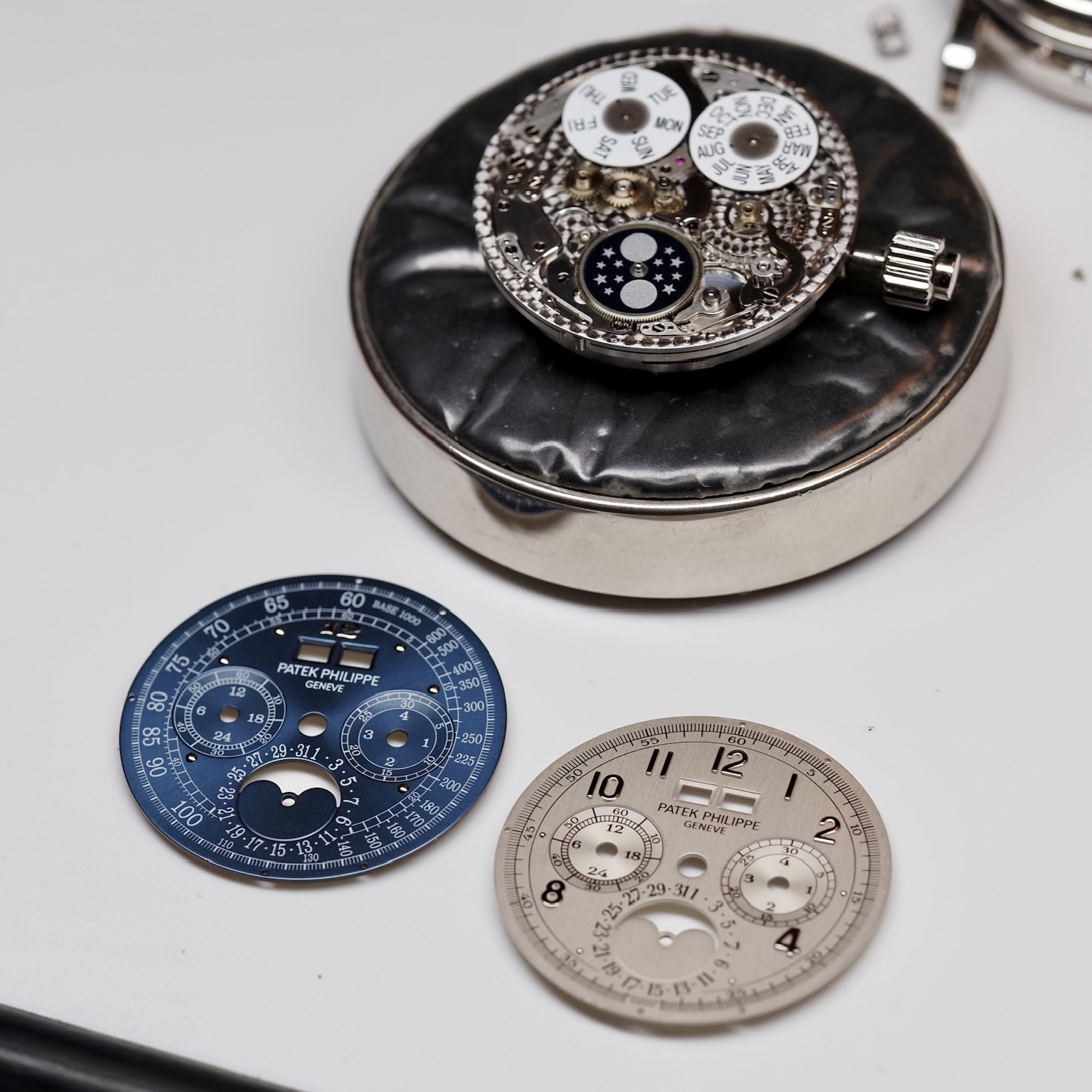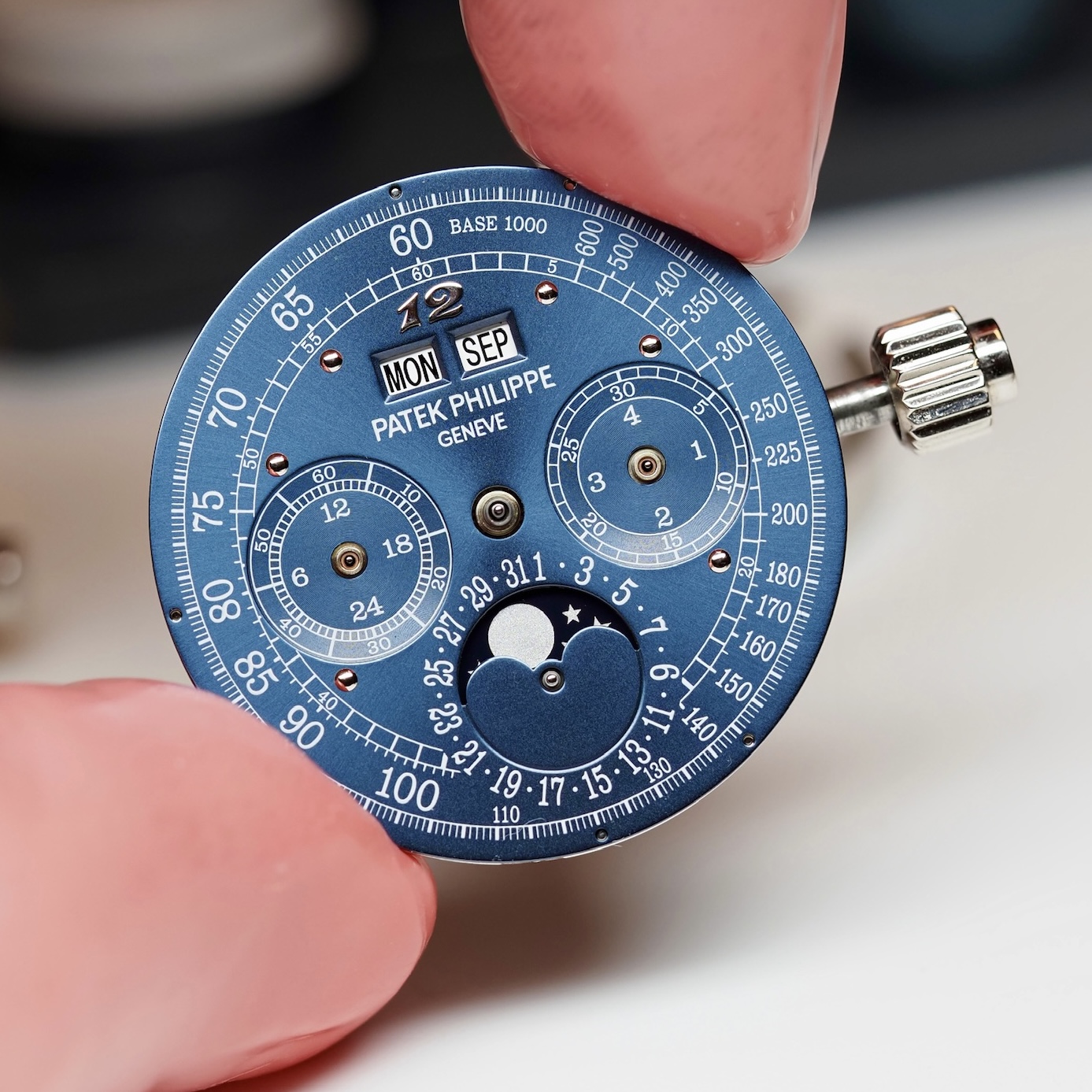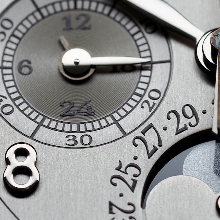 The elegant opaline dial sports applied Arabic indices and feuille (leaf) hands as a nod to the ref. 1518 and early 2499s perpetual calendar chronographs. Two apertures at the 12 o’clock position reveal the day and month mechanism. The dial features three sub-dials. The recessed sub-dial at the 9 o’clock position displays a running seconds as well as a 24-hour hand while the recessed sub-dial at the 3-hour position incorporates a 30-minute chronograph counter and a leap year indicator. Finally on the lower sub-dial we find a charming moon phase indicator, which is surrounded by a date complication.