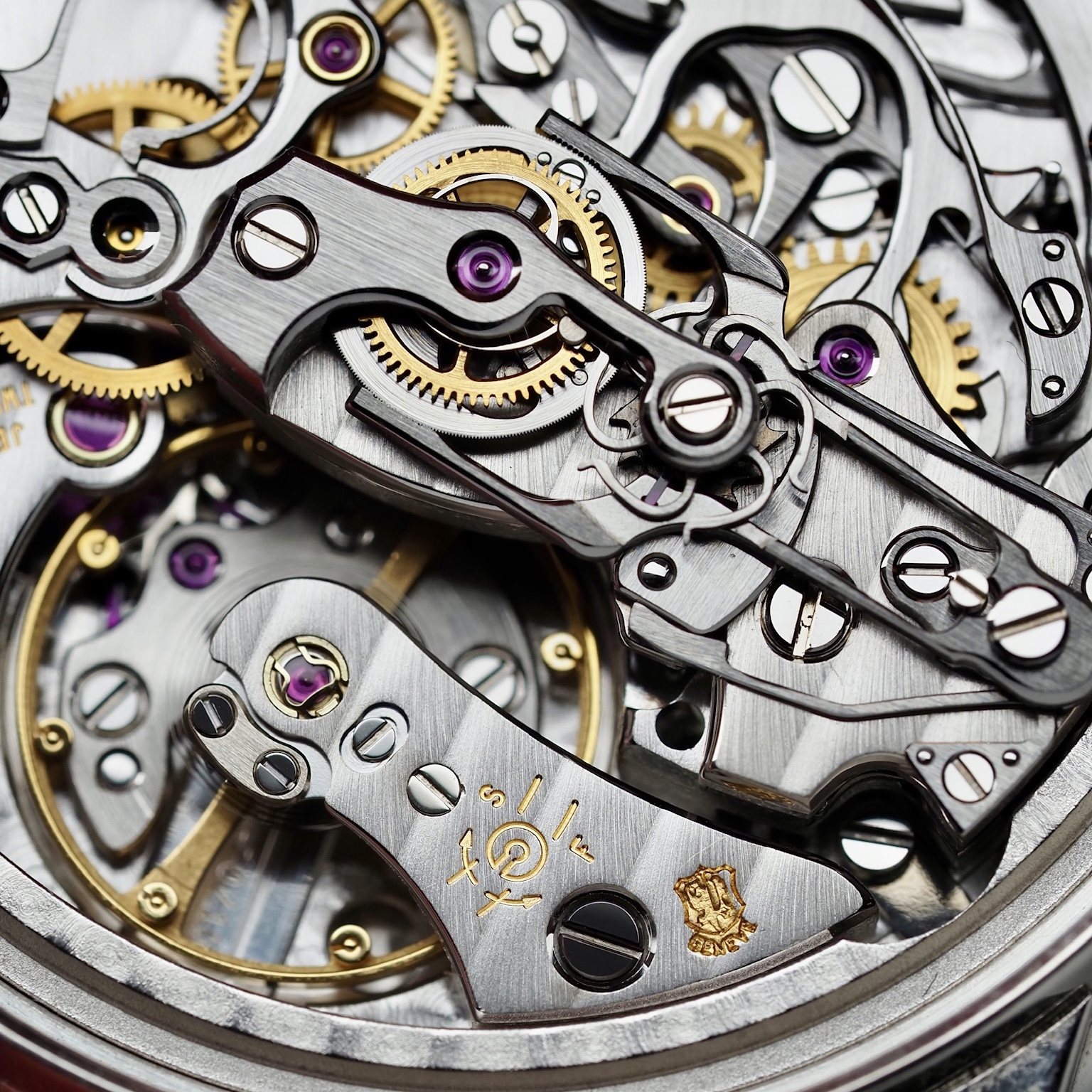 On the right hand-side of the case, the crown with integrated split-seconds button is sandwiched between two pump chronograph pushers. As the watch is turned upside down, the display case back gives way to the exquisite hand-finished in-house manual winding split-seconds caliber.