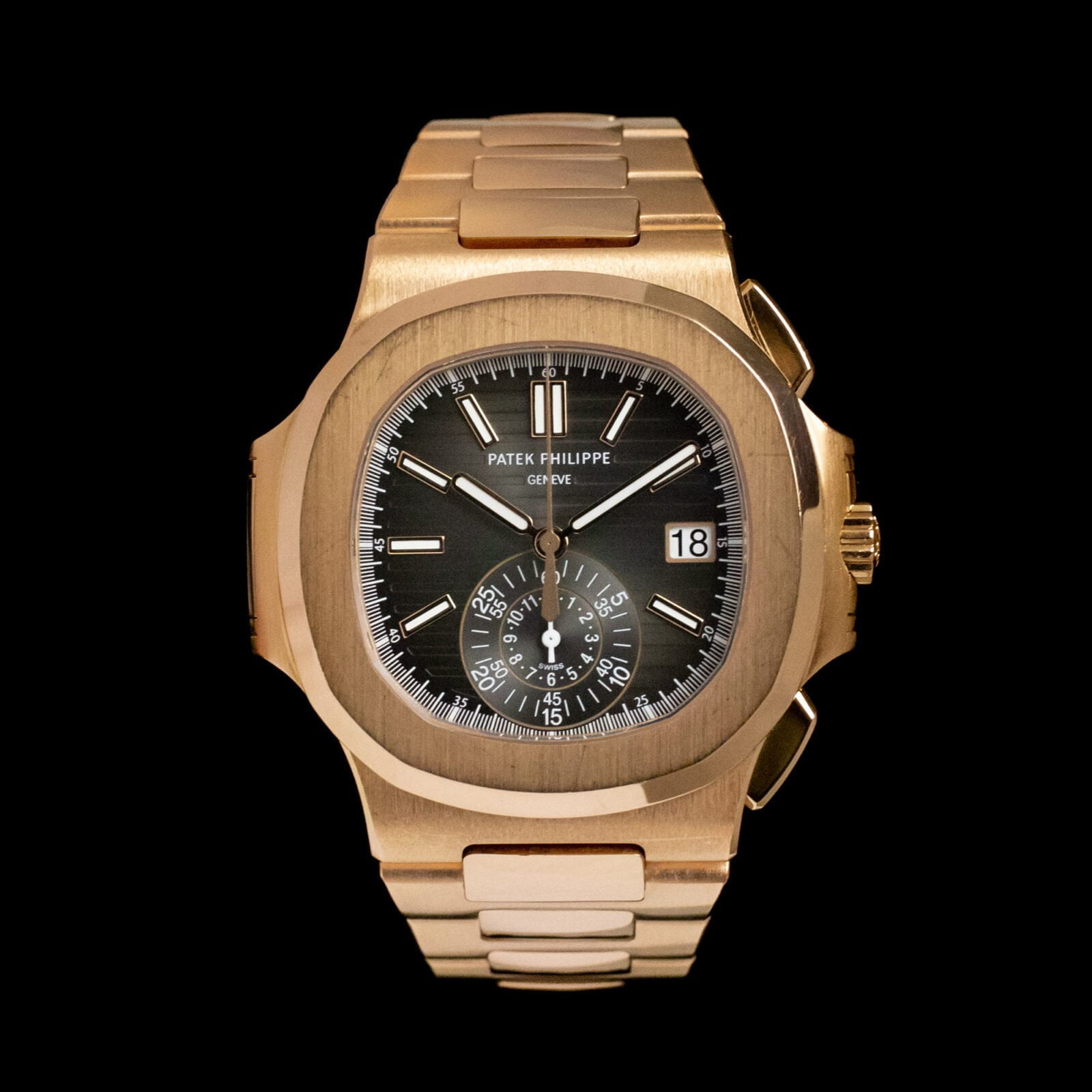 The design of the watch was inspired by the spirit of the new millenium; it has been refined and improved, yet it still has the lovely aesthetic characteristics that were once designed by the legendary Gerald Genta.The reference 5980R/1R-001 is a unique watch. It clearly distinguishes itself from other references in the Nautilus series but it remains loyal to its heritage. This Patek Philippe, with a case size of 40.5mm, has a beautiful, 18k rose-gold integrated bracelet on an 18k rose-gold case. This chronograph watch is a true piece of craftmanship, the essence of Patek Philippe's perfection. The beautiful dial color is black-brown with horizontal embossed bars and the applied hour markers are gold with a luminescent coating. The 'mono-counter' keeps track of the hours, minutes and seconds and the date is displayed at the three o'clock position. The sapphire case back will show you the sophisticated heart of this gorgeous piece. As mentioned above, the first Nautilus was introduced in 1976. This reference was introduced in 2006 and belongs to the new generation of the Nautilus series. Our example dates back to 2017 and comes as a full set.