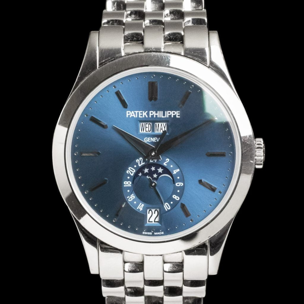 In 1996, Patek Philippe patented the annual calendar function. In 2006, the Patek Philippe Annual Calendar reference 5396 was introduced.The annual calendar function requires one adjustment per year. Namely, at the end of February as it only recognizes 30- and 31-day months. This function stands between a normal full calendar (only recognizes 31-day months) and the perpetual calendar (recognizes 28-, 30- and 31-day months and leap years).The 5396 is slightly more simple, and maybe even cooler, than a perpetual calendar. The dial displays, next to the hours, minutes and seconds, the day of the week and the month below the 12-hour position. At the 6-hour position it displays the date and above this, the moonphase encircled by a 24-hour display. The dial of this 18k whitegold watch is well proportioned because of the quiet, blue display. The dauphine hands really top it off. The watch comes on an 18k whitegold, Patek Philippe bracelet and dates back to 2012. The sapphire crystal caseback displays a marvelous work of art: Patek Philippe's caliber 324 QA LU 24H. In order to set all functions right, you first need to put the watch at 06:00 PM. After that, use the Patek Philippe tool to push the buttons on the sides of the case. Start with the upper-left one and work clockwise to set all functions.Fun fact: It's absolutely normal that, when the clock hits 12:00 AM, it approximately takes an hour for the date to change.
