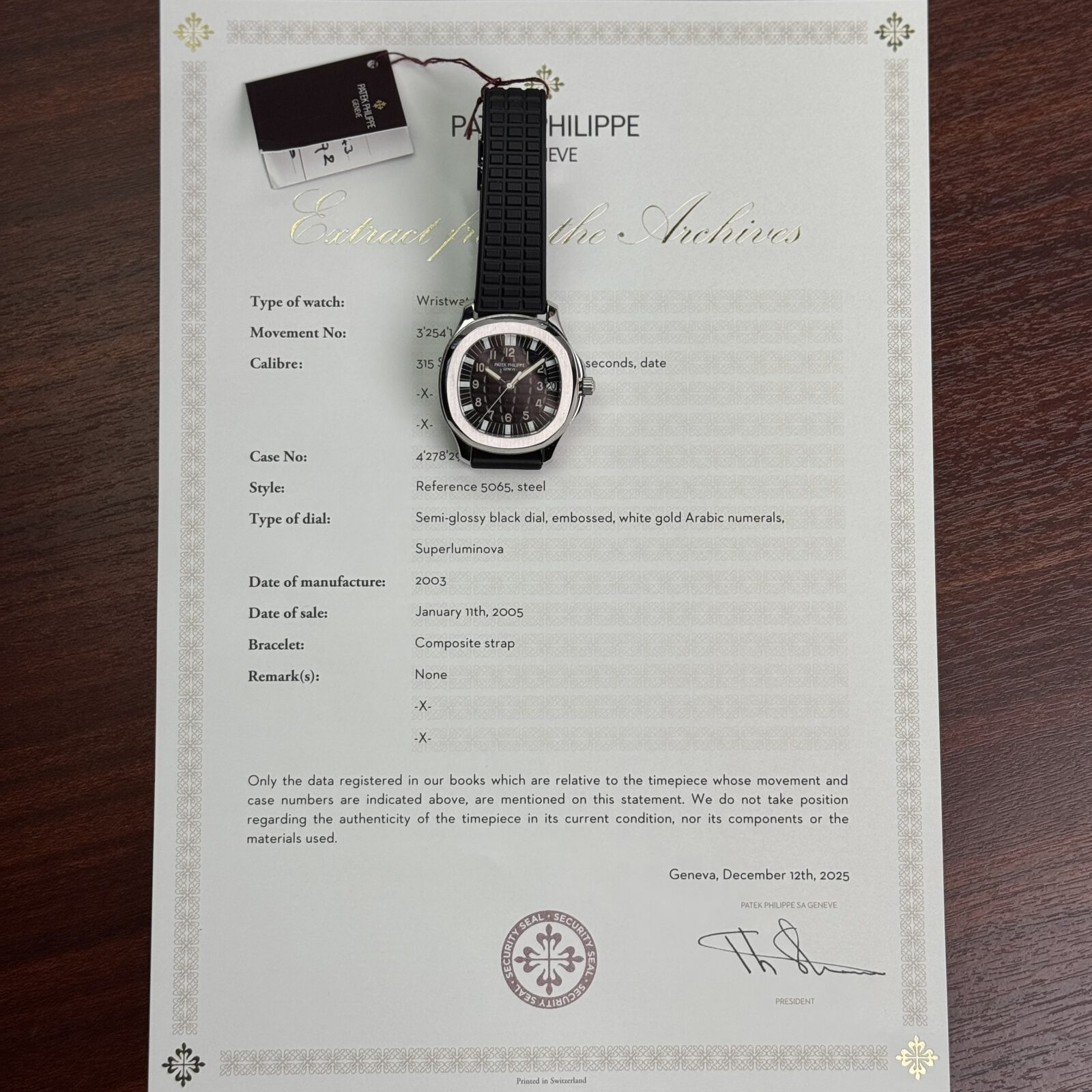This example is accompanied by its Extract from the Archives, confirming its 2005 production. The black embossed dial, inspired by the geometry of the Aquanaut case, remains crisp and legible, with luminous Arabic numerals that reinforce the watch’s functional character while maintaining the elegance expected of Patek Philippe. The automatic calibre 315 SC delivers reliability and refined finishing, visible through the exhibition caseback.