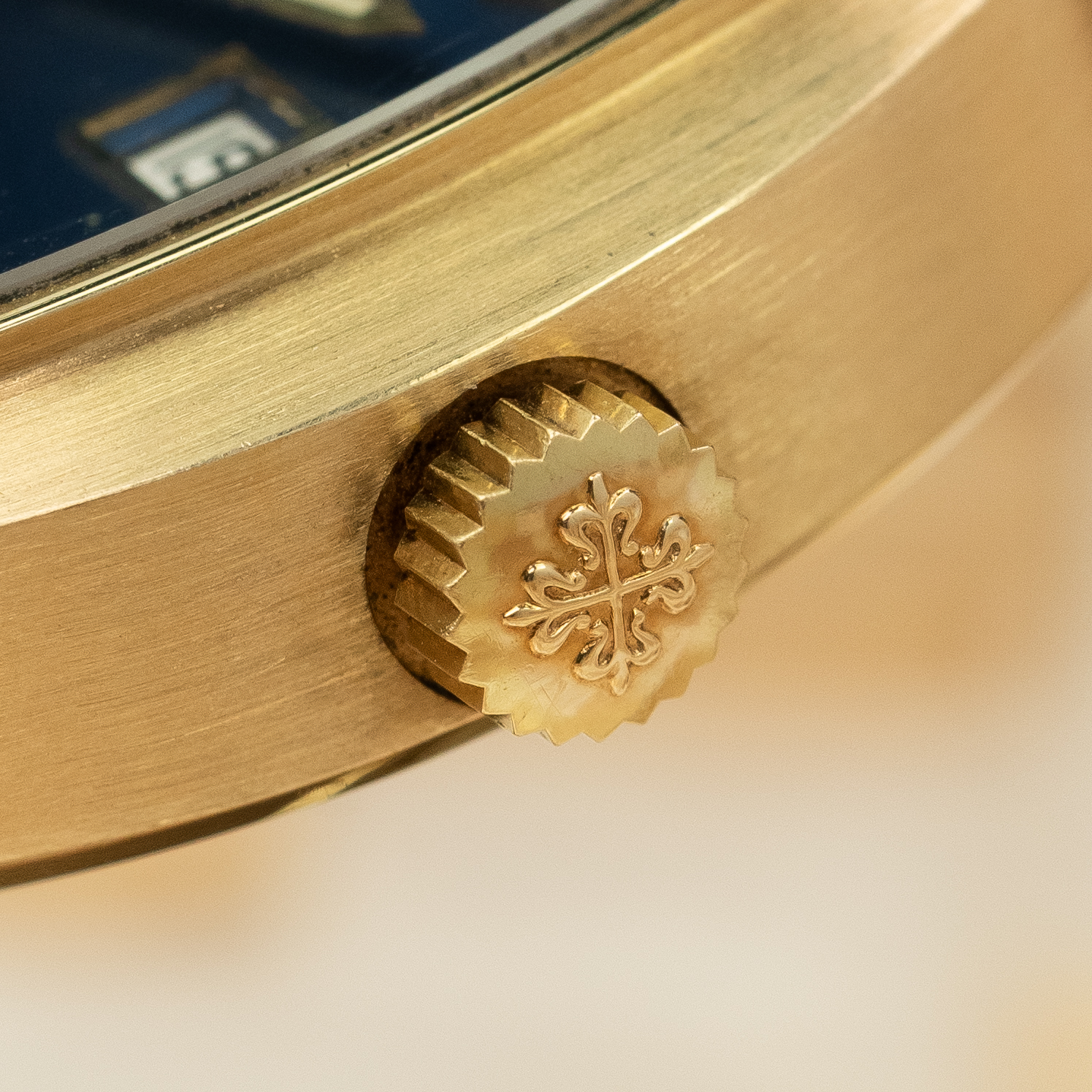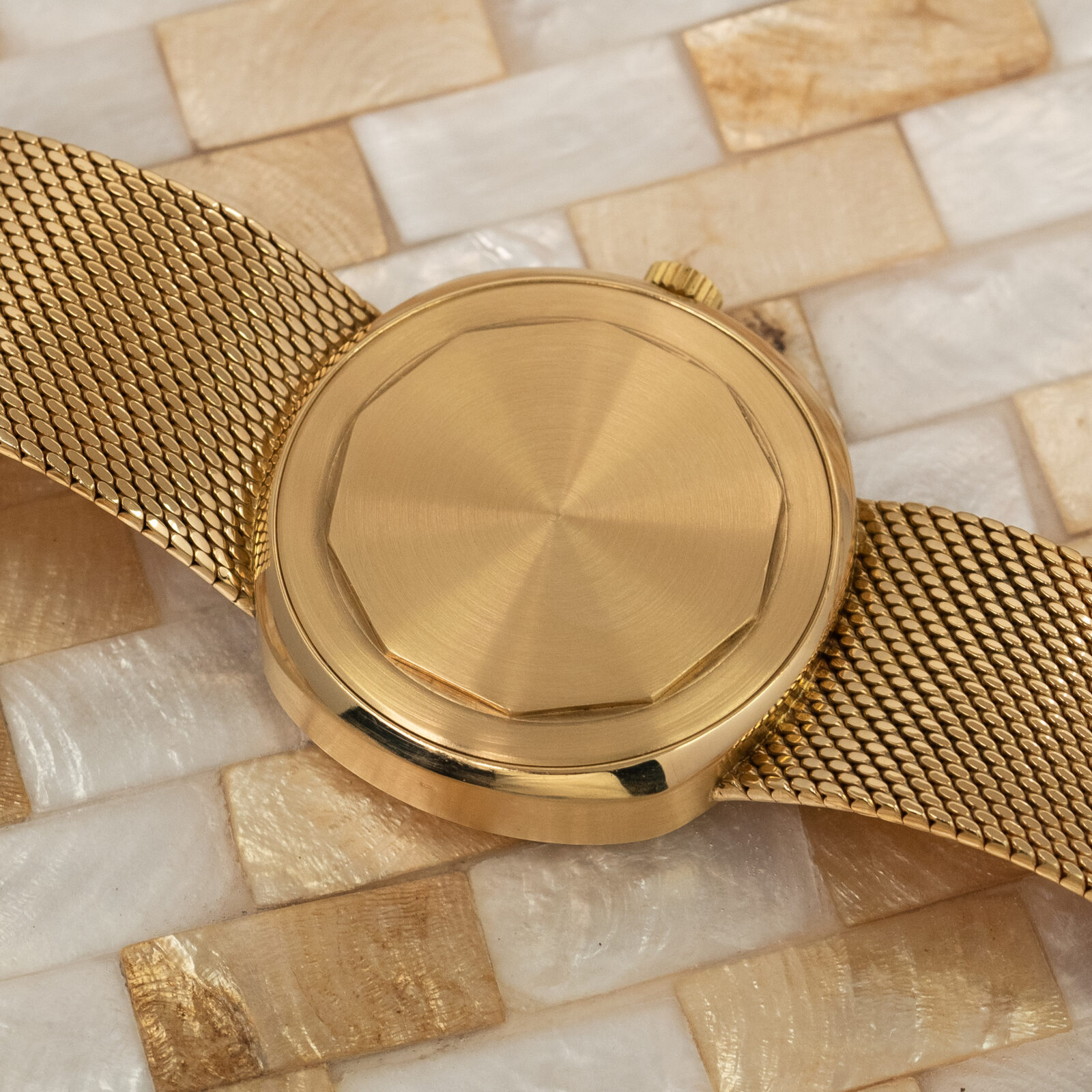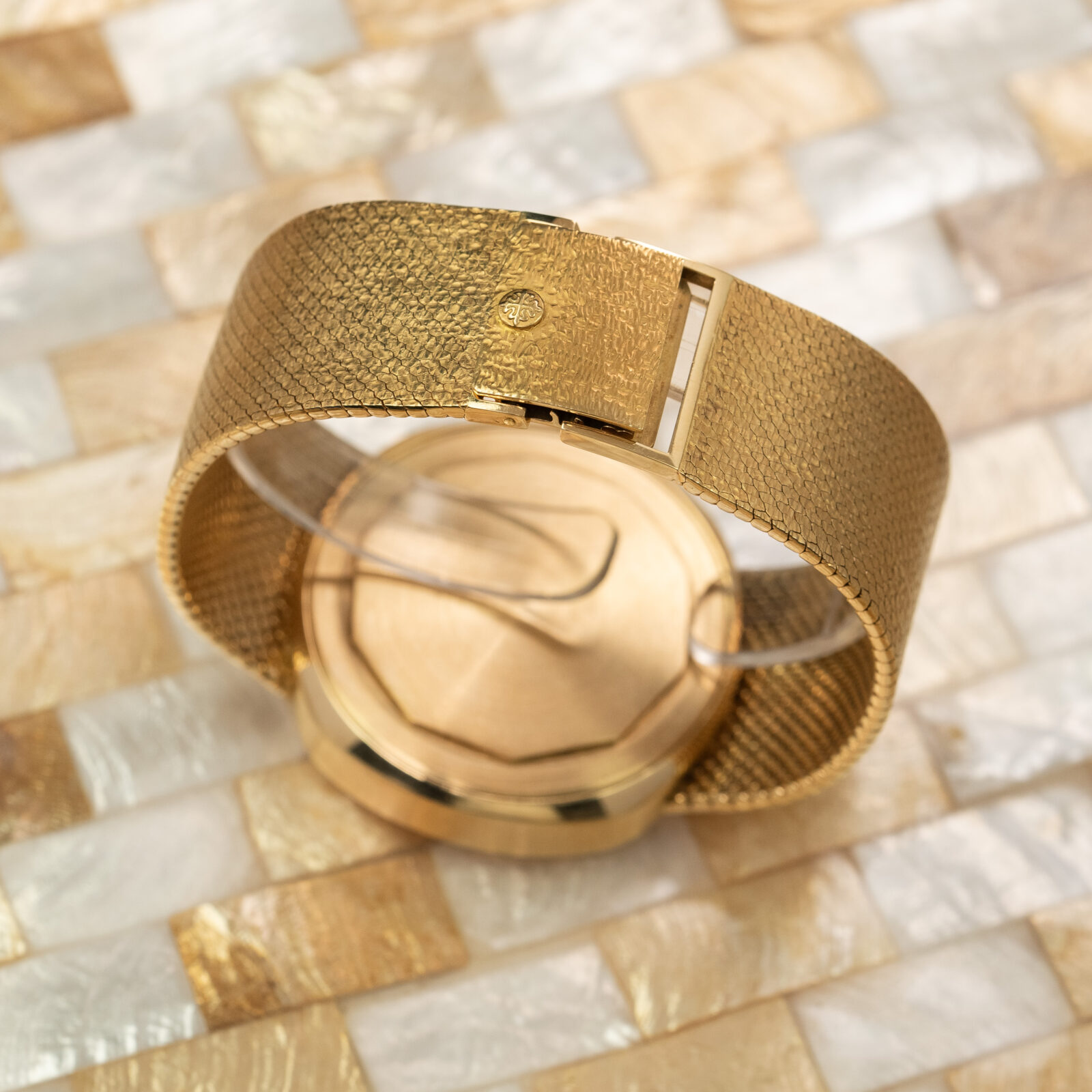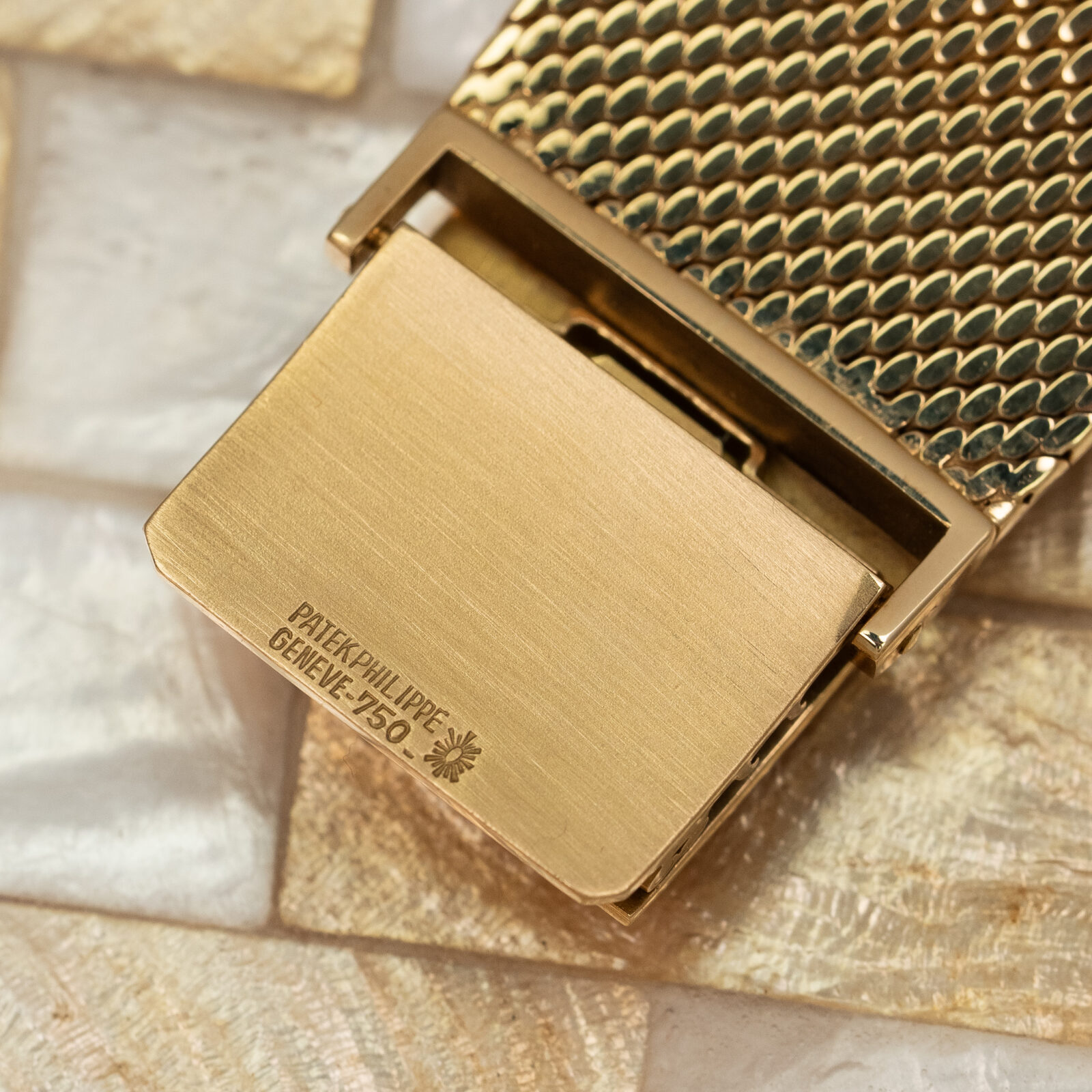 Up next is the stunning blue dial made by Stern Freres. The signature blued gold dial, which we have seen in the Ellipse, has a two-tone finish, the outer edge masked in a matte finish to highlight the green second markers. The 5-minute markers are luminescent and set in thick gold batons, the large hands are lumed as well. The date aperture is also framed in gold and under the 6 o'clock marker we find a 'SWISS' only signature. There were two other dial options available for the reference 3587, one being a gilt dial and another being the two-tone silvered dial. As you can see ours has a beautiful 'mesh' integrated bracelet hence the reference 3587/1 and the 3587/2 has the thick ‘holed’ bracelet. Interestingly, these bracelets were made by Pforzheim in Germany for Patek Philippe.