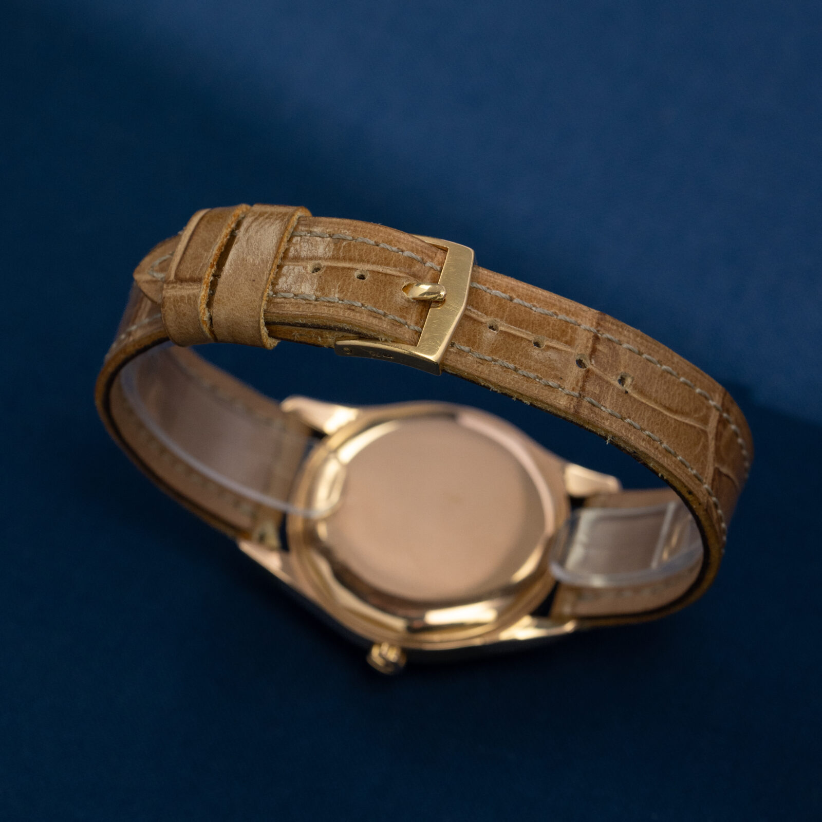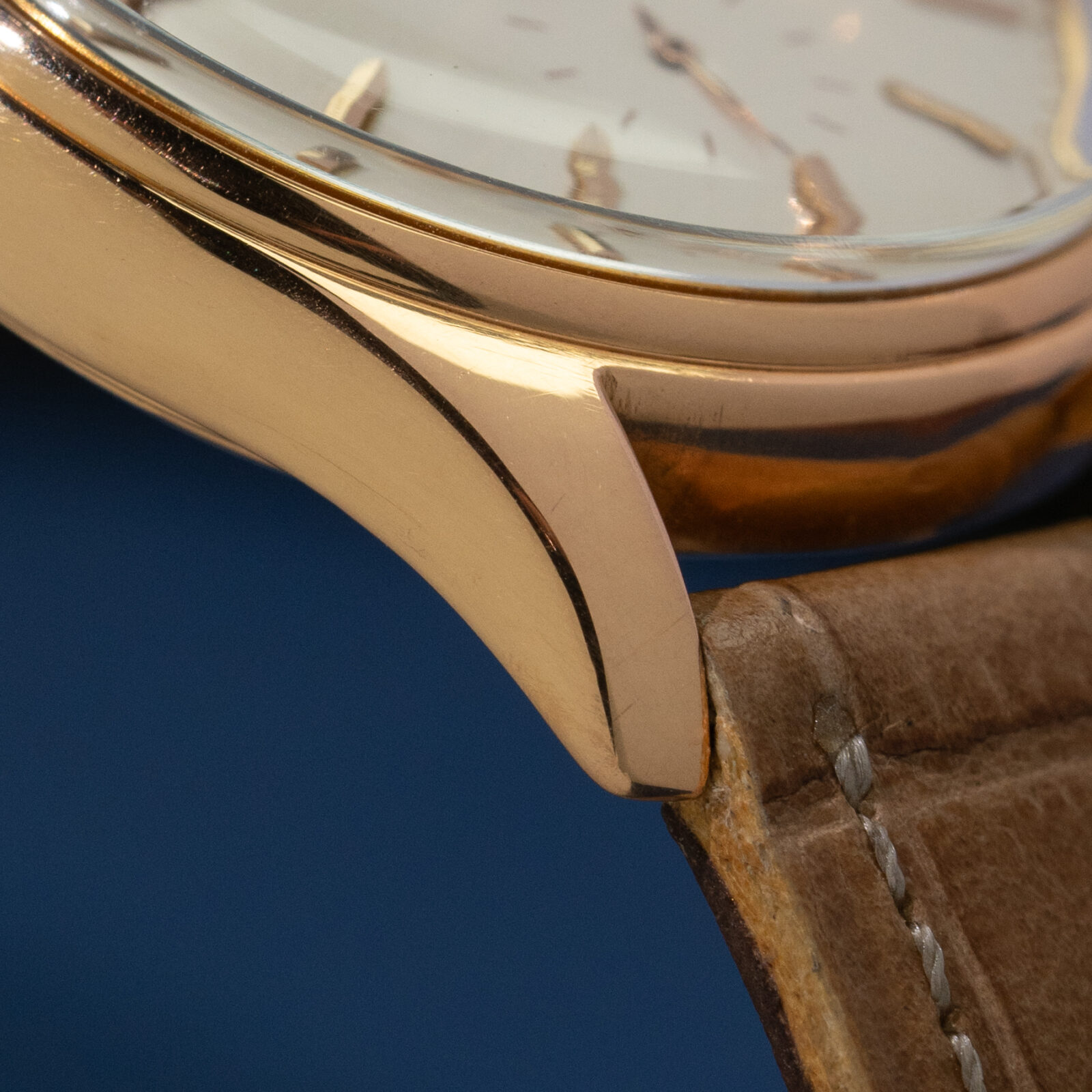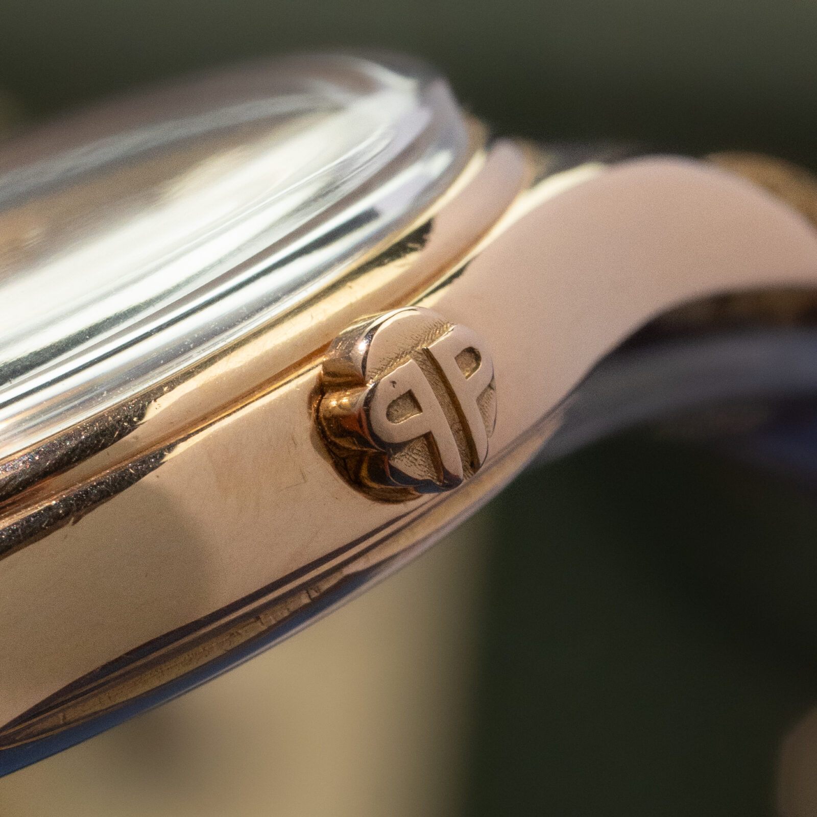 Let’s start with the case, created by Genevan master F. Baumgartner. It comes in at 36mm and has a slightly amorphous shape. It’s quite thick and unlike most previous Calatrava’s, it features a screw-back rather than a snap-back, making the watch somewhat waterproof. Adding to the sportiness, a small domed bezel is mounted on the case. Although it has quite fat lugs, the overall design remains stylish and elegant since it's pretty straight-forward. Our specimen is executed in 18K pink gold, around ten times rarer than the yellow gold variants. Moreover it remains in a strong shape. Details do matter, especially when it’s as cool as this crown. All Pateks with this caliber are fitted with the “Double P” signed crown. Whilst not unique to the 2526, it is something that definitely catches the eye. The sizing is spot on and the detail is eminent.