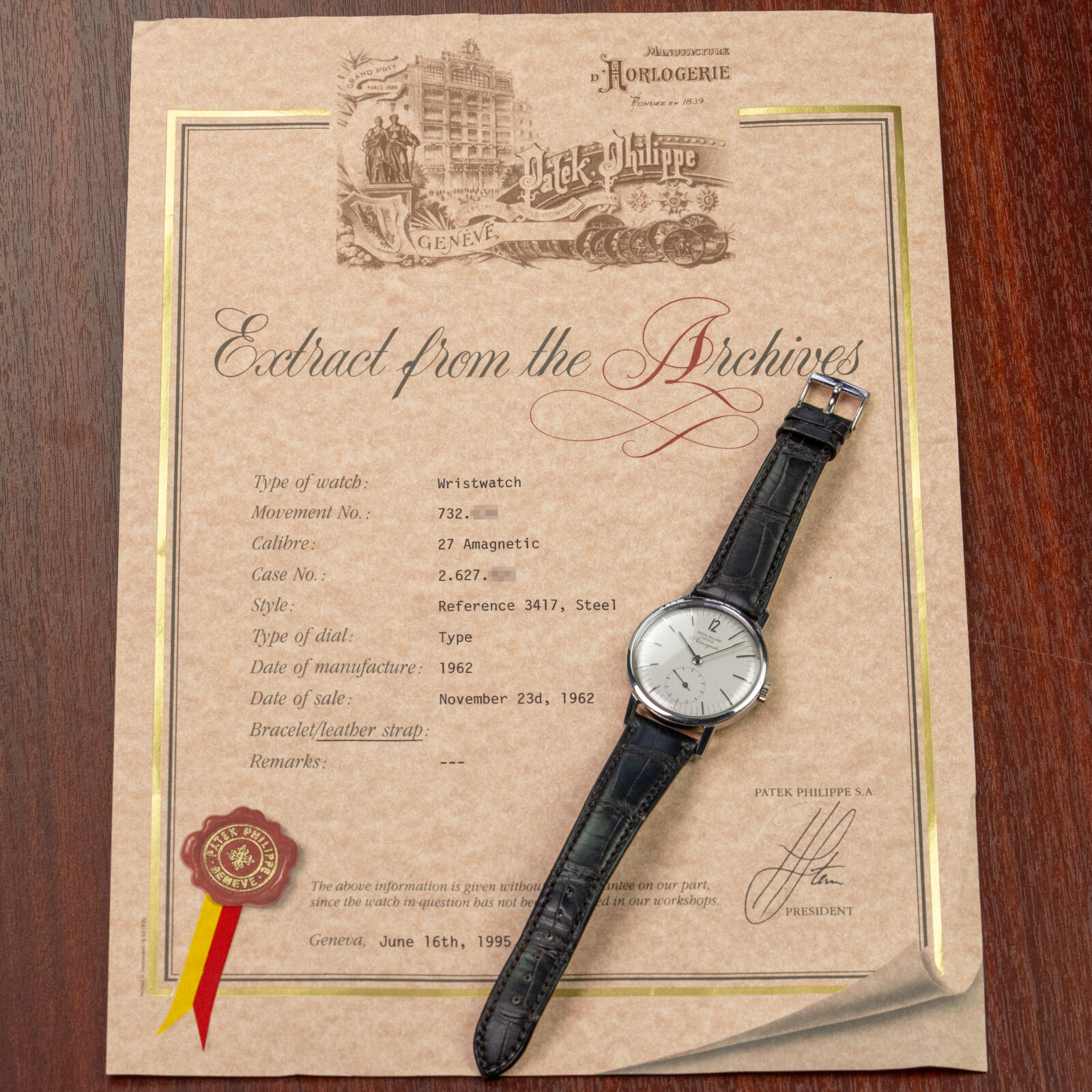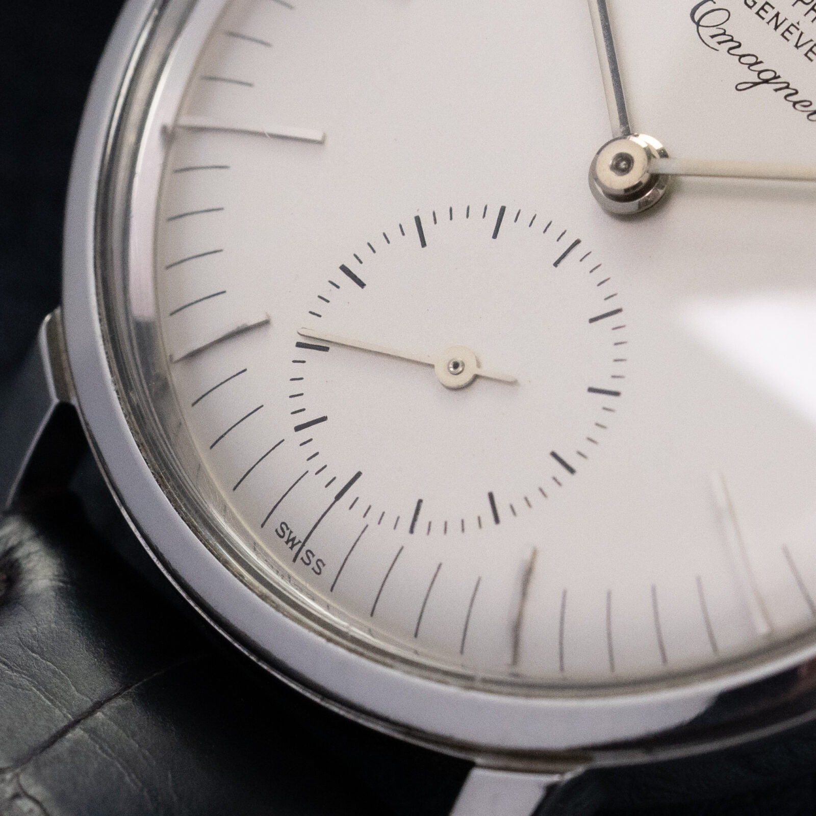 We are very happy to have this very strong example from the 4th series. It retains a sharp case and clean dial. According to the vintage extract it dates back to 1962. It comes on a dark Patek Philippe crocodile strap and has the original buckle.